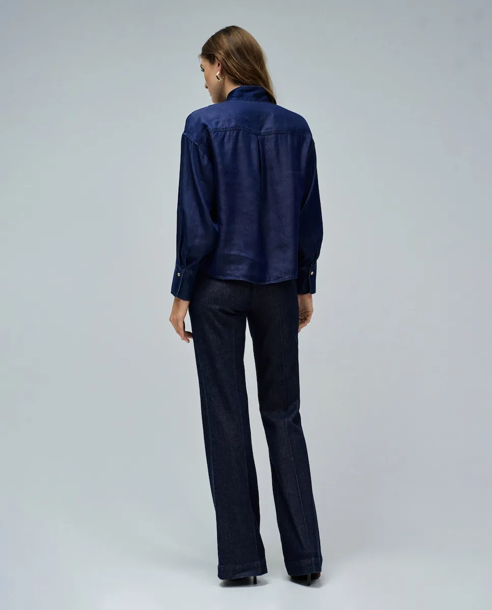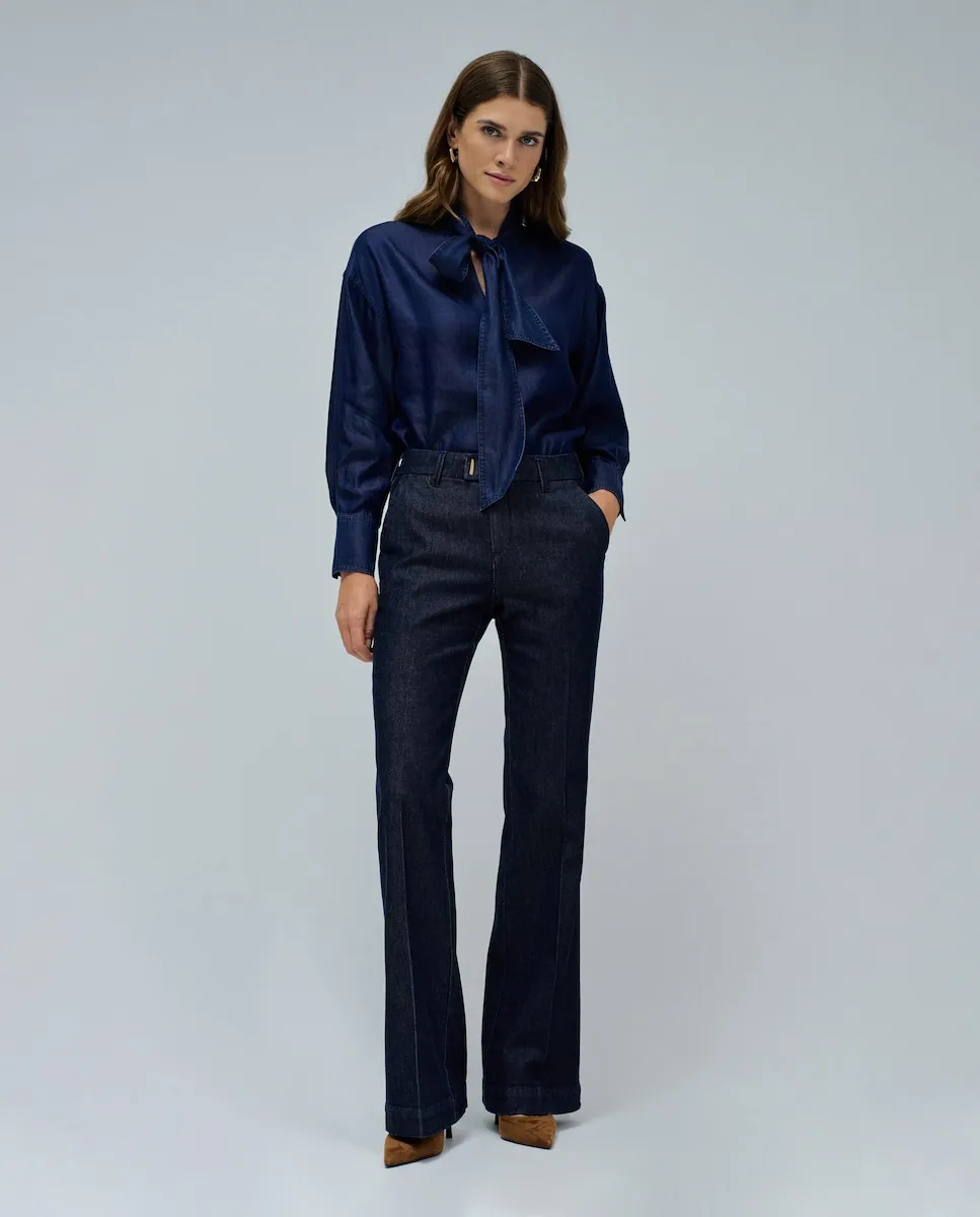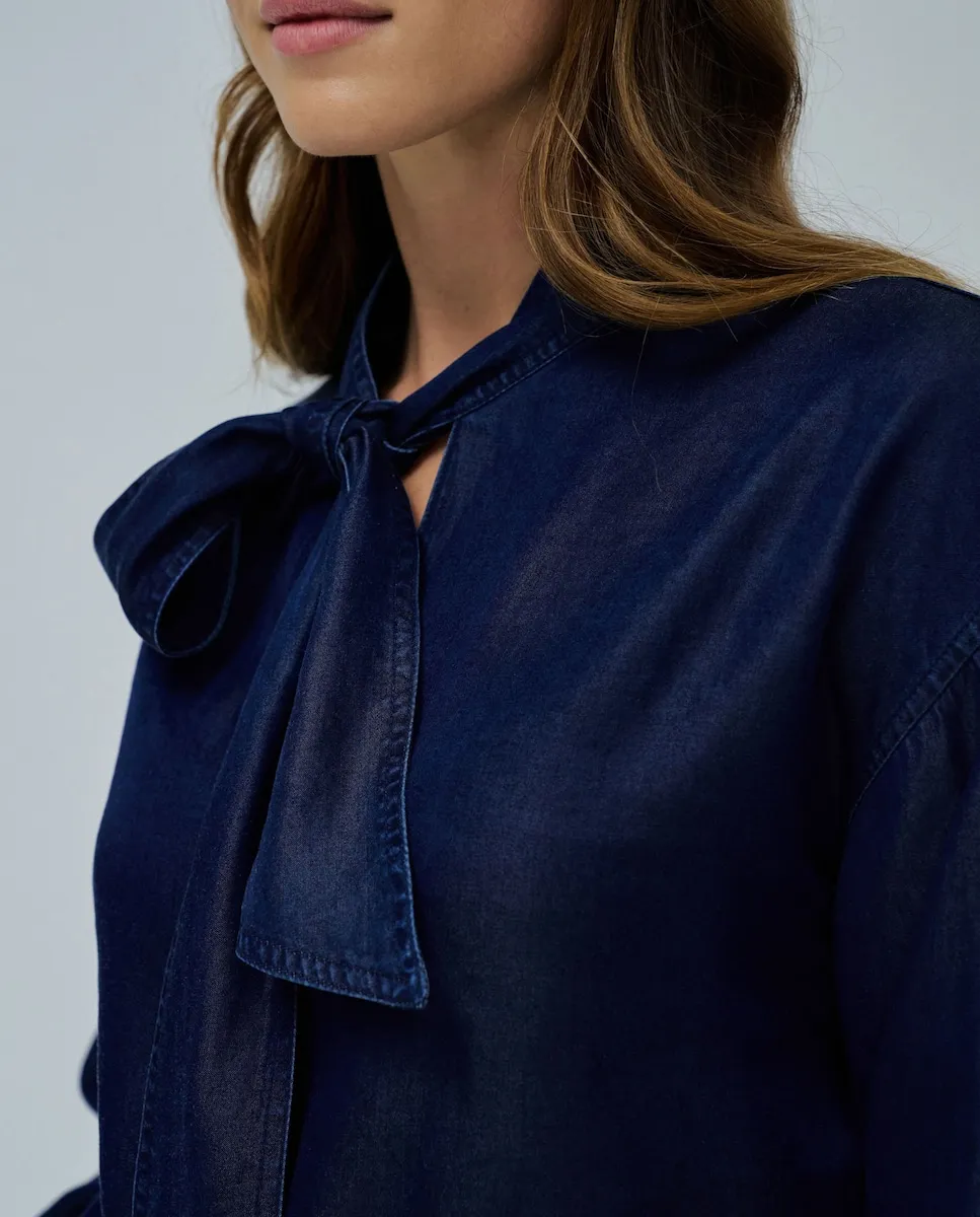 С идеальным балансом между классическим и современным стилем, эта блузка из светлого денима выделяется благодаря банту на шее - деликатной детали, которая добавляет образу утонченности. V-образный вырез смягчает силуэт, а пышные рукава с застегивающимися на пуговицы манжетами создают элегантный объем. Прямой крой обеспечивает комфорт и структуру, делая блузку легкой для сочетания как с деловой, так и с более повседневной одеждой. Идеальна для возвращения в город, будь то рабочий день или вечерняя встреча, эта блузка соответствует ритму сезона стильно и легко. . Блузка из светлого денима с бантом . Цвет темно-синий . Прямой крой . Пышные рукава с застегивающимися на пуговицы манжетами . V-образный вырез . Для справки: рост модели 1,75 м, на ней размер S.
