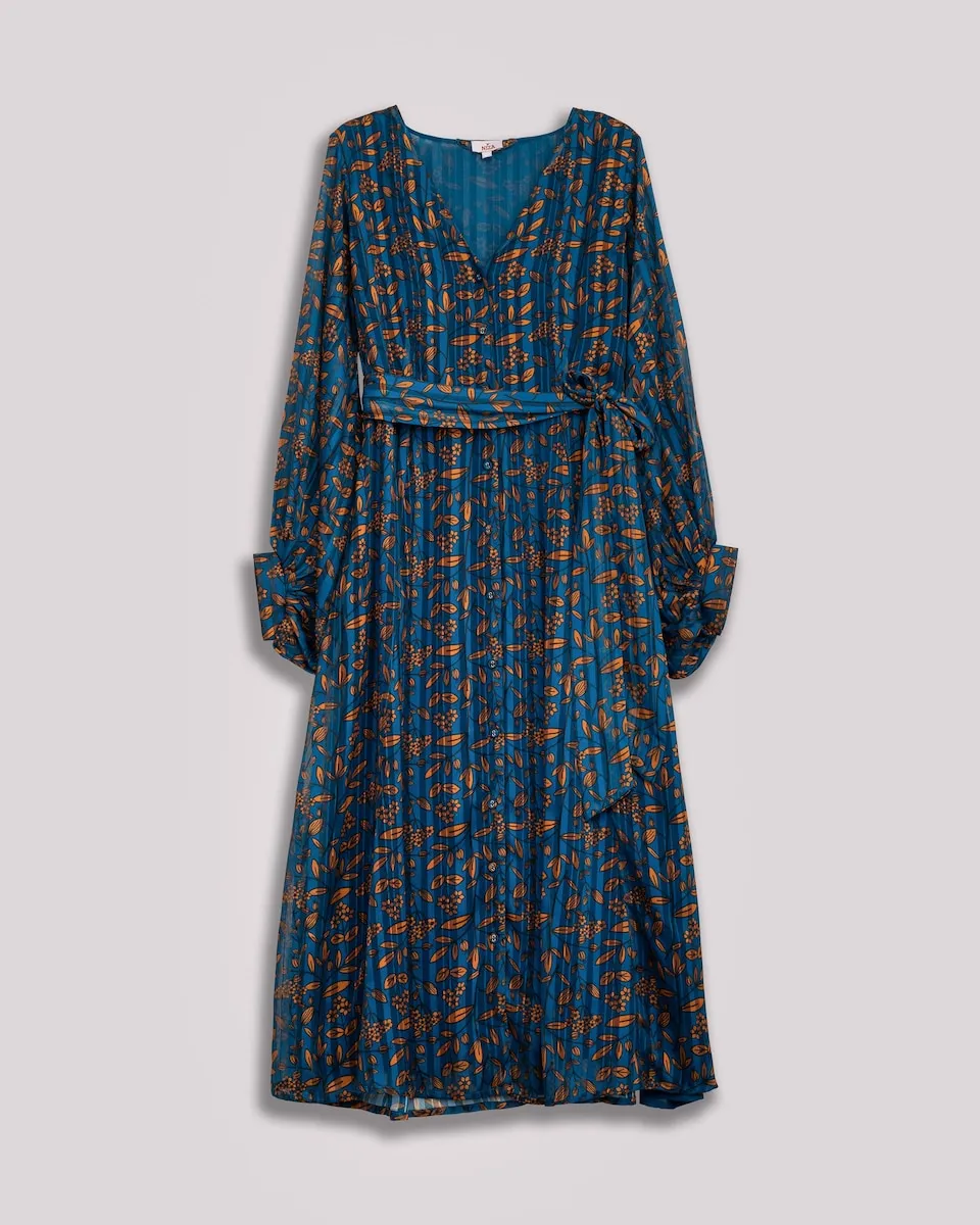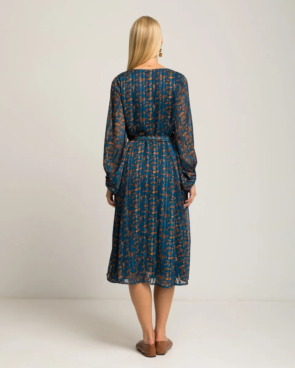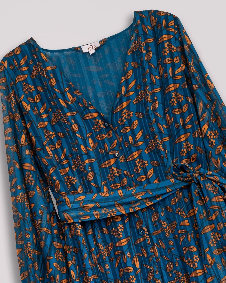 Это миди-платье выделяется своим цветочным узором медных тонов на фоне ночного синего, с ненавязчивым блеском фольги, который деликатно ловит свет. Идеально подходит, чтобы сопровождать вас в любом мероприятии со стилем и индивидуальностью.