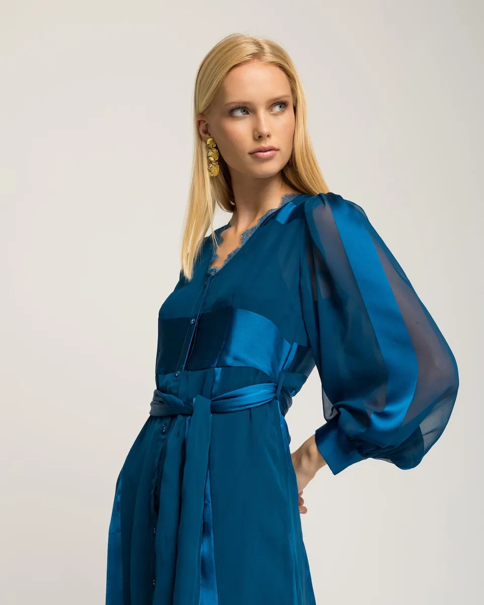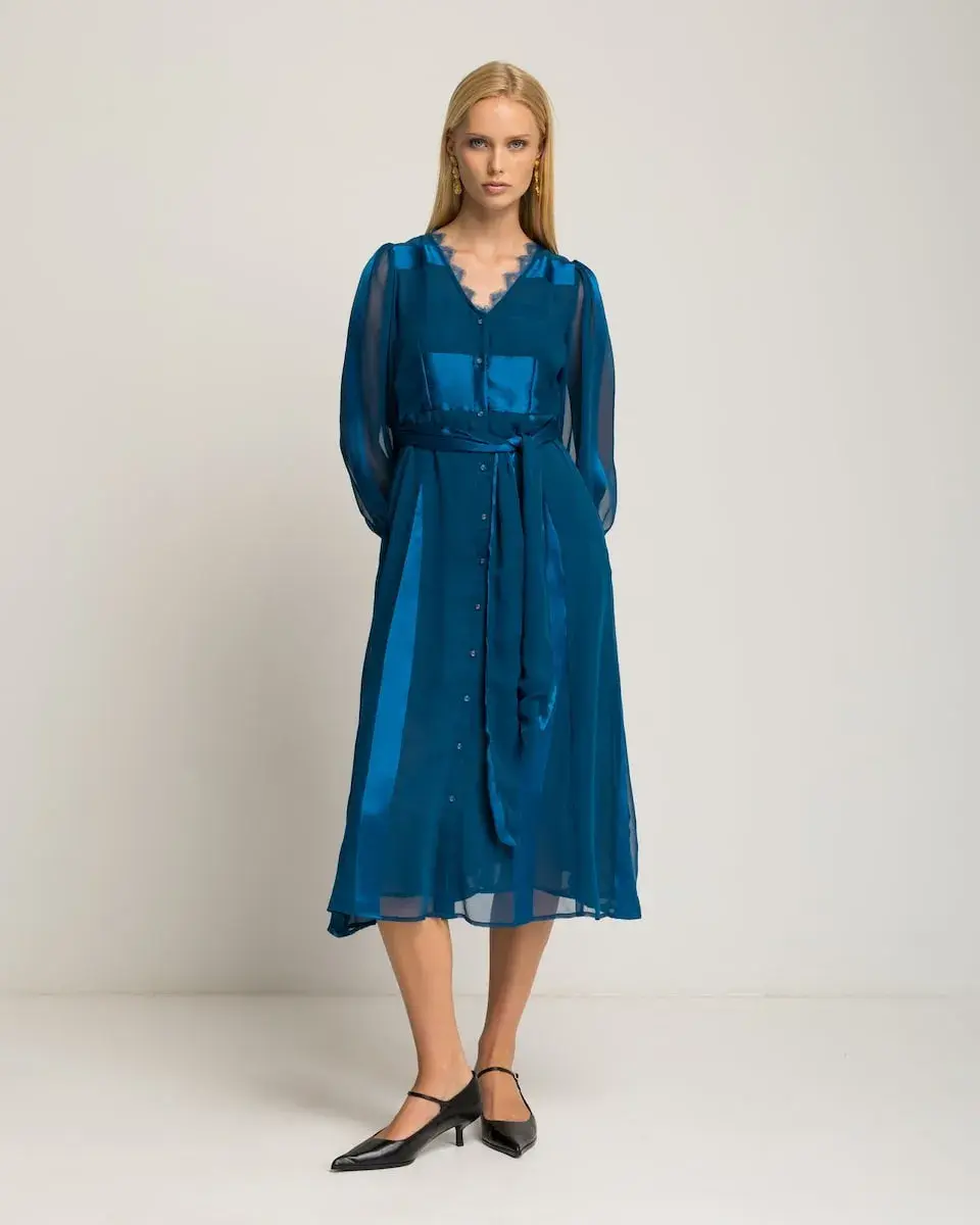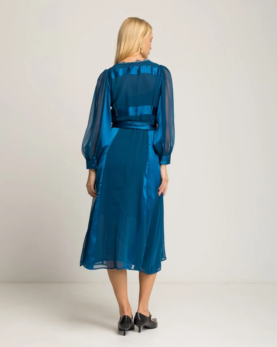 Сложный стиль с богемной душой. Это миди-платье из сатиновой ткани голубого цвета сочетает в себе прозрачные мягкие вставки с плавным силуэтом и поясом в тон, чтобы подчеркнуть фигуру. Деталь из кружева на вырезе добавляет романтический штрих, который поднимает настроение любого события.
