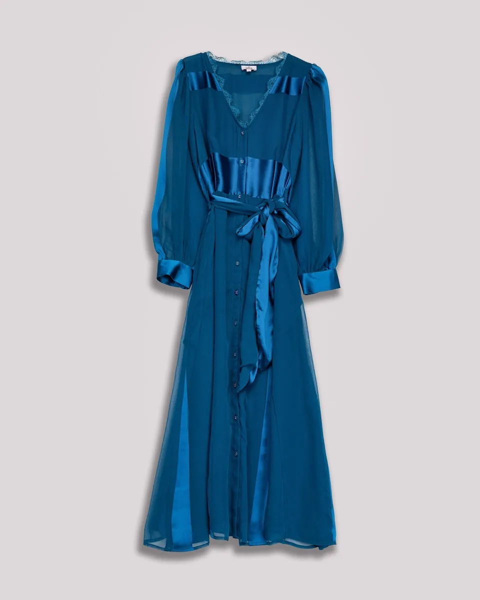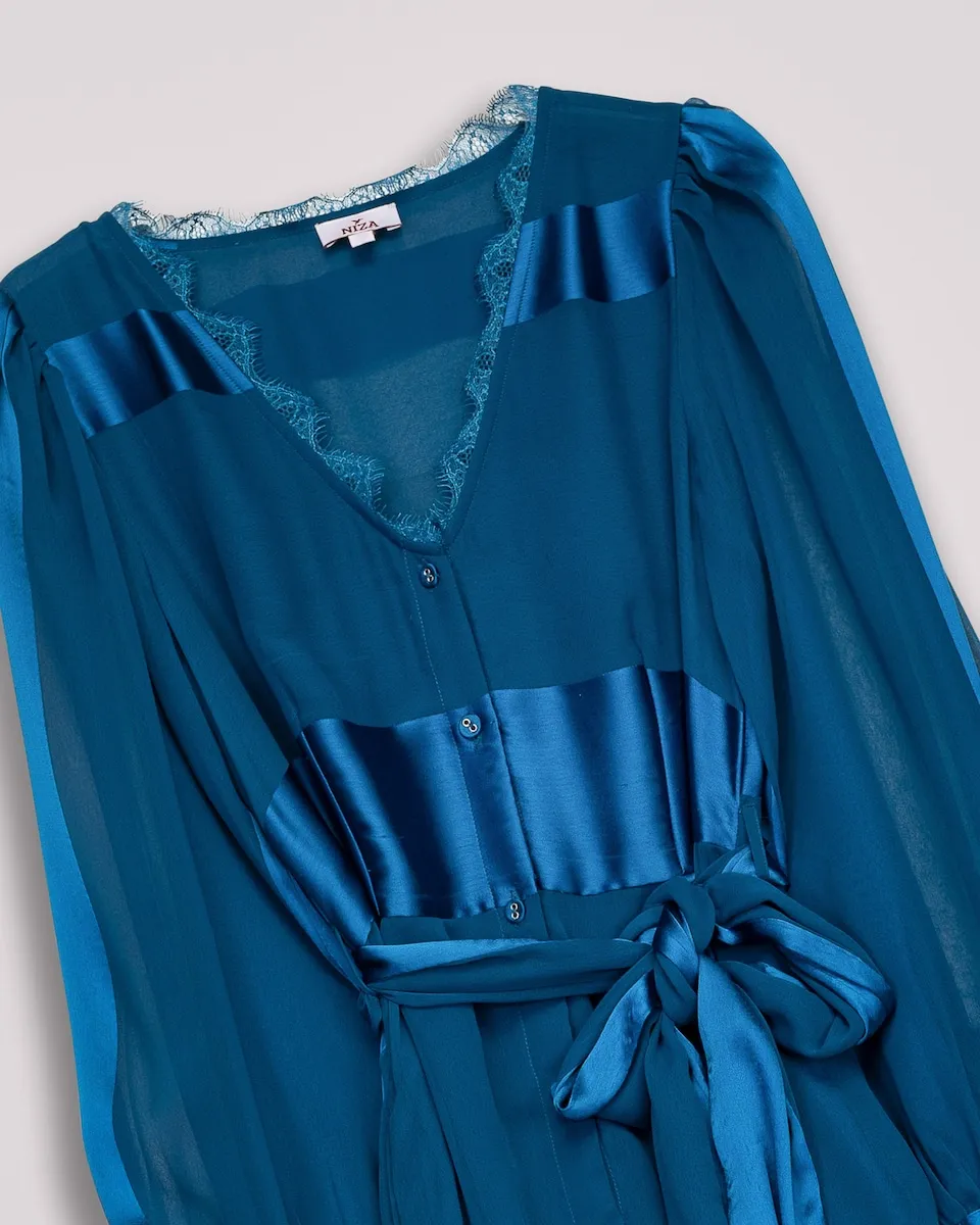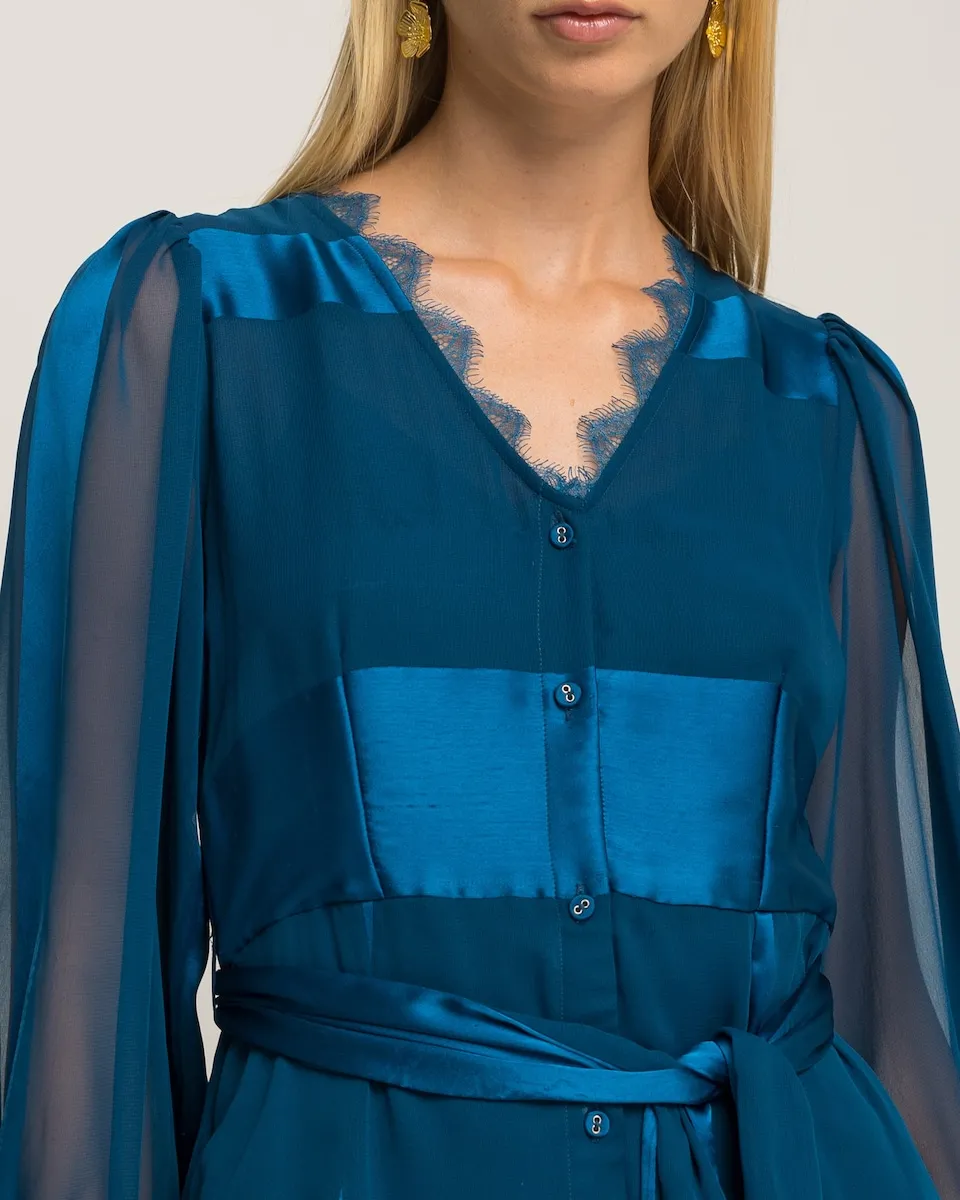 Сложный стиль с богемной душой. Это миди-платье из сатиновой ткани голубого цвета сочетает в себе прозрачные мягкие вставки с плавным силуэтом и поясом в тон, чтобы подчеркнуть фигуру. Деталь из кружева на вырезе добавляет романтический штрих, который поднимает настроение любого события.