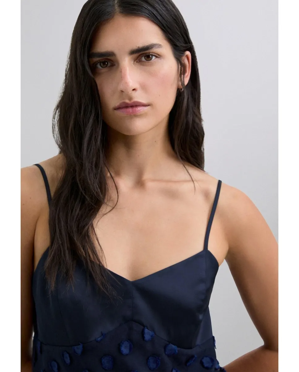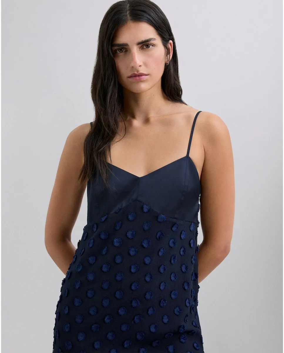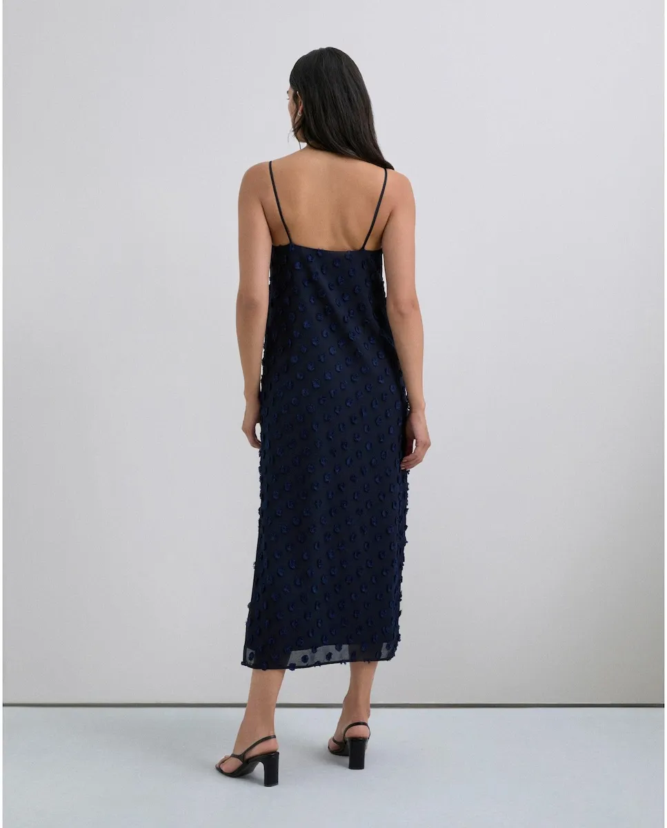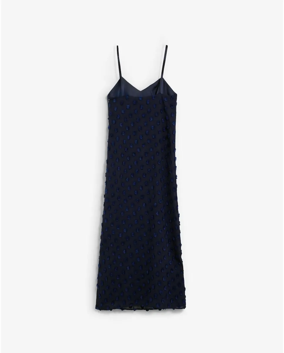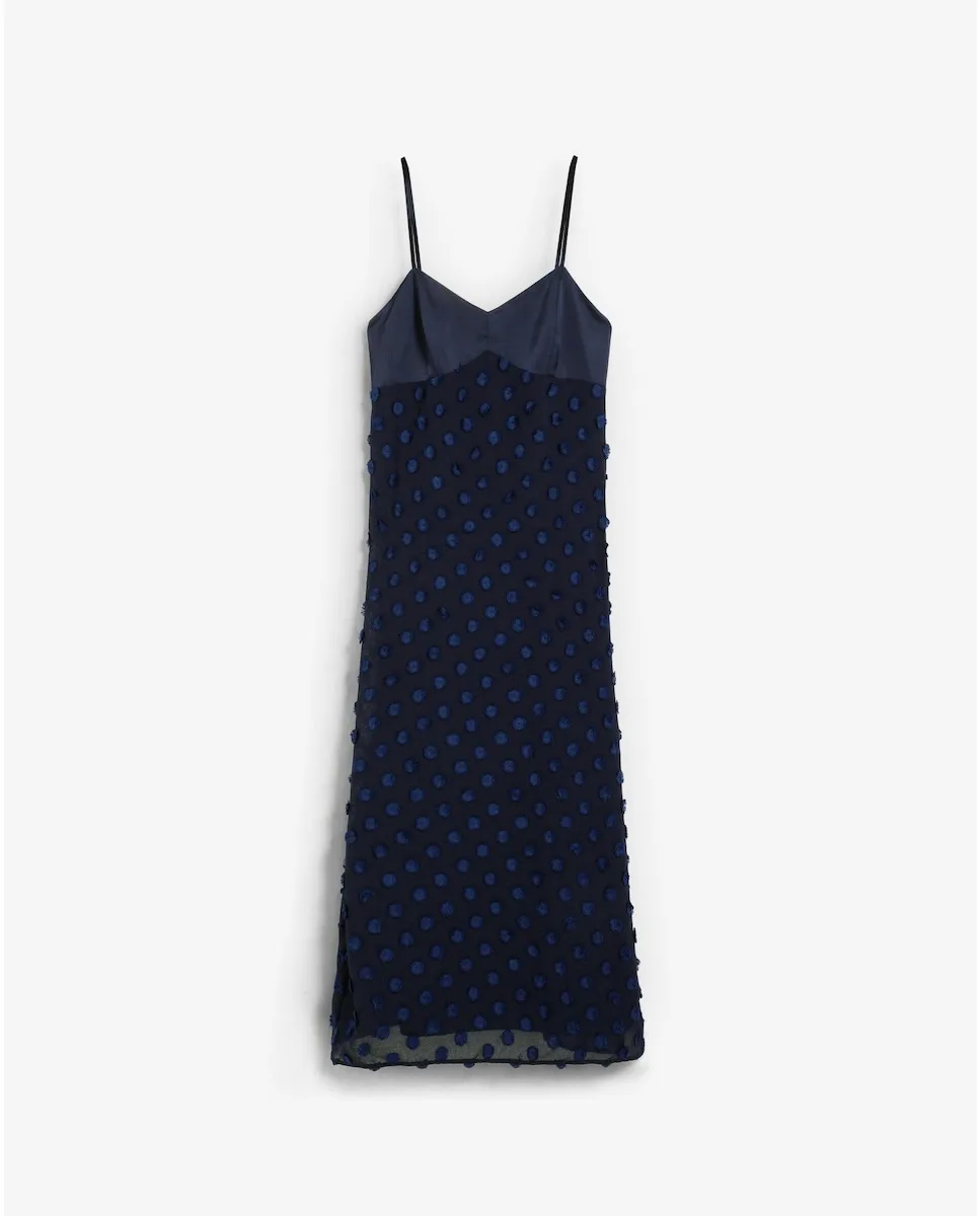 Платье-комбинация, выполненное из 100% полиэстера. Миди-дизайн с тонкими бретелями и V-образным вырезом. Ткань с рельефной точечной текстурой контрастного цвета на лифе и юбке. Прямой подол с полупрозрачной отделкой.