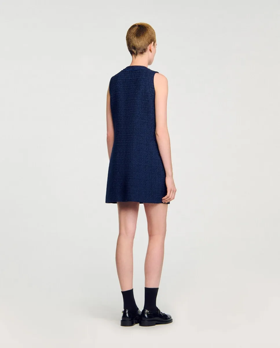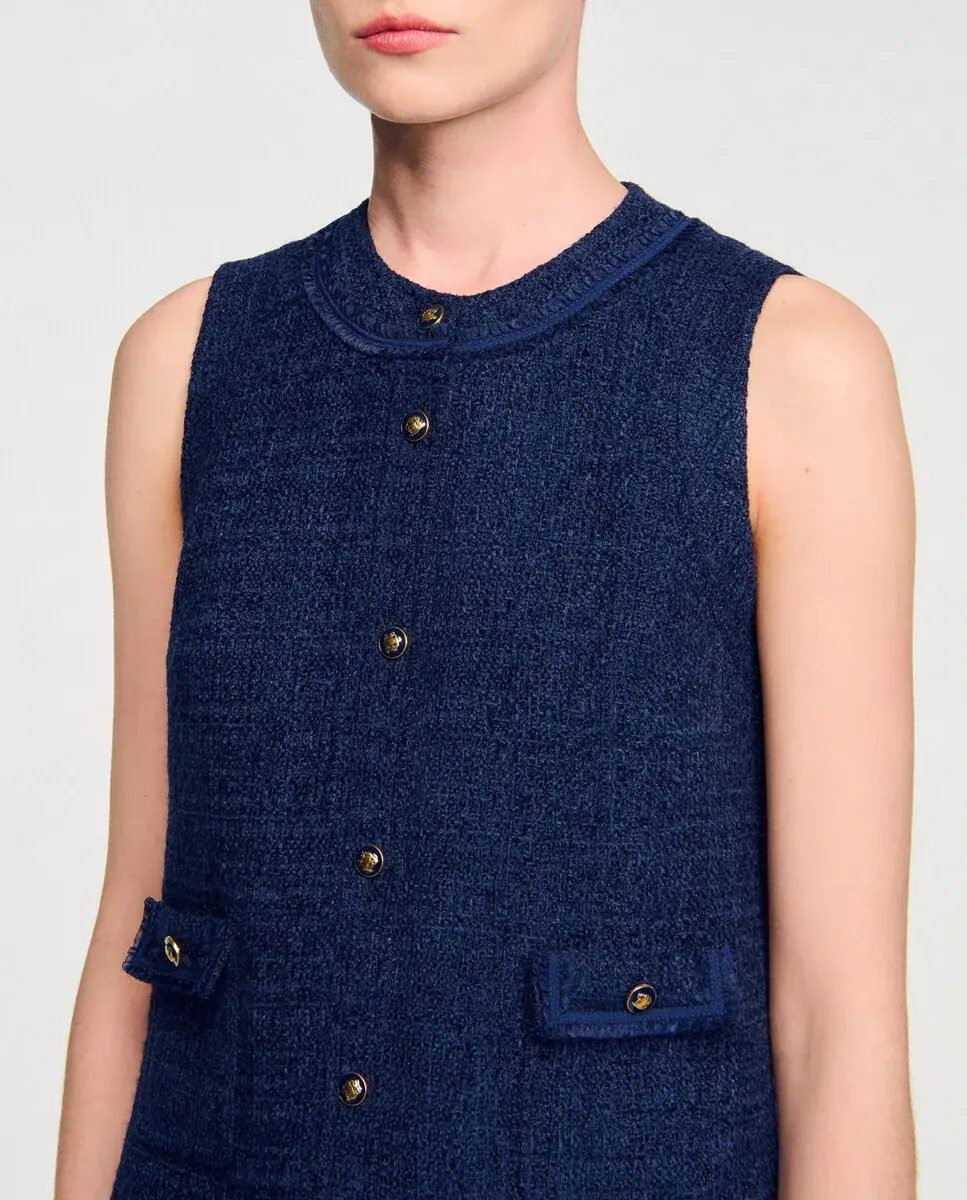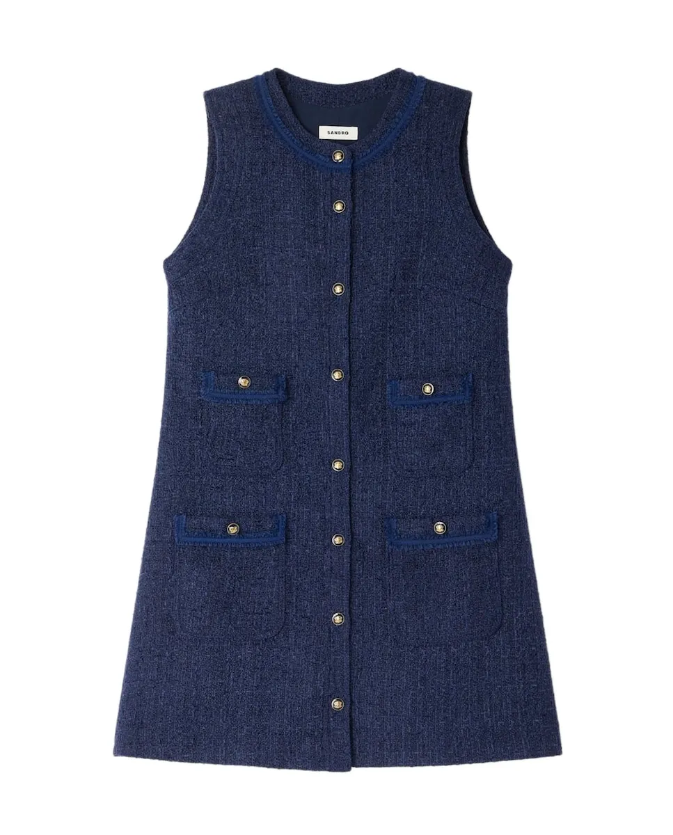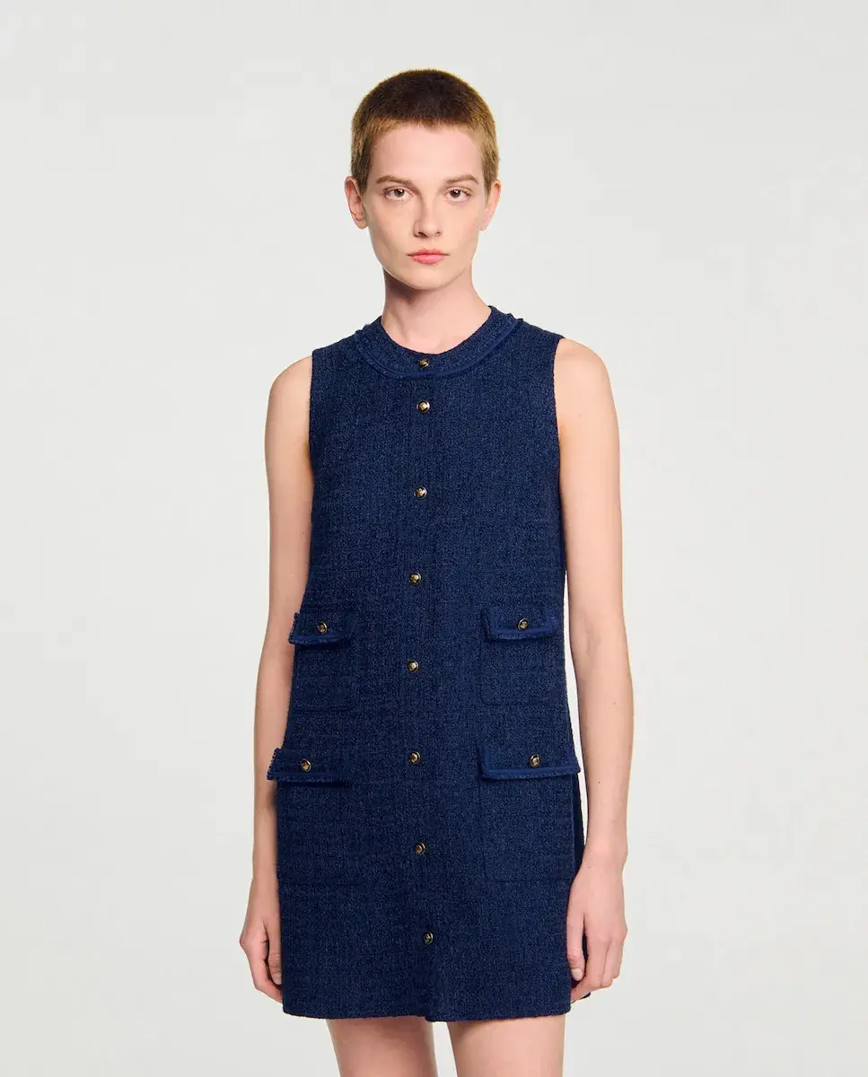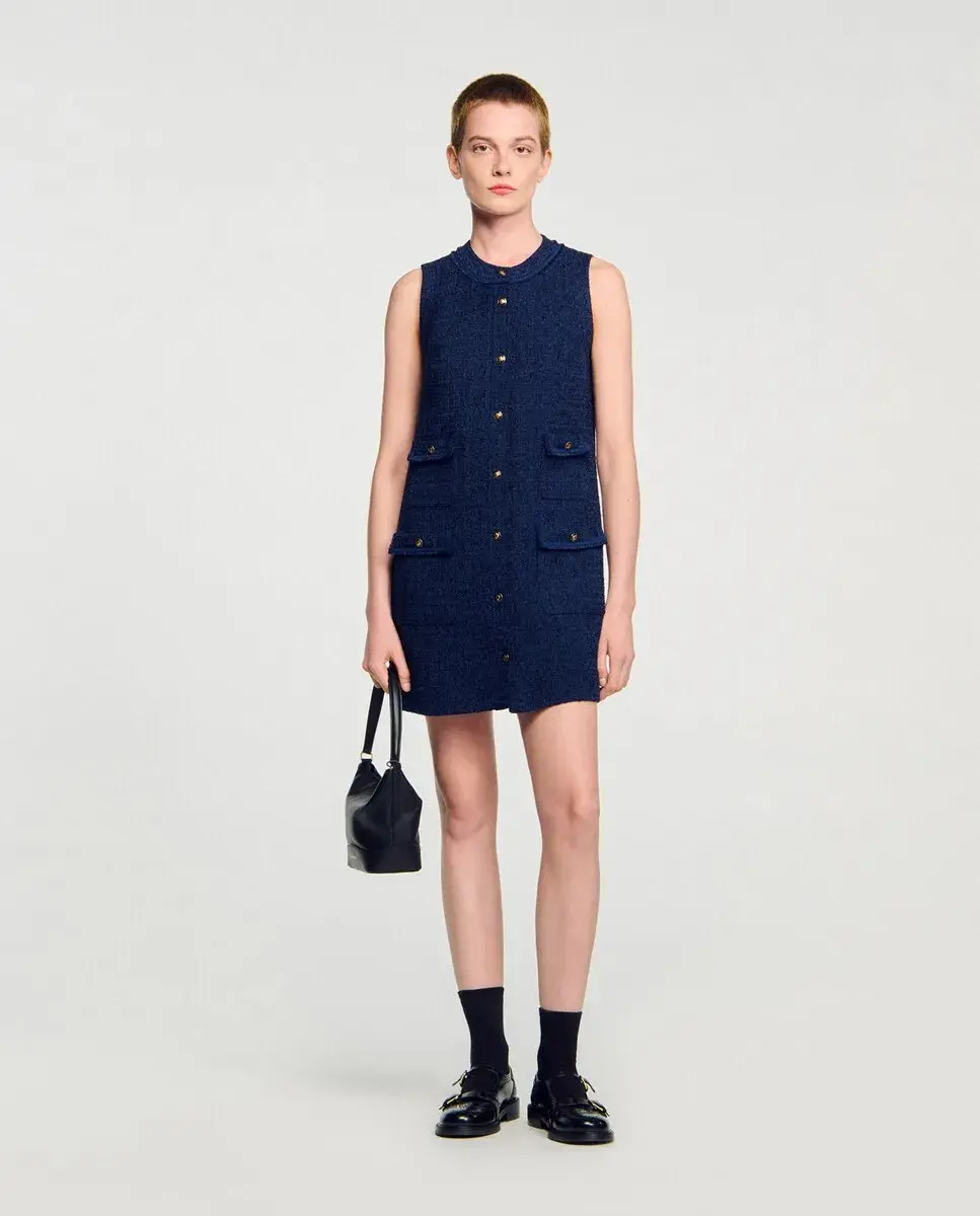 Короткое платье из твида без рукавов с круглым вырезом, застежкой на пуговицы и украшением в виде карманов с клапанами. Короткое платье из твида Sandro для женщин. Круглый вырез. Без рукавов. 4 кармана с застежкой на пуговицы. Прямой крой.