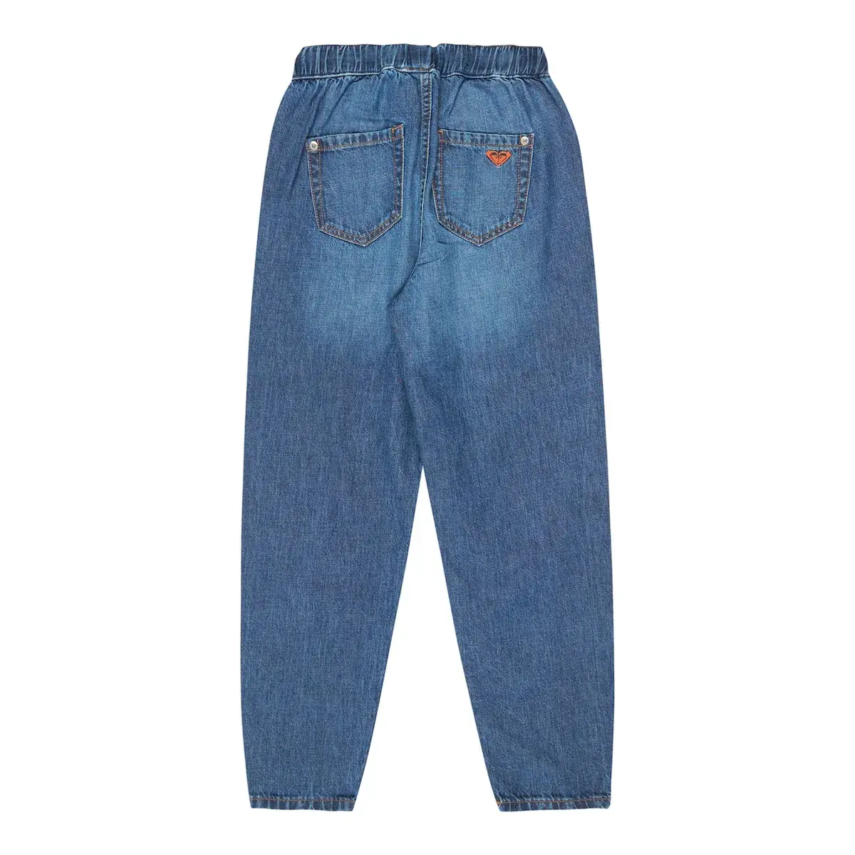 Спортивные штаны для детей 4-16 лет. Характеристики включают: Материал: хлопковый вельвет средней плотности [295 г/м²], крой: свободный крой, эластичный пояс с функциональным шнурком и металлическая пластина с логотипом Roxy на задней части под поясом.