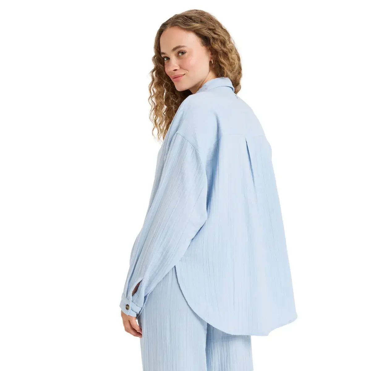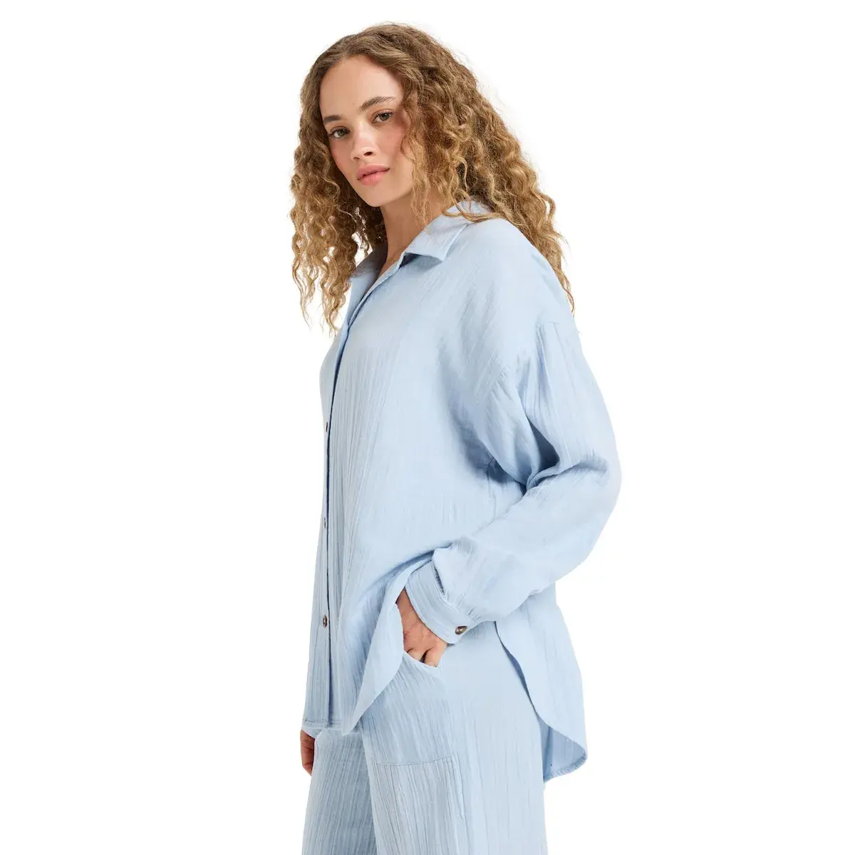 Женская объемная рубашка с длинными рукавами. Характеристики включают: Ткань: двуслойный хлопковый муслин средней плотности из органического хлопка, Крой: мужской фасон, Пуговицы спереди из переработанной черепаховой кости, Опущенные плечи, Манжеты с застежкой на пуговицы из переработанной черепаховой кости и Большие боковые вентиляционные отверстия.