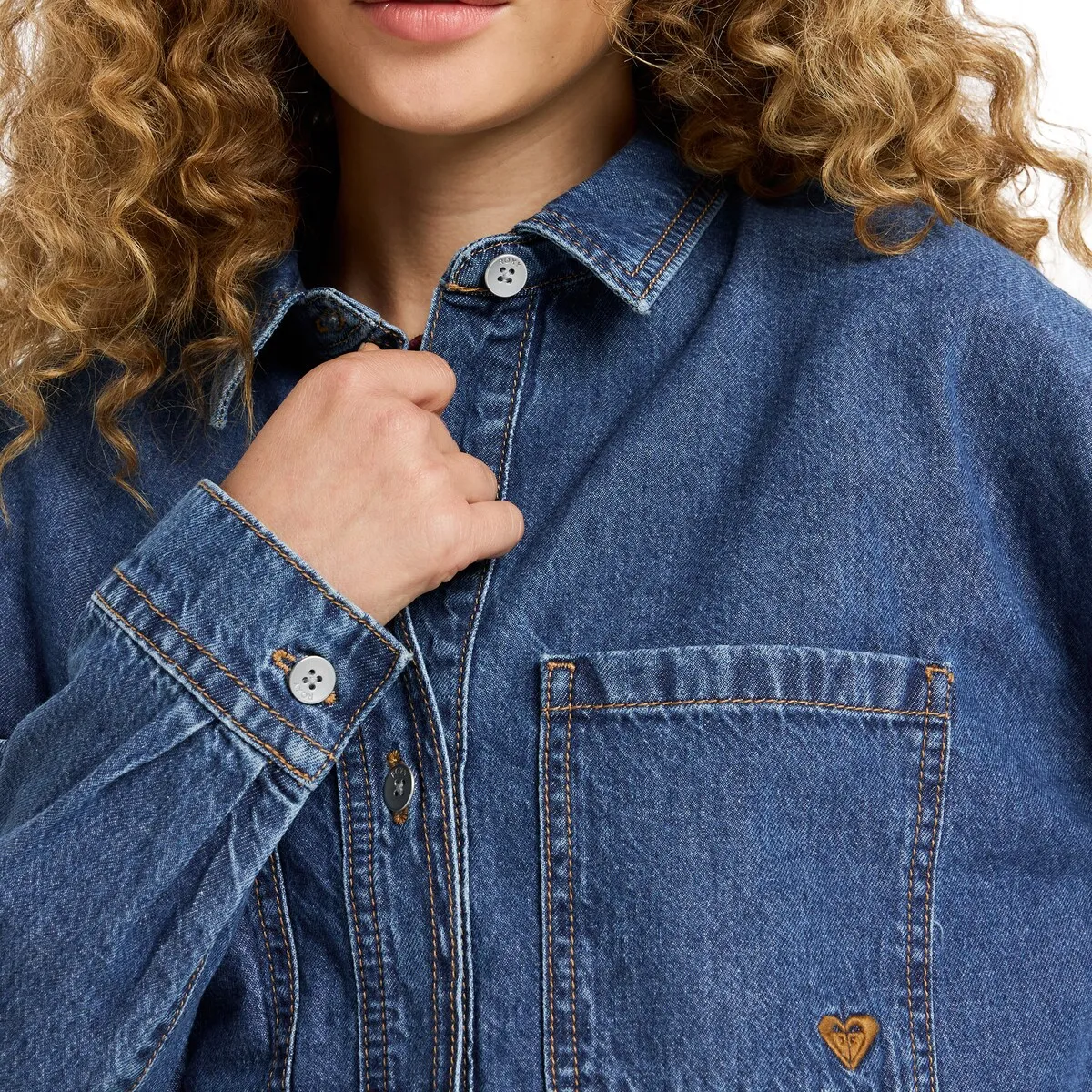 Женская джинсовая рубашка с длинными рукавами. Характеристики включают: Ткань: легкий джинсовый материал, Крой: удобный с пуговицами, Нашивки из той же ткани и Воротник: застегивающийся на пуговицы.