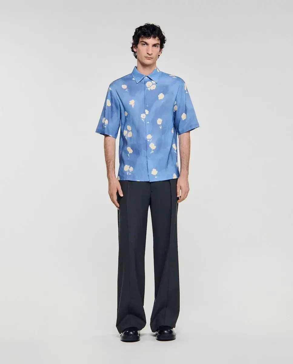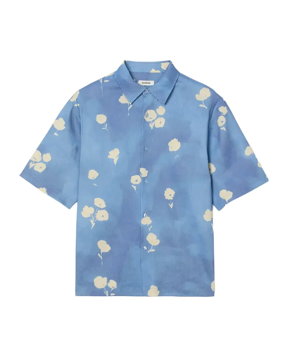 Легкая рубашка из льна, украшенная цветочным принтом, с классическим воротником, застежкой на пуговицы и короткими рукавами. Мужская рубашка с цветочным принтом Sandro. Свободный крой. Классический воротник. Короткие рукава. Застежка на пуговицы. 63% лен.