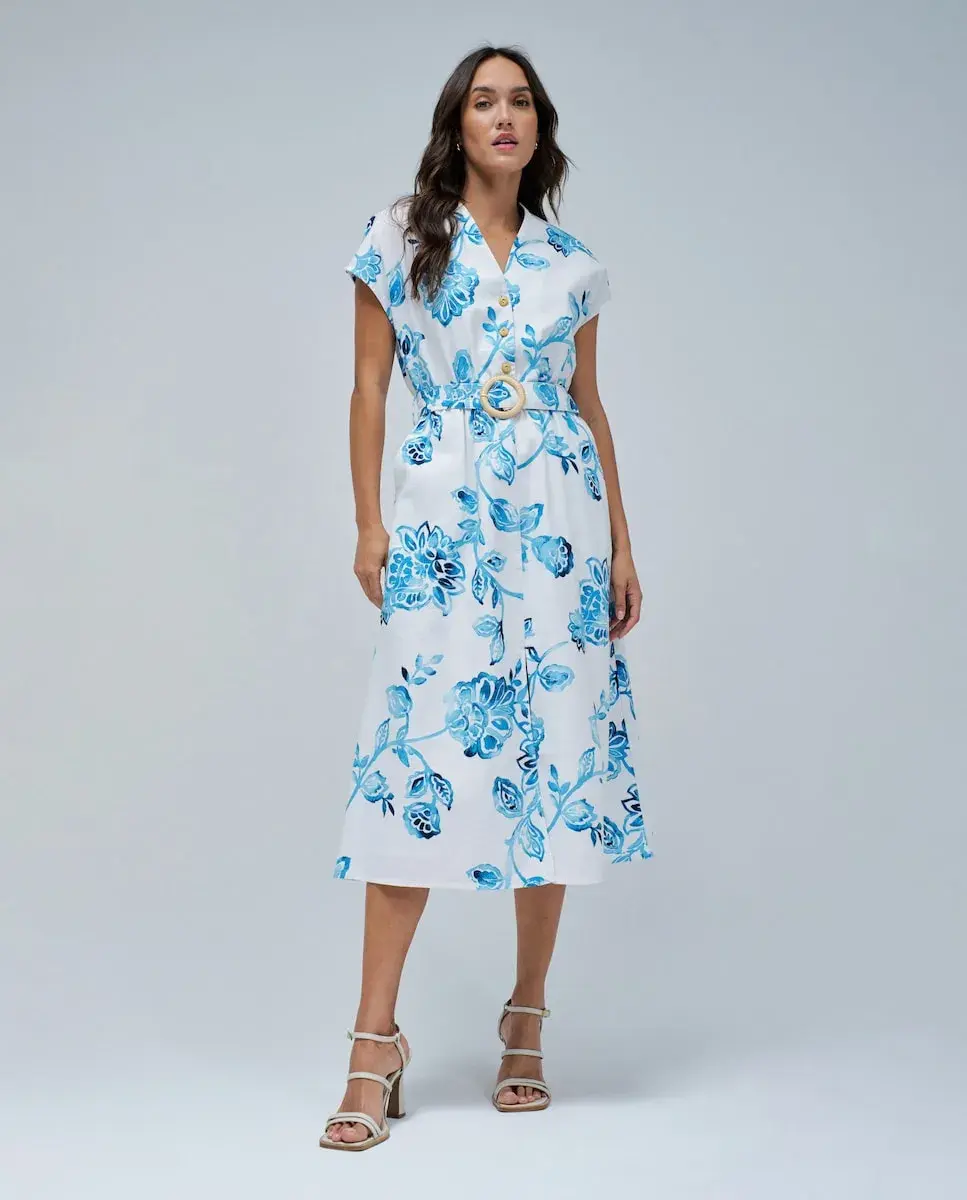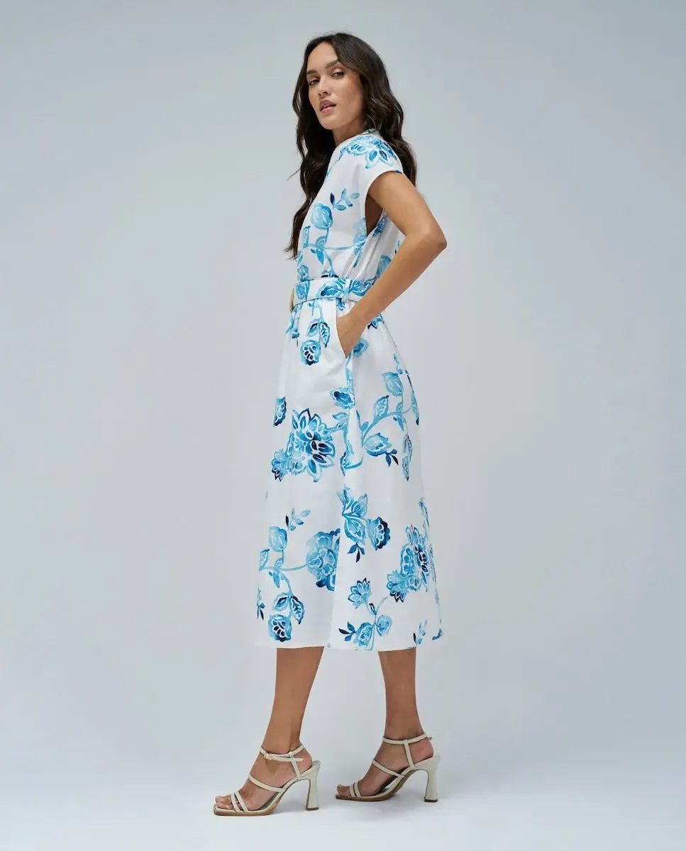 Это платье-рубашка с цветочным принтом было создано с мыслями о расслабленных солнечных днях и летних поездках. С миди-кроем, обеспечивающим легкость и свободу движения, оно является практичной и элегантной вещью, идеально подходящей для тех, кто ценит комфорт, не отказываясь от стиля. Деревянные пуговицы и съемный пояс с пряжкой из рафии подчеркивают естественный и ремесленный характер образа, простые, но очень выразительные детали, которые напоминают теплые тона песка и соломенные аксессуары, типичные для курортных мест. V-образный вырез аккуратен и выгодно подчеркивает фигуру, а боковые карманы обеспечивают функциональность на каждый день. Передний разрез придает движению плавность и открывает нужное количество кожи, создавая расслабленный, но всегда элегантный образ. Прорези на рукавах делают его идеальным для жарких дней, открывая плечи и придавая легкость и свежесть. В тонах, напоминающих море, соль и ясное небо, это Эта вещь идеально вписывается как в летний гардероб, так и в атмосферу долгих выходных, когда время замедляется и все кажется вкуснее. - Платье-рубашка с цветочным принтом - Цвет: синий и белый - Длина миди - Деревянные пуговицы - Съемный пояс с пряжкой из рафии - V-образный вырез - Боковые карманы - Передний разрез - Крылышки на рукавах Для справки: модель ростом 1,74 м, размер S.