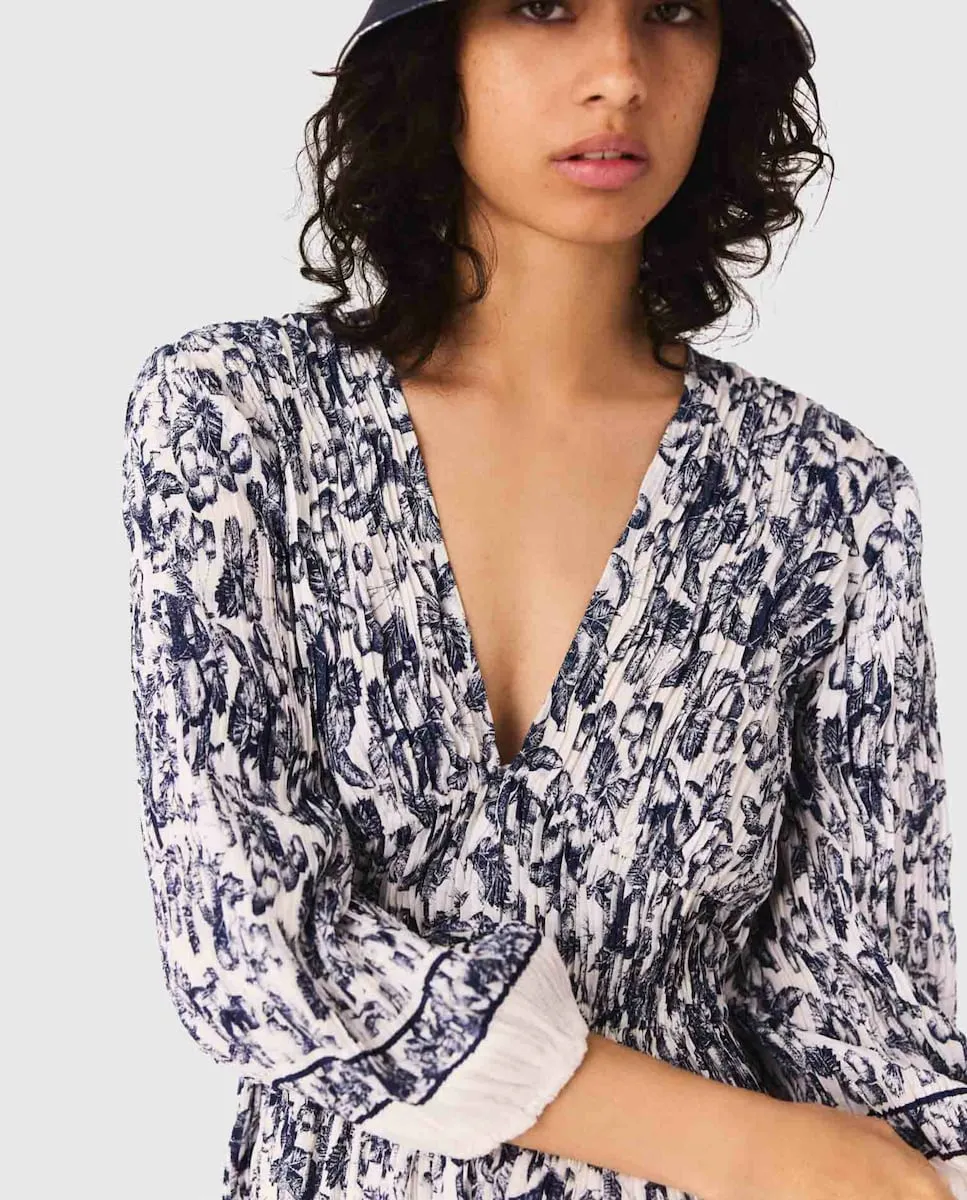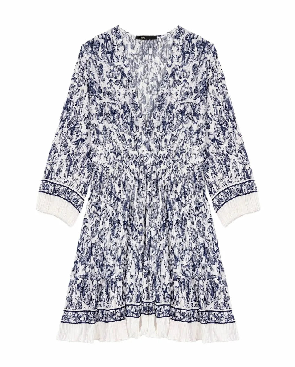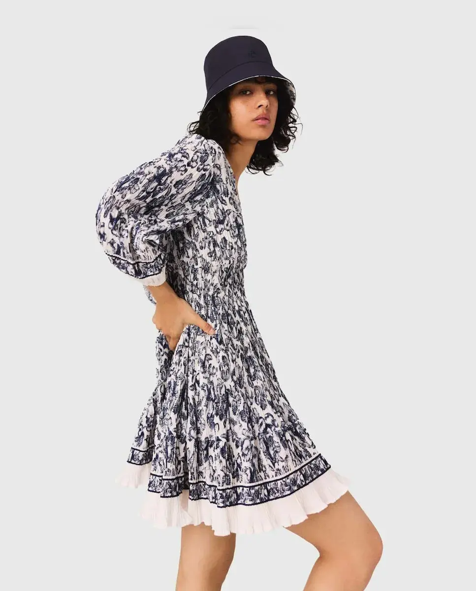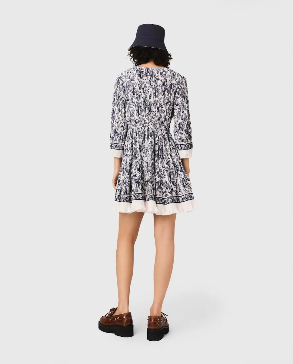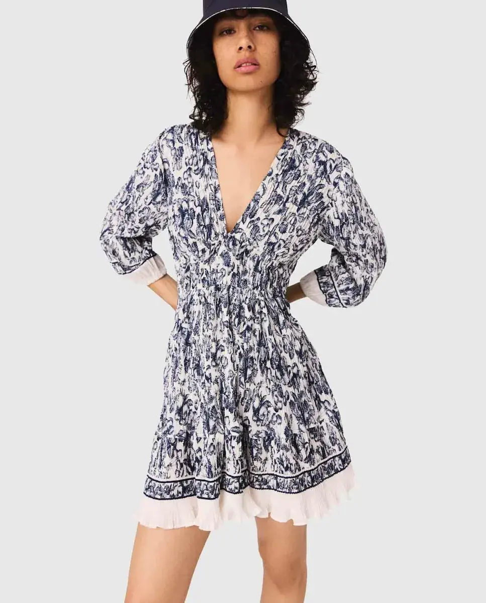 Короткое плиссированное платье с фруктовым принтом. V-образный вырез с пуговицами. Рукава три четверти с эластичными манжетами. Расклешенная юбка с оборками по краям. Эластичная талия. Боковая застежка на молнию. Как момент, застигнутый в конце лета, сладкий параграф перед возвращением к реальности. Эта коллекция, сочетающая легкость и естественность, воплощает простую элегантность через вечные, переосмысленные вещи и характерный фруктовый принт. Короткое платье с фруктовым принтом, главная звезда сезона, сочетает в себе легкость и женственность. V-образный вырез с пуговицами и рукава три четверти с эластичными манжетами добавляют нотку утонченности, в то время как расклешенная юбка и эластичная талия создают привлекательный и стильный силуэт. Контрастные края с оборками были тщательно обработаны. Завершите этот летний образ, добавив панамку и кожаную обувь.