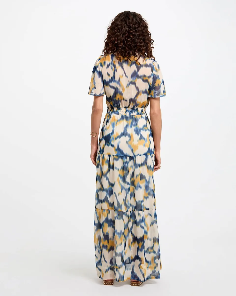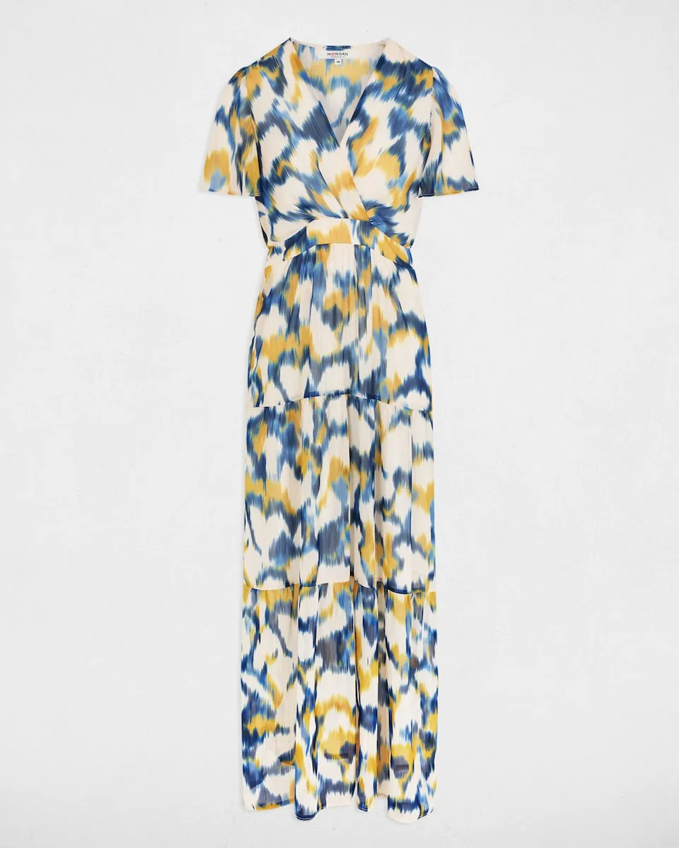 Длинное прямое платье с принтом. Свободный прямой крой. Длинное платье. Перекрещенный вырез. Короткий рукав. Абстрактный принт. Сборка на талии.