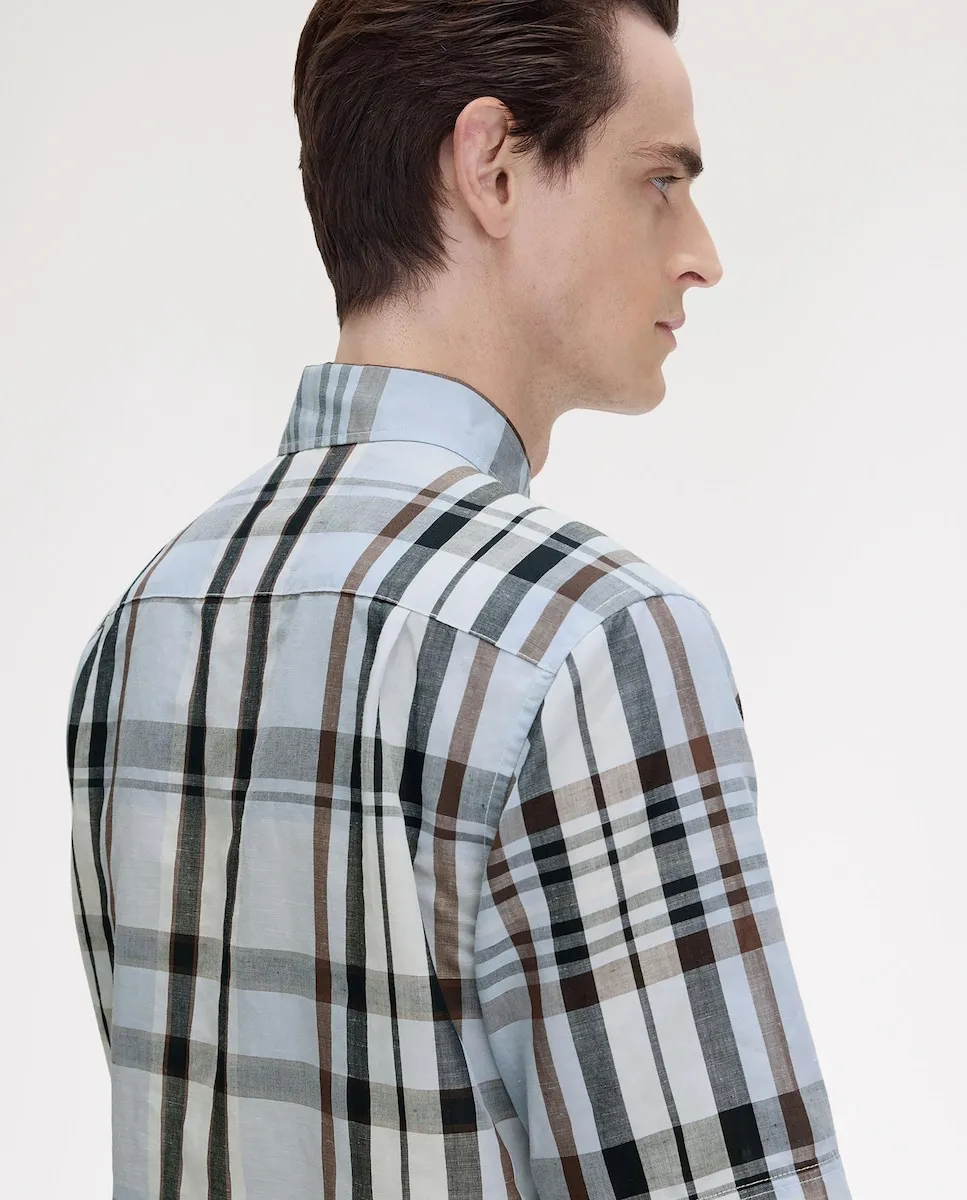 Мужская рубашка с клетчатым дизайном. Имеет прямой крой, классический воротник, планку с пуговицами и логотип бренда вышитый контрастом на уровне груди.