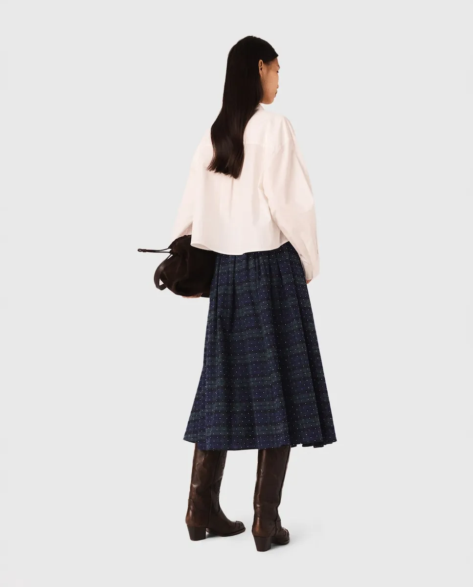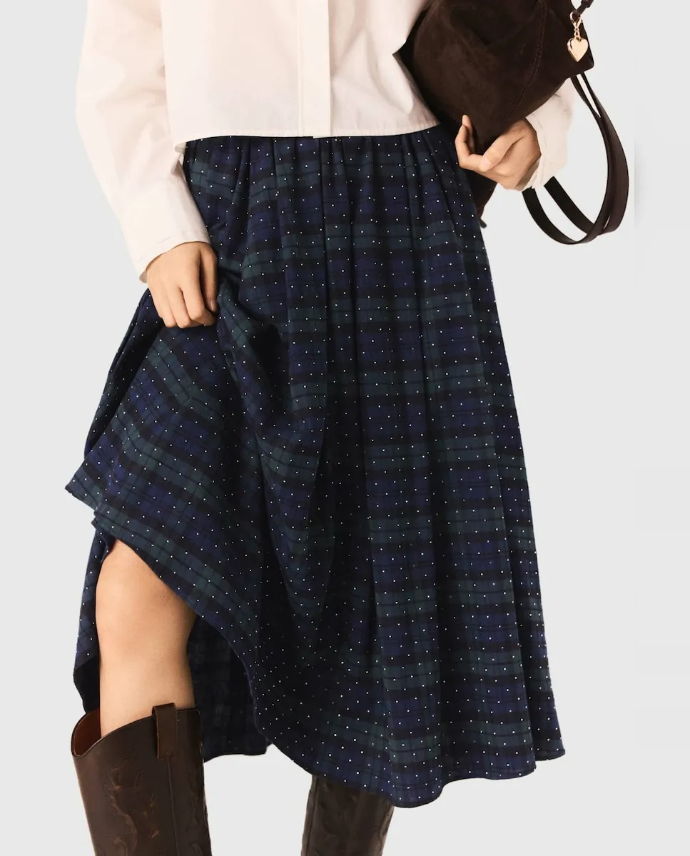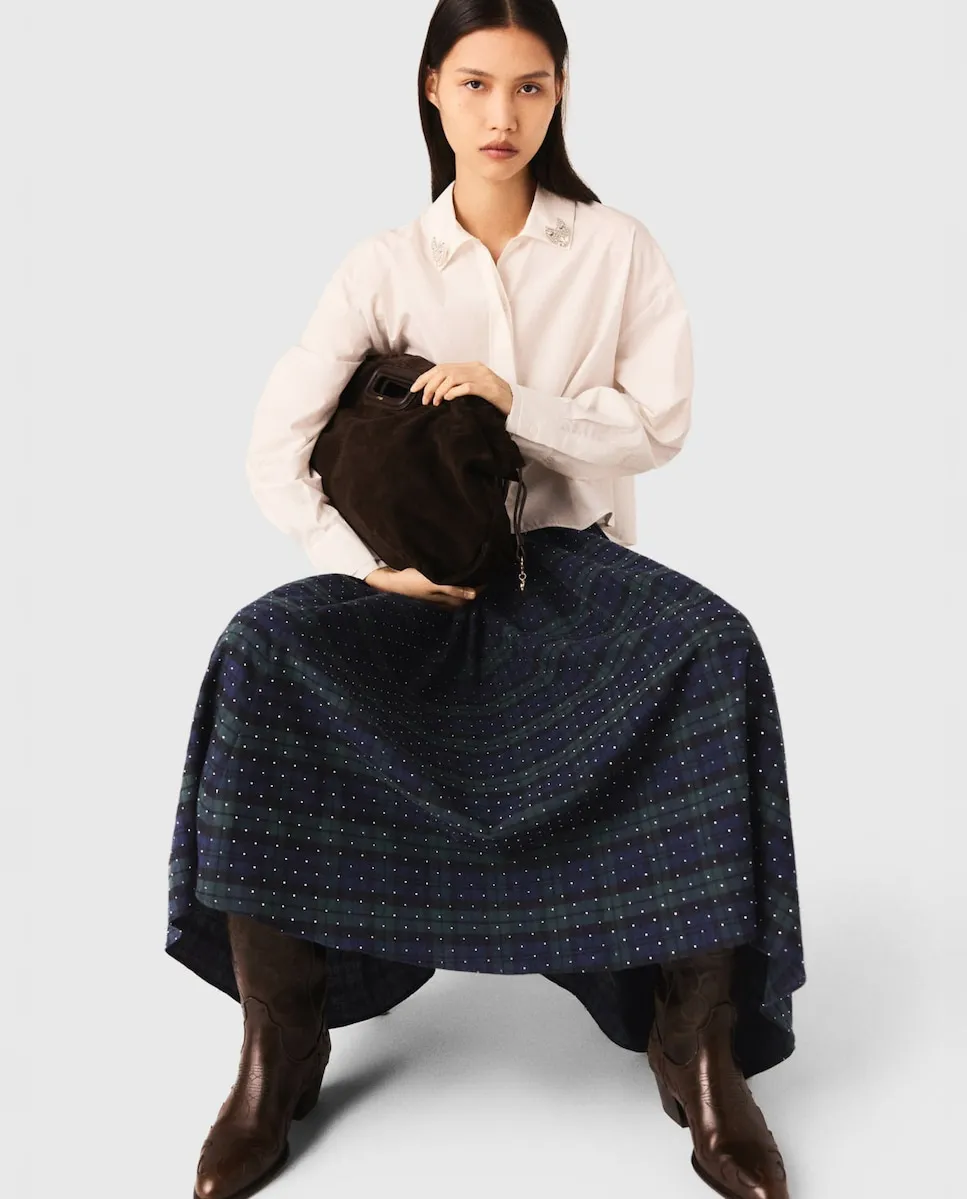 Длинная хлопковая юбка. Принт в клетку, украшенный стразами по всей поверхности. Эластичная спинка и застежка-молния. В этом сезоне Maje представляет вещи с характером, с красивой игрой текстур и объемов. Эта длинная юбка сочетает классический вид клетчатого рисунка с блеском страз. Объемная и расклешенная, она обеспечивает плавное движение и обновленную силуэтную форму. Носите ее с просторной блузкой с вышитым воротником и высокими сапогами для выразительного силуэта или сочетайте с подходящей по стилю рубашкой для создания ансамбля.