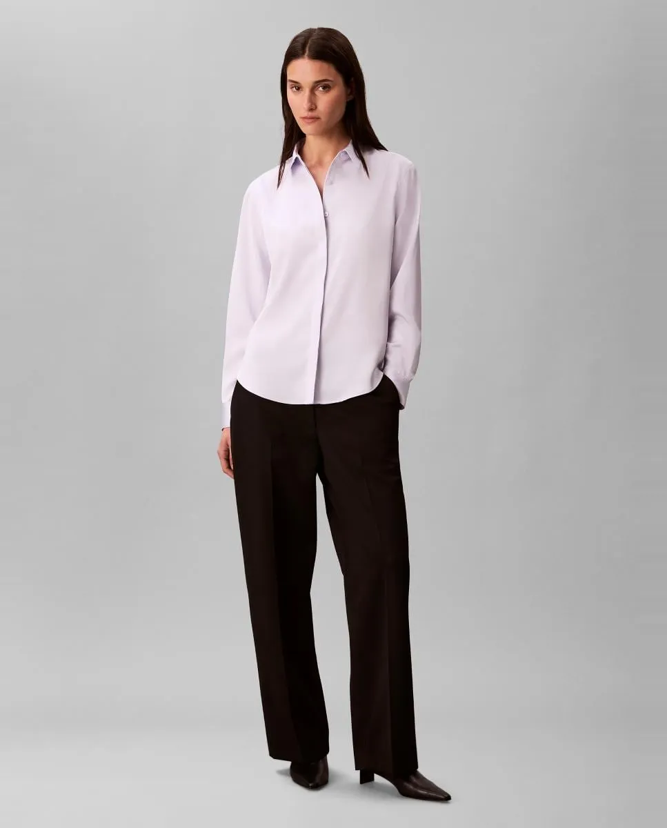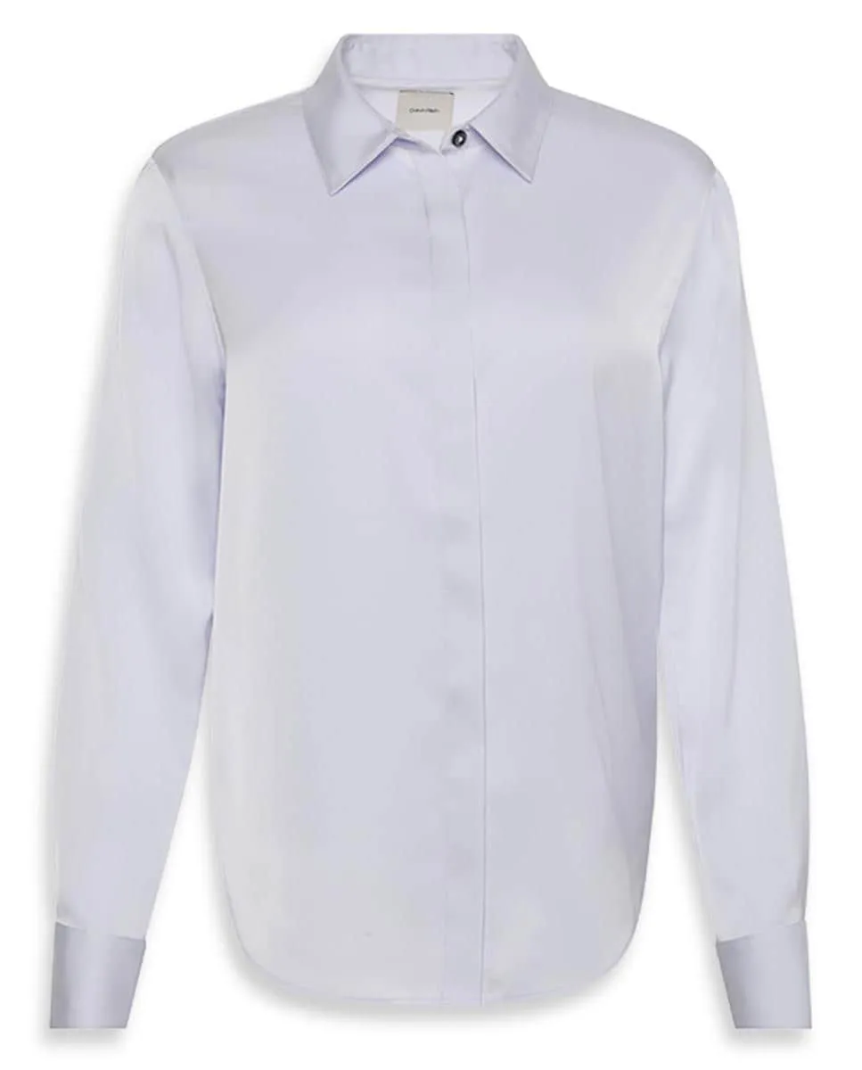 Женская атласная рубашка Calvin Klein, выполненная из 100% полиэстера, с длинными рукавами и скрытыми пуговицами.