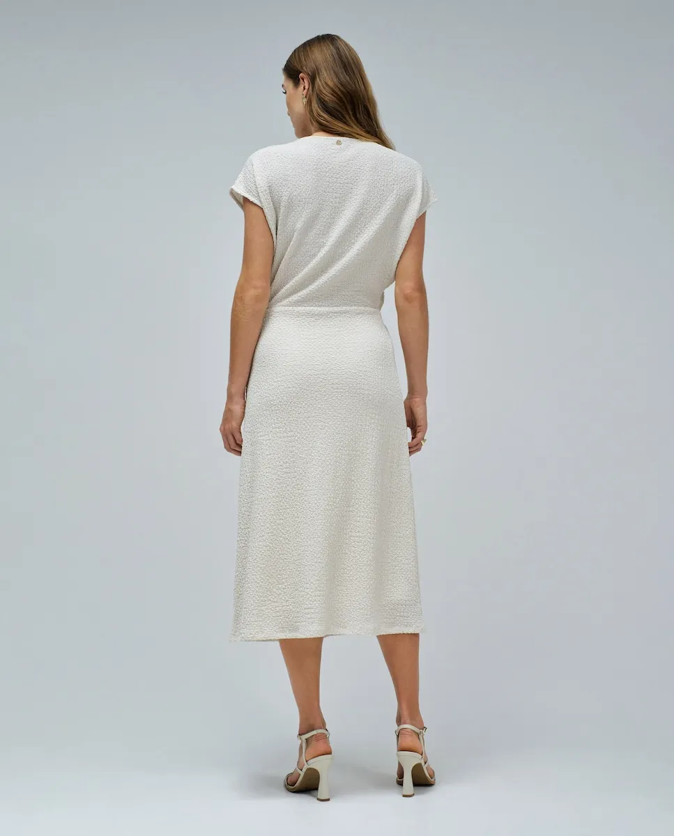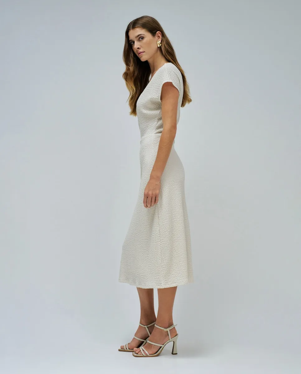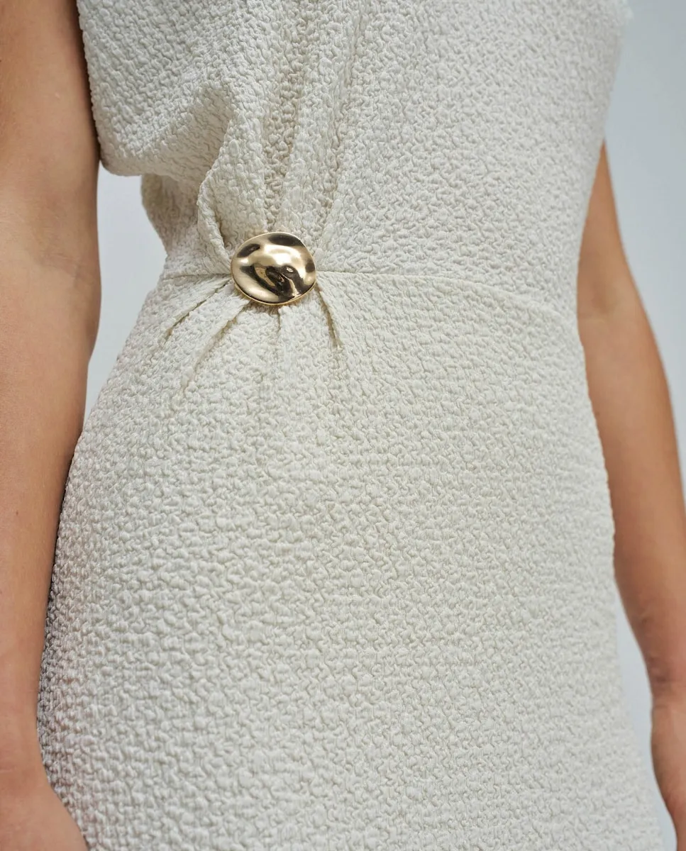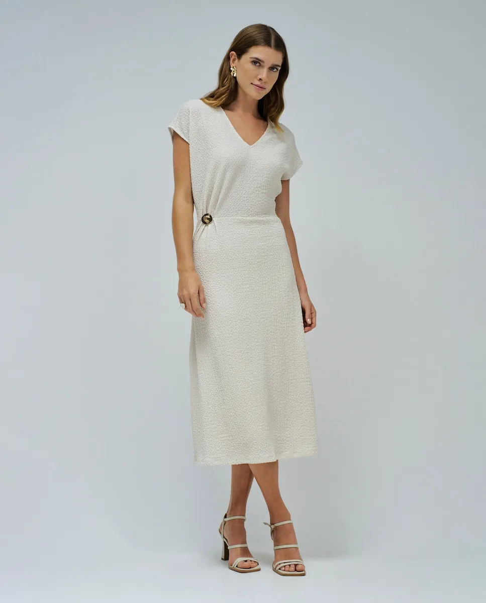 Платье, которое сочетает легкость и утонченность, создано, чтобы подчеркнуть вашу фигуру с элегантностью. V-образный вырез и сборка на талии с золотой аппликацией придают образу женственность и изысканность. Нежная текстура и бежевый оттенок делают его идеальным для солнечных дней с особым сиянием. Миди-длина сочетает комфорт и стиль в любой ситуации.- Платье с текстурой- Цвет бежевый- Миди-длина- V-образный вырез- Короткие рукава- Сборка на талии с золотой аппликациейДля справки: модель ростом 1,75 м и носит размер S.