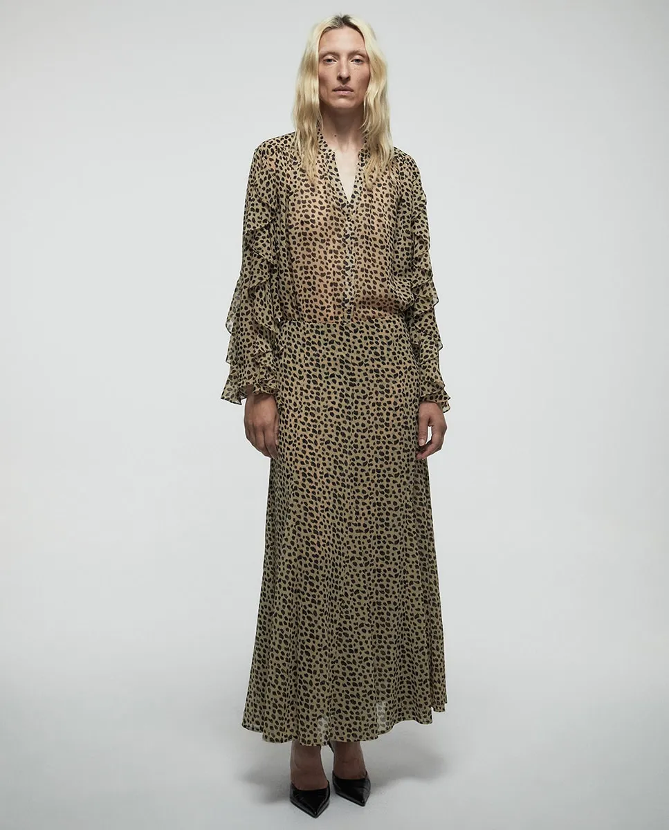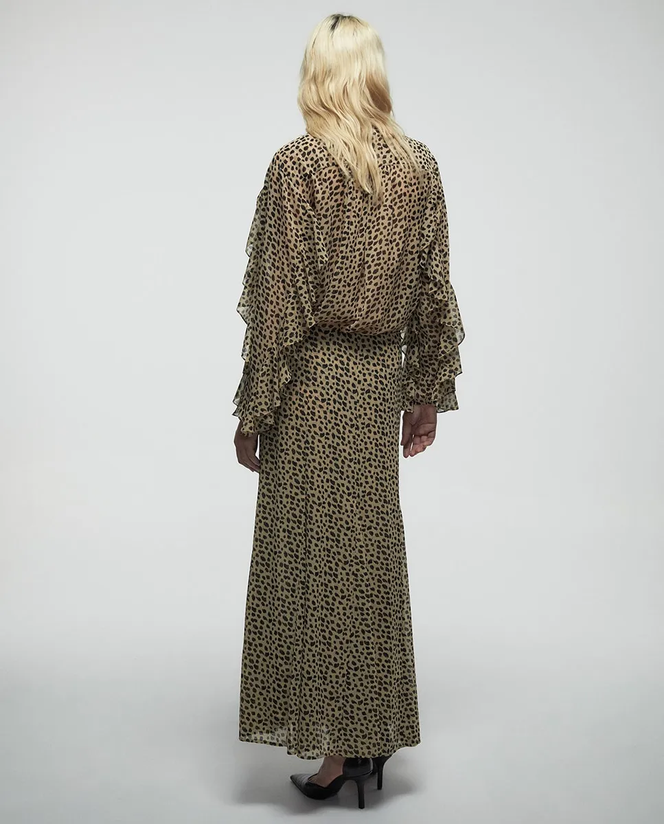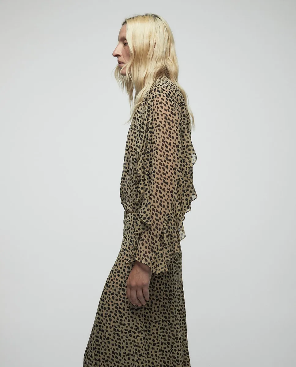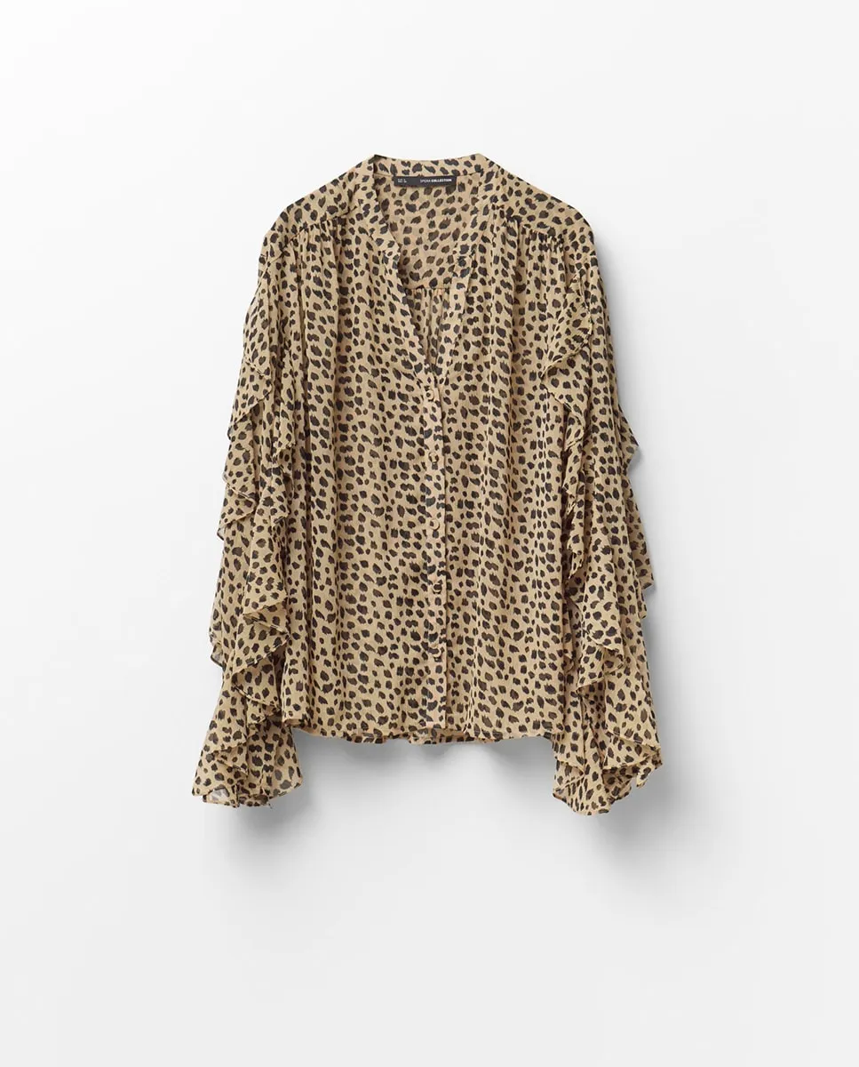 Легкая блузка с анималистичным принтом и оборками на рукавах. Застежка спереди на пуговицы.