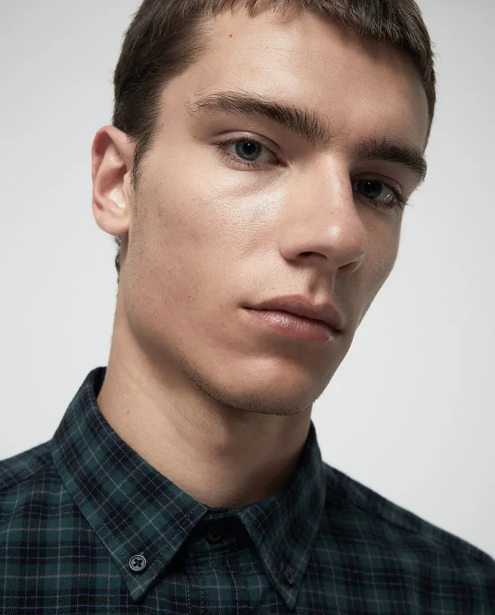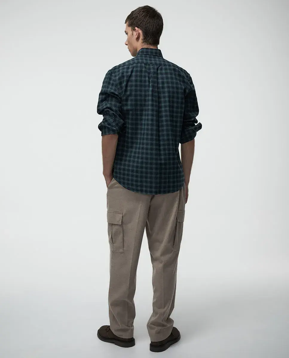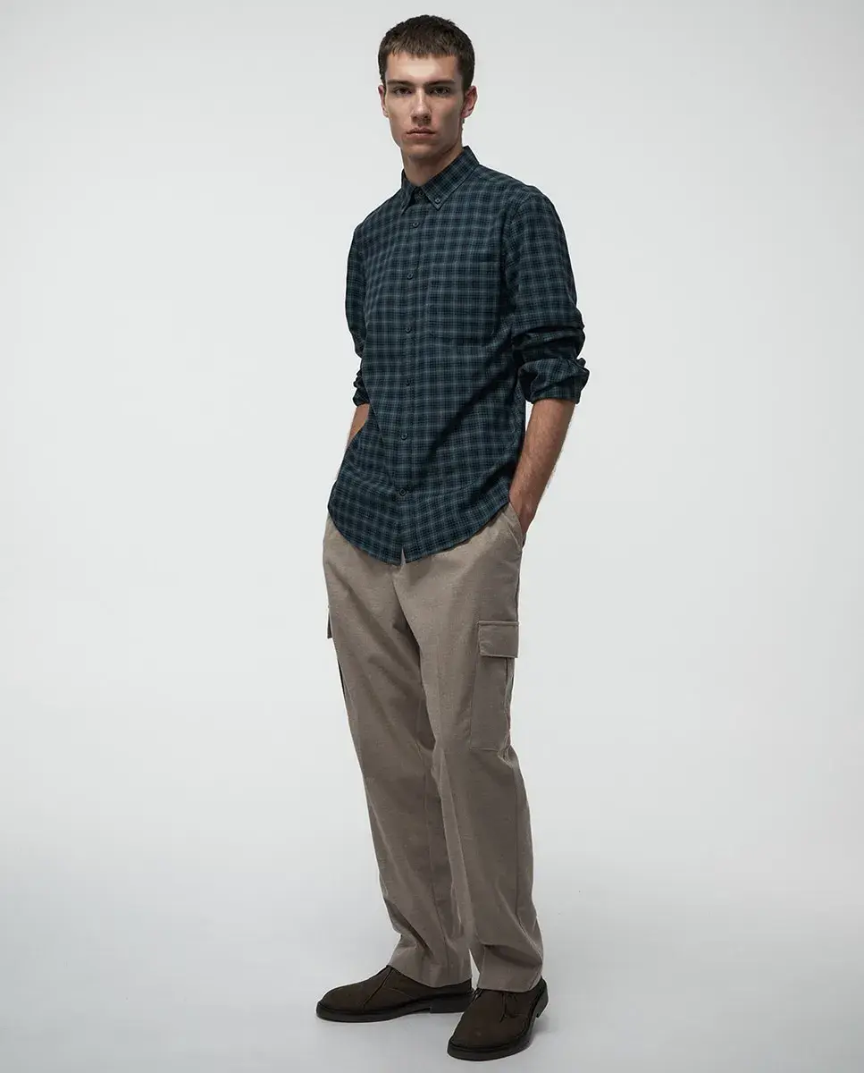 Фланелевая рубашка с отложным воротником и длинными рукавами, заканчивающимися манжетами с пуговицами. Передняя застежка на пуговицы. 100% хлопок.