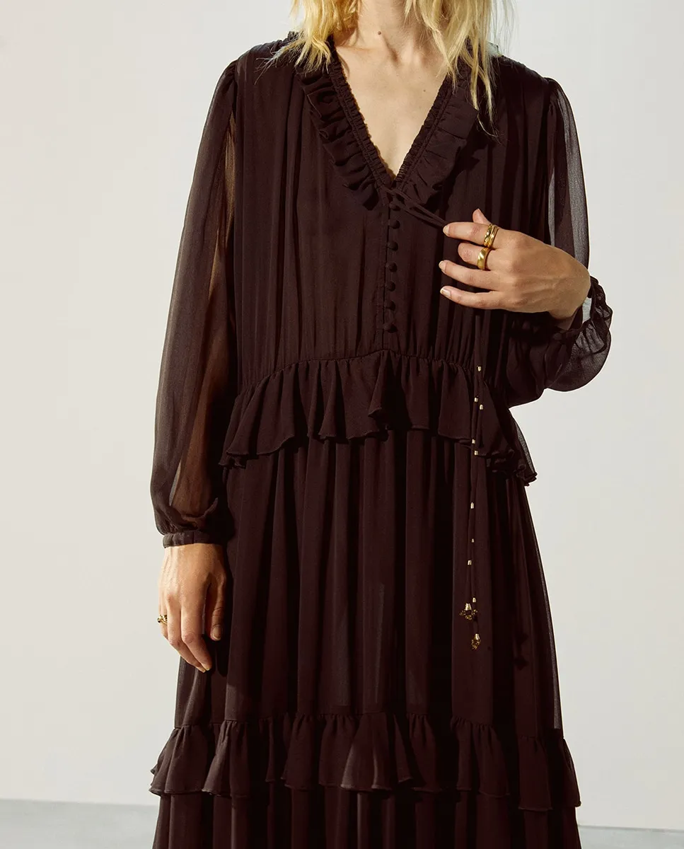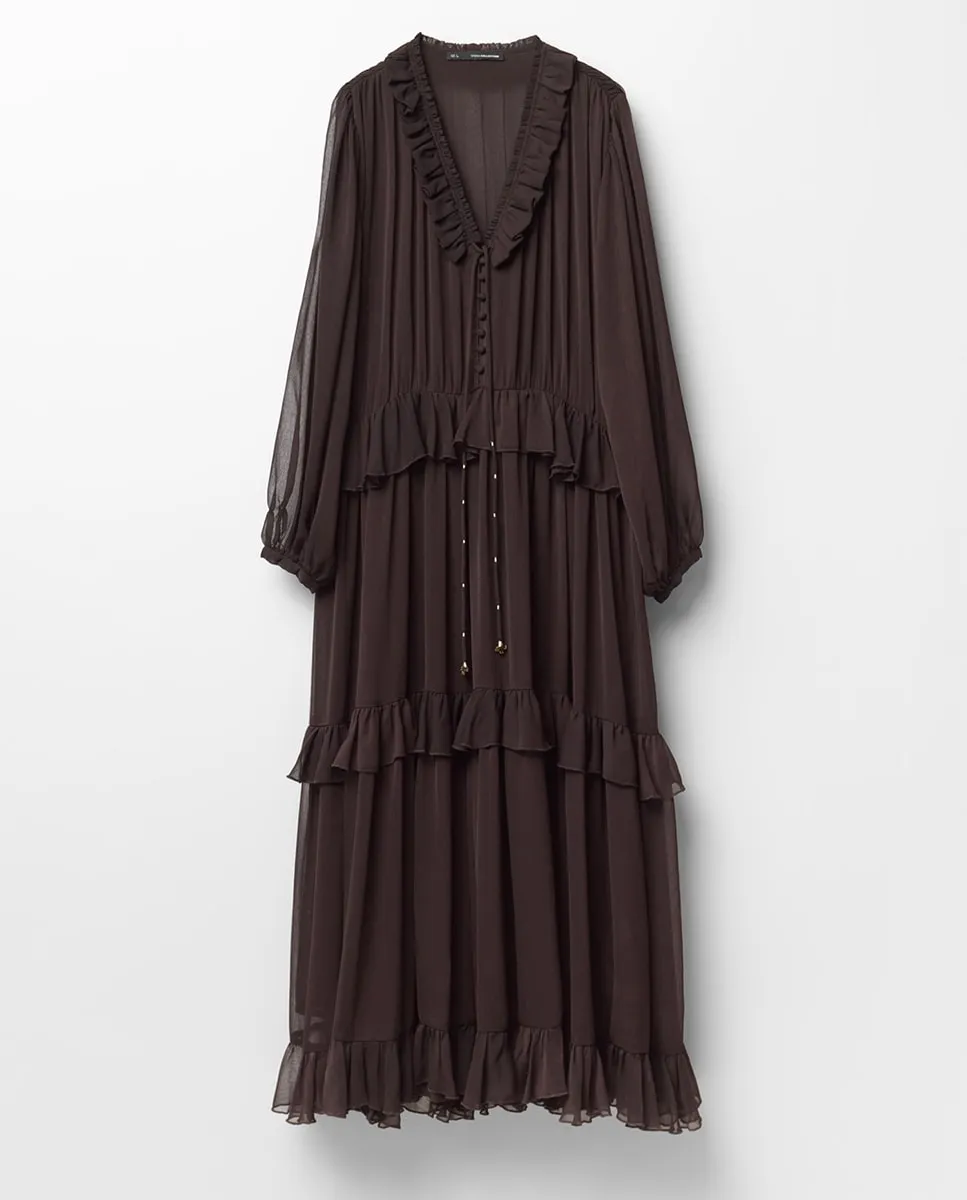 Длинное платье бохо с широкими длинными рукавами и V-образным вырезом. Детали с воланами на юбке с отделкой из бусин.