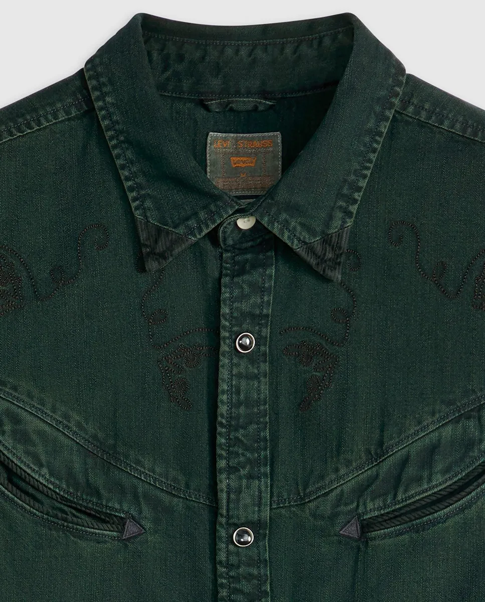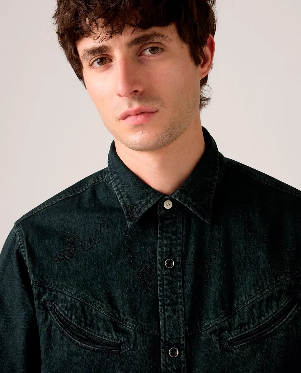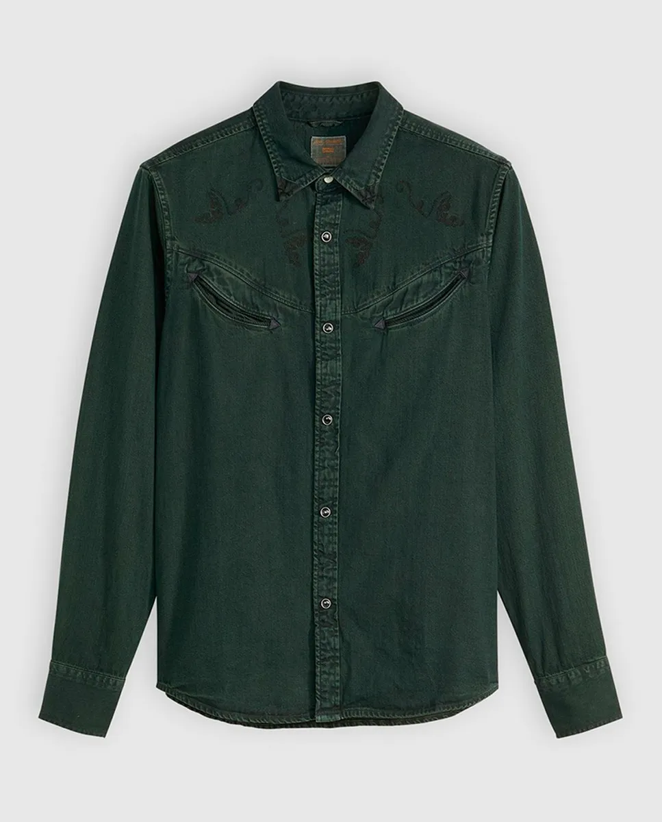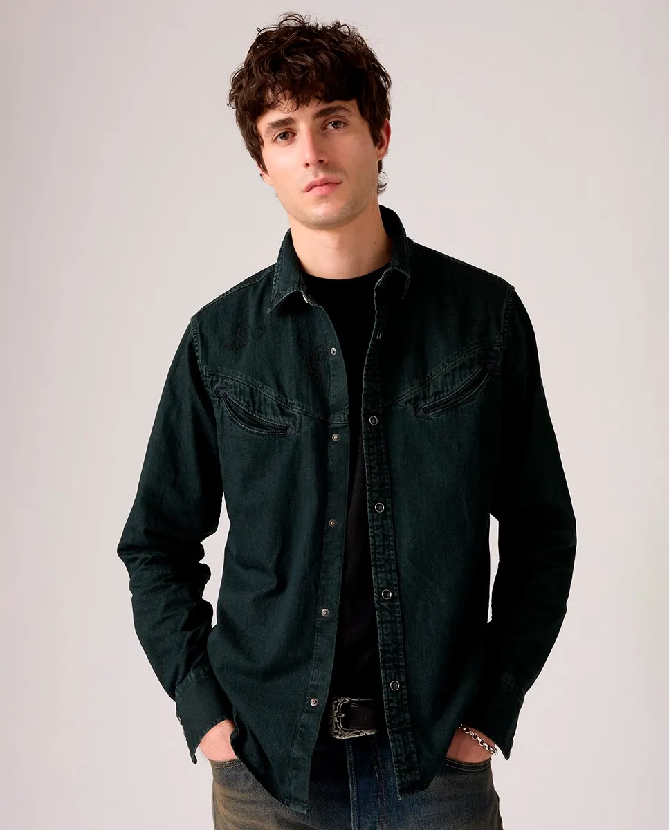 Джинсовая рубашка с длинным рукавом, сшитая из 100% хлопка. С западными вышитыми деталями на груди и спине, имеет два кармана на груди и логотип бренда на боковом шве, передняя застежка на кнопки. Стандартная посадка.