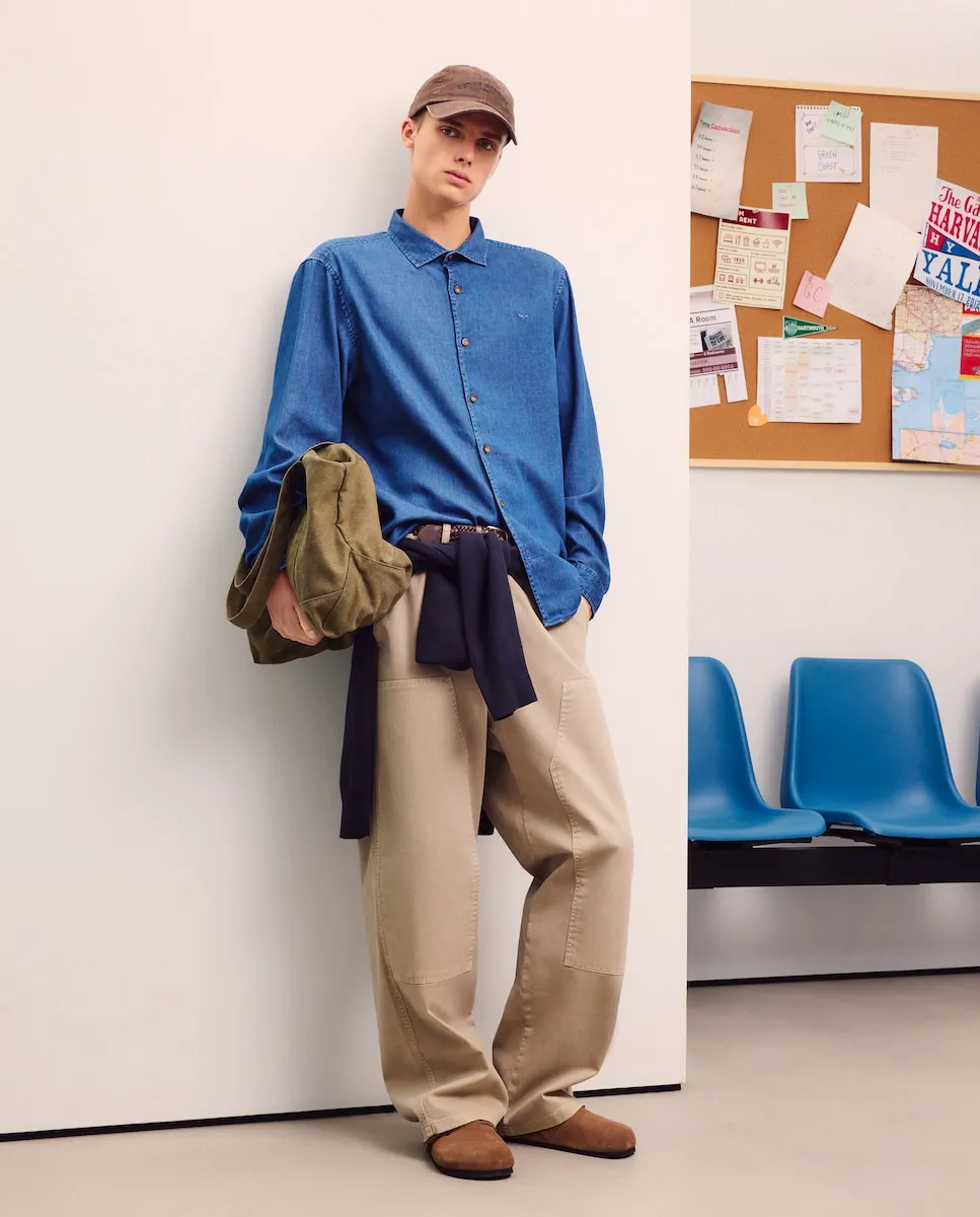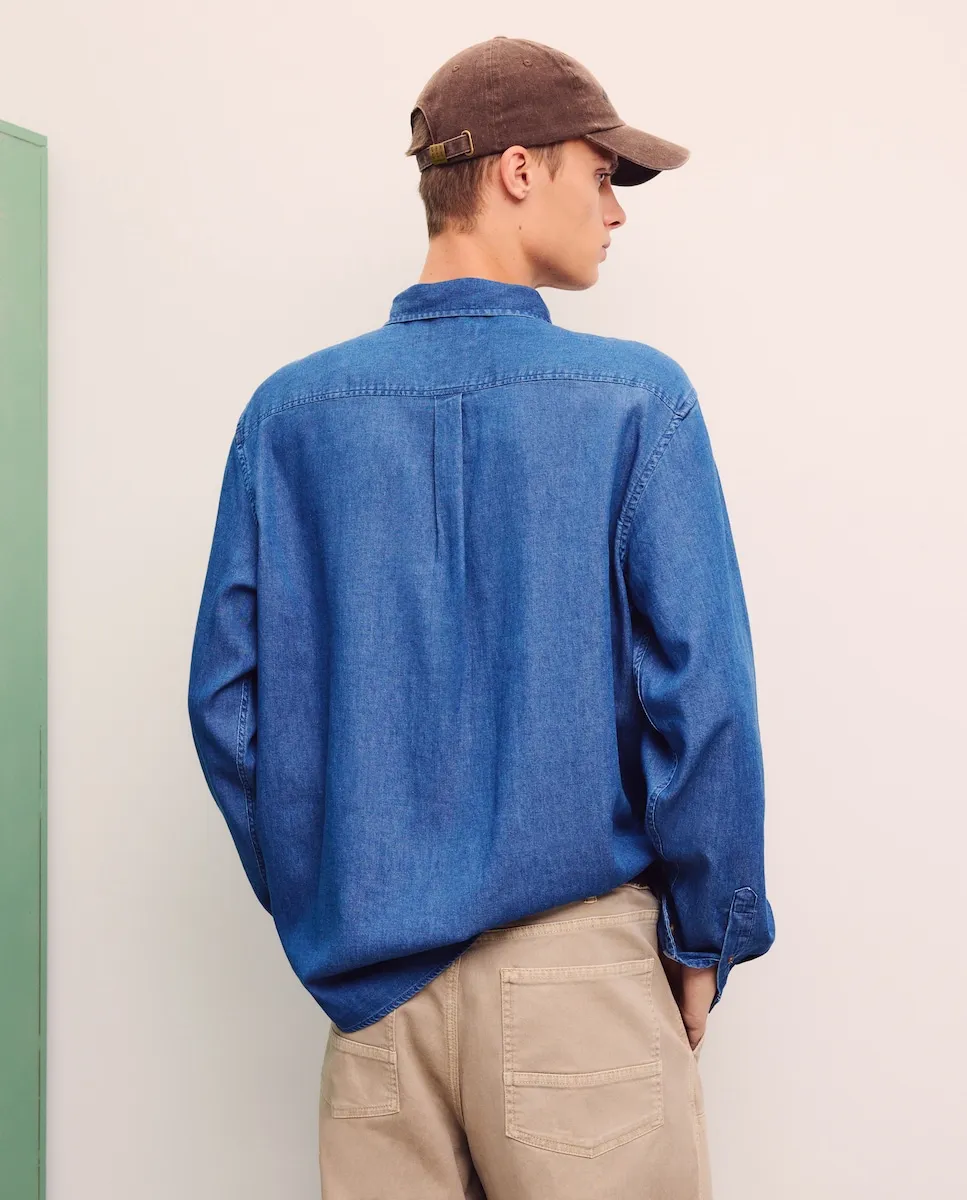 Мужская рубашка с длинным рукавом из легкого джинсового материала, воротник без пуговиц. Обычный крой. Вышитый логотип на груди.