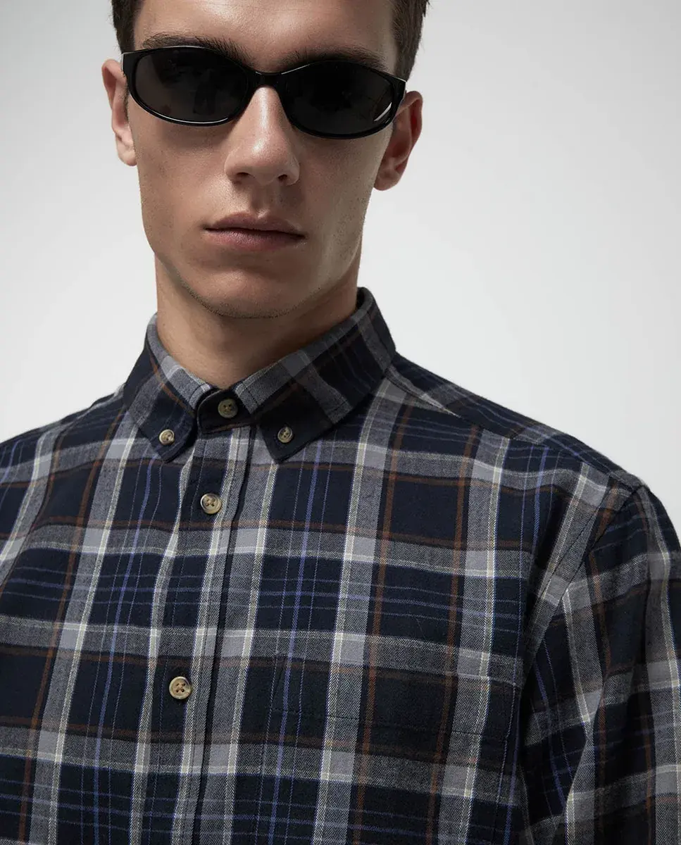 Фланелевая рубашка с длинными рукавами и клетчатым принтом. Застежка на пуговицы. 100% хлопок.