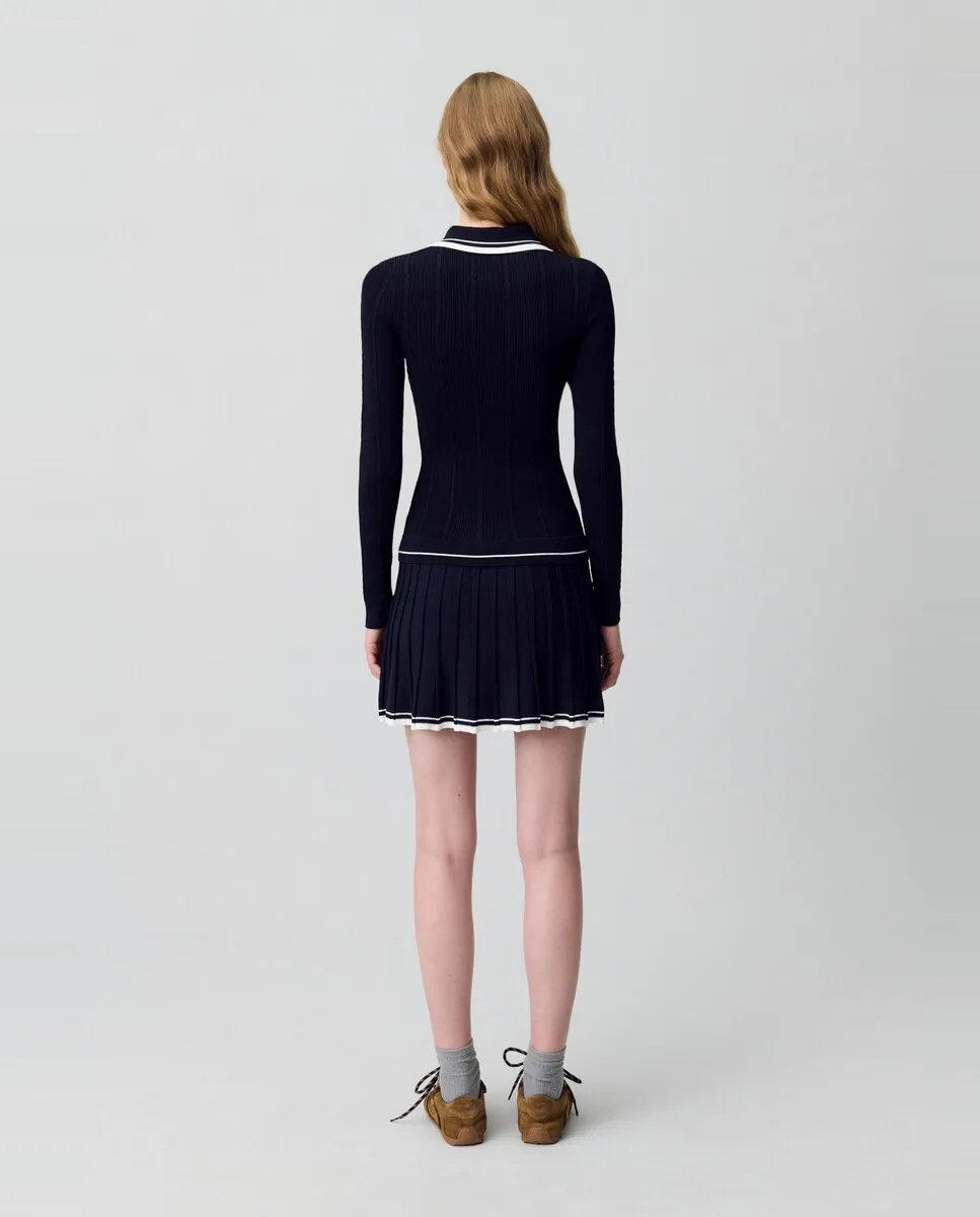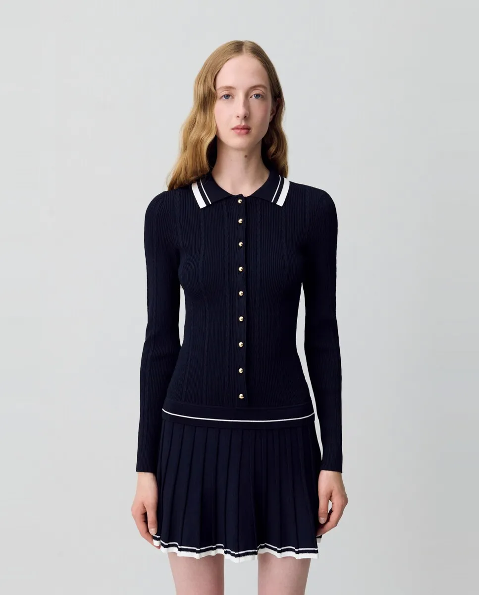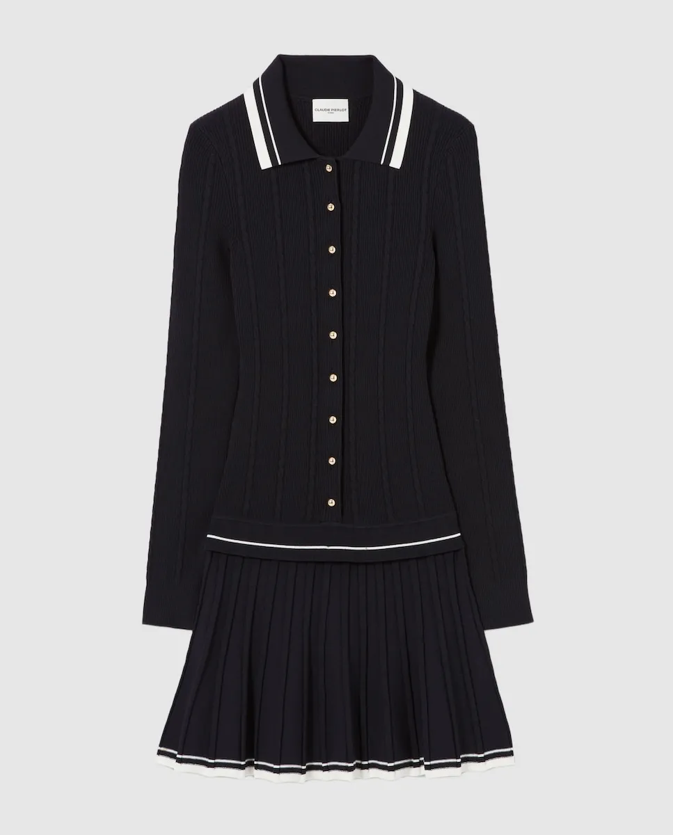 Вдохновленный знаменитыми американскими университетами, наш бренд создал силуэты с спортивным и уверенным стилем для повседневного ношения. Продемонстрируйте свою смелость с пересмотренными университетскими кодами, такими как поло Letterman и топы и платья с баской, и заявите о себе с нашими характерными принтами и вышивками в виде битов. В этом сезоне присоединяйтесь к Лиге плюща. Тонкое вязаное платье с длинным рукавом и контрастными деталями, короткая плиссированная юбка. Тонкое вязаное платье с длинным рукавом. Воротник-рубашка с контрастными полосками. Планка с 8 золотыми пуговицами в виде драгоценных камней. Короткая плиссированная юбка. Контрастные полоски на подоле юбки. Планка с контрастными полосками на талии. Вязальная техника с ребристой отделкой и косами.