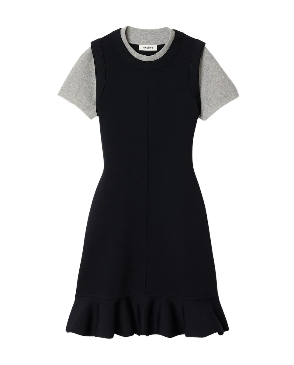 Короткое трикотажное платье с эффектом 2 в 1, с контрастным вырезом и рукавами, украшенное небольшой оборкой на подоле юбки. Короткое трикотажное платье Sandro для женщин. Приталенный и расклешенный покрой. Контрастный вырез и рукава. Круглый ворот. Короткий рукав. Небольшая оборка на подоле юбки.