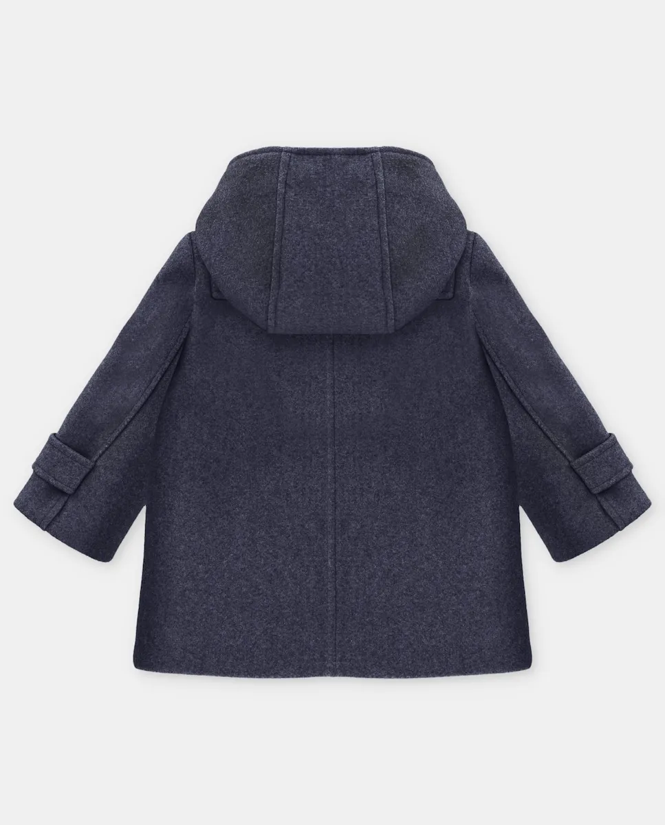 Детское пальто из твида с капюшоном, рубашечным воротником, внутренней молнией, застежкой на деревянные пуговицы, передними карманами и тисненым логотипом на кожаной бирке, темно-синего цвета. Сделано в Испании.