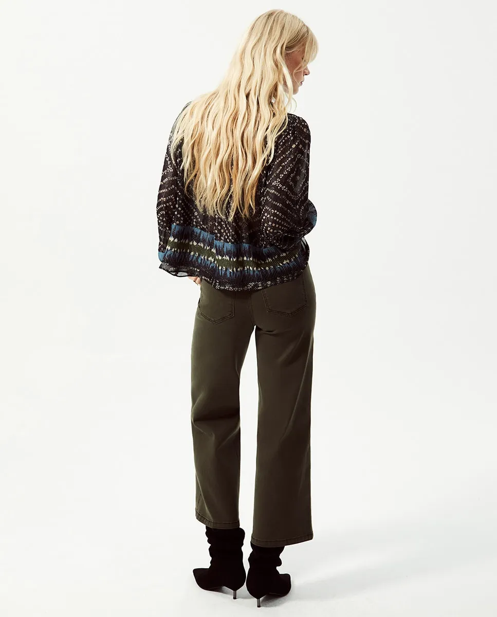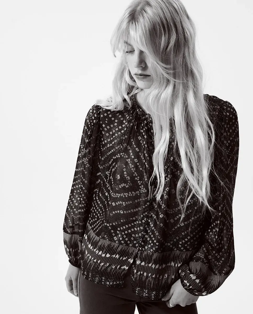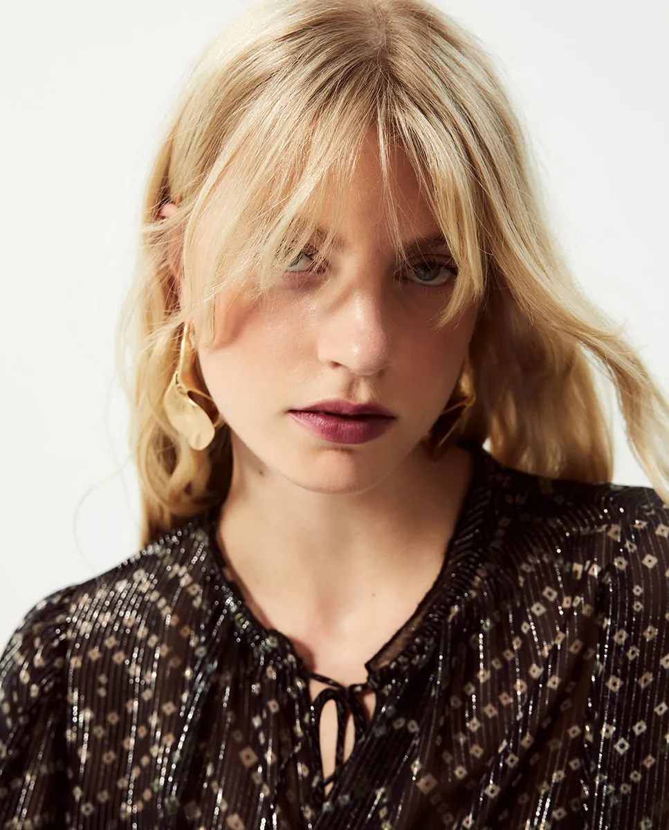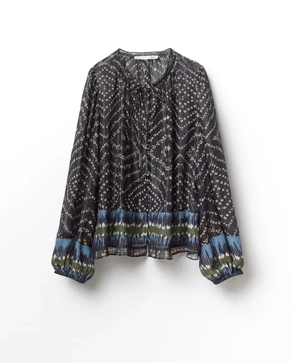 Блузка с длинным рукавом-фонариком и эластичными манжетами. Деталь с завязкой на шее и ткань с добавлением люрекса.