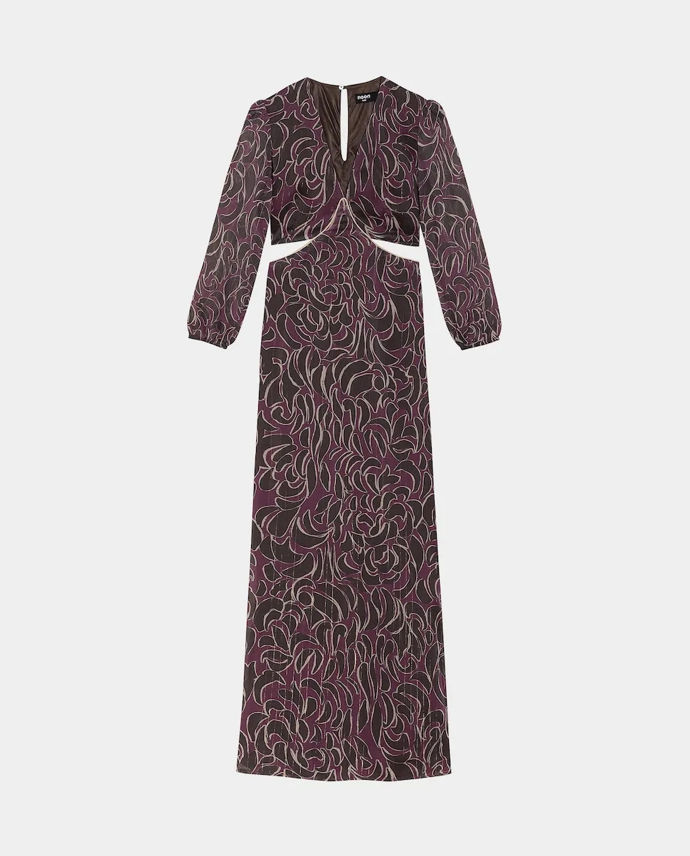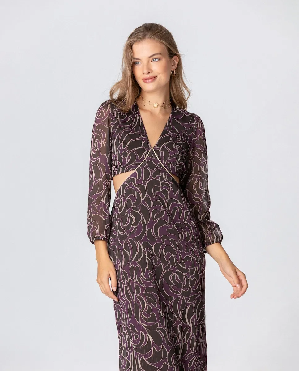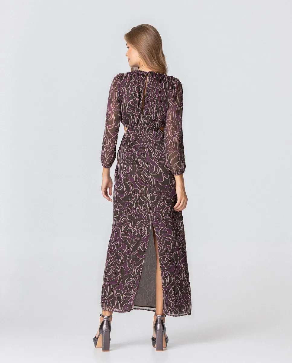 Длинное платье с принтом в фиолетовых тонах с разрезами спереди. Длинные пышные прозрачные рукава. Ненавязчивый V-образный вырез и застежка на пуговицу сзади. Идеально подходит для любой вечеринки, мероприятия или особого случая!