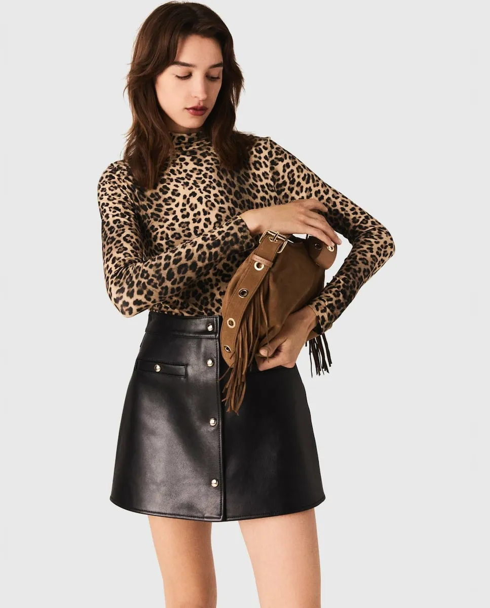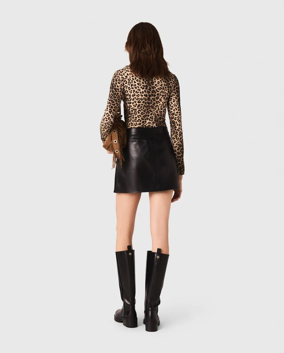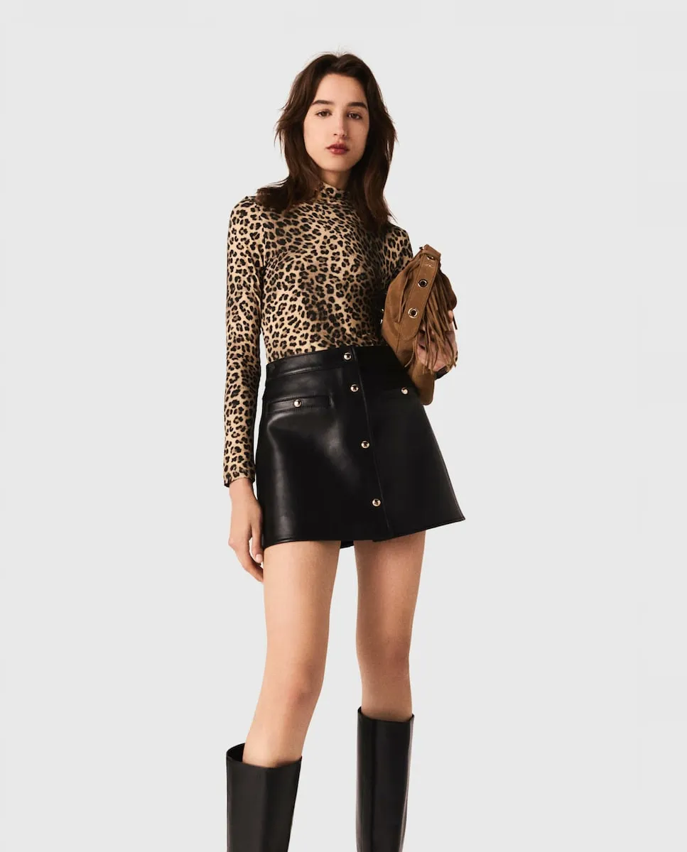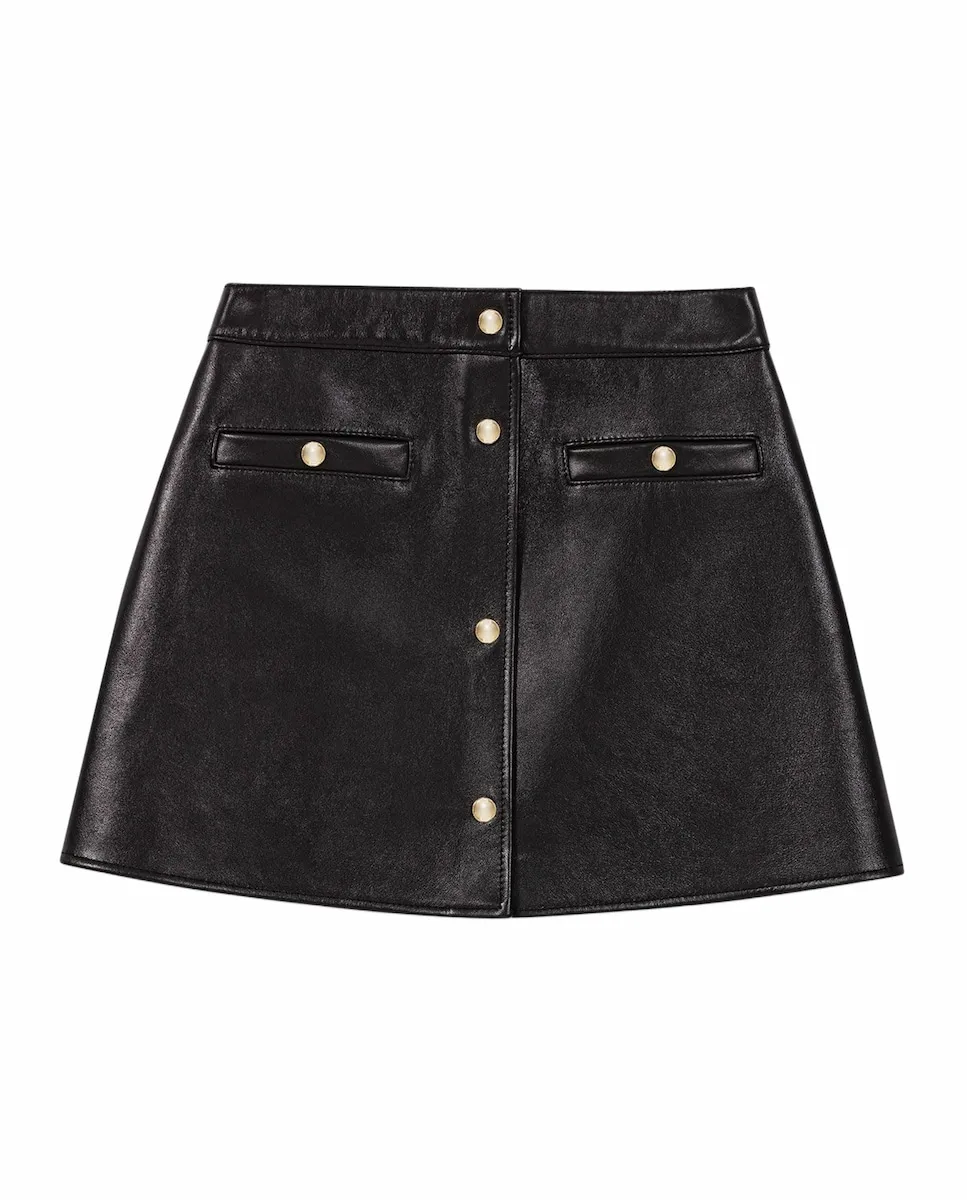 Прямая короткая юбка из гладкой кожи. Застежка-молния на спине. Два накладных кармана спереди. Декоративные золотые пуговицы. Maje переосмысливает базовые вещи гардероба со стилем, добавляя изысканные детали и идеально переработав крои. Ключевая вещь с ретро-современным шармом: эта короткая кожаная юбка воплощает графическую смелость сезона. Прямой силуэт и выраженный минимализм подчеркивают изысканную отделку: золотые пуговицы. Стиль структурированный, кожа мягкая и гибкая, повторяет каждый движение. Сочетайте ее с топом с леопардовым принтом для акцента в образе, высокими черными ботфортами на широком каблуке и дизайнерской сумкой с бахромой.
