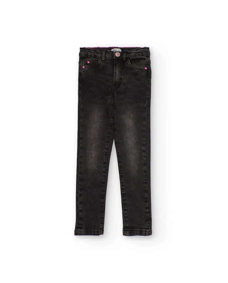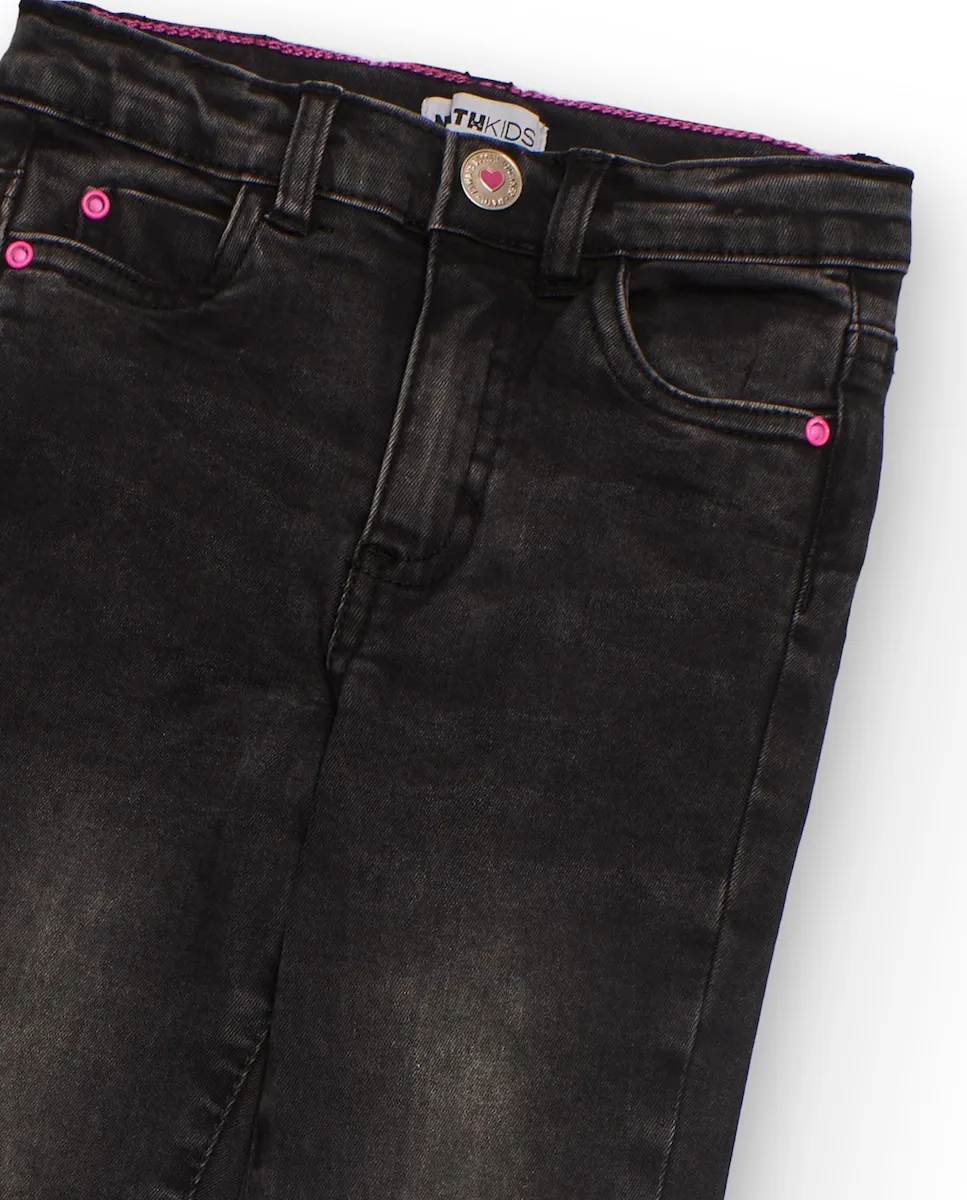 Обтягивающие джинсы для девочки черного цвета с эффектом потертости. Имеют застежку на металлическую пуговицу, функциональные передние и задние карманы, а также розовые детали на швах и заклепках, которые придают образу женственность и современность. Приталенный крой обеспечивает удачную посадку, идеально сочетаясь с любыми вещами.