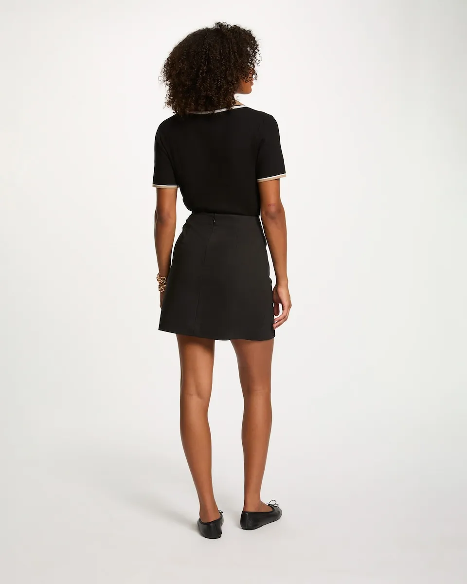 Эта короткая и облегающая юбка подчеркивает изгибы с женственностью. Пуговицы добавляют изысканный штрих, а ее плавный крой сопровождает каждое движение с элегантностью. Ее короткая форма воплощает современный стиль, идеально подходящий для всех ваших желаний иметь выразительный образ. - Короткая юбка. - Облегающий крой. - Плавный силуэт. - Стандартная посадка. - Пуговицы. Идеи для образа. - Плавная юбка сочетается с приталенной футболкой и кроссовками для стиля casual chic, дополненного изящными украшениями. - Эту короткую юбку носят с воздушной блузкой, приталенной курткой и элегантными ботильонами, чтобы подчеркнуть всю ее современную смелость. Советы по уходу. Стирать юбку при 30°C в деликатном режиме, чтобы сохранить волокна ткани. Глажка возможна: используйте низкую температуру (максимум 110°) и не применяйте пар, так как это крайне не рекомендуется. Не сушите изделие в сушильной машине, это также крайне не рекомендуется.