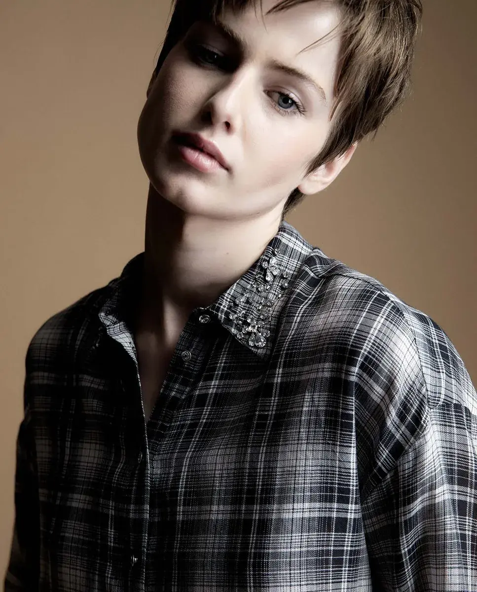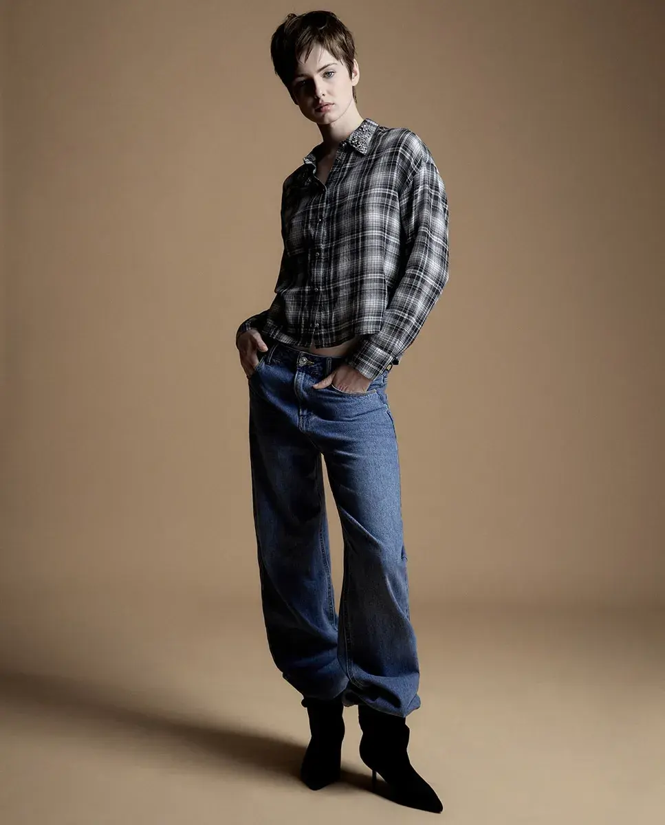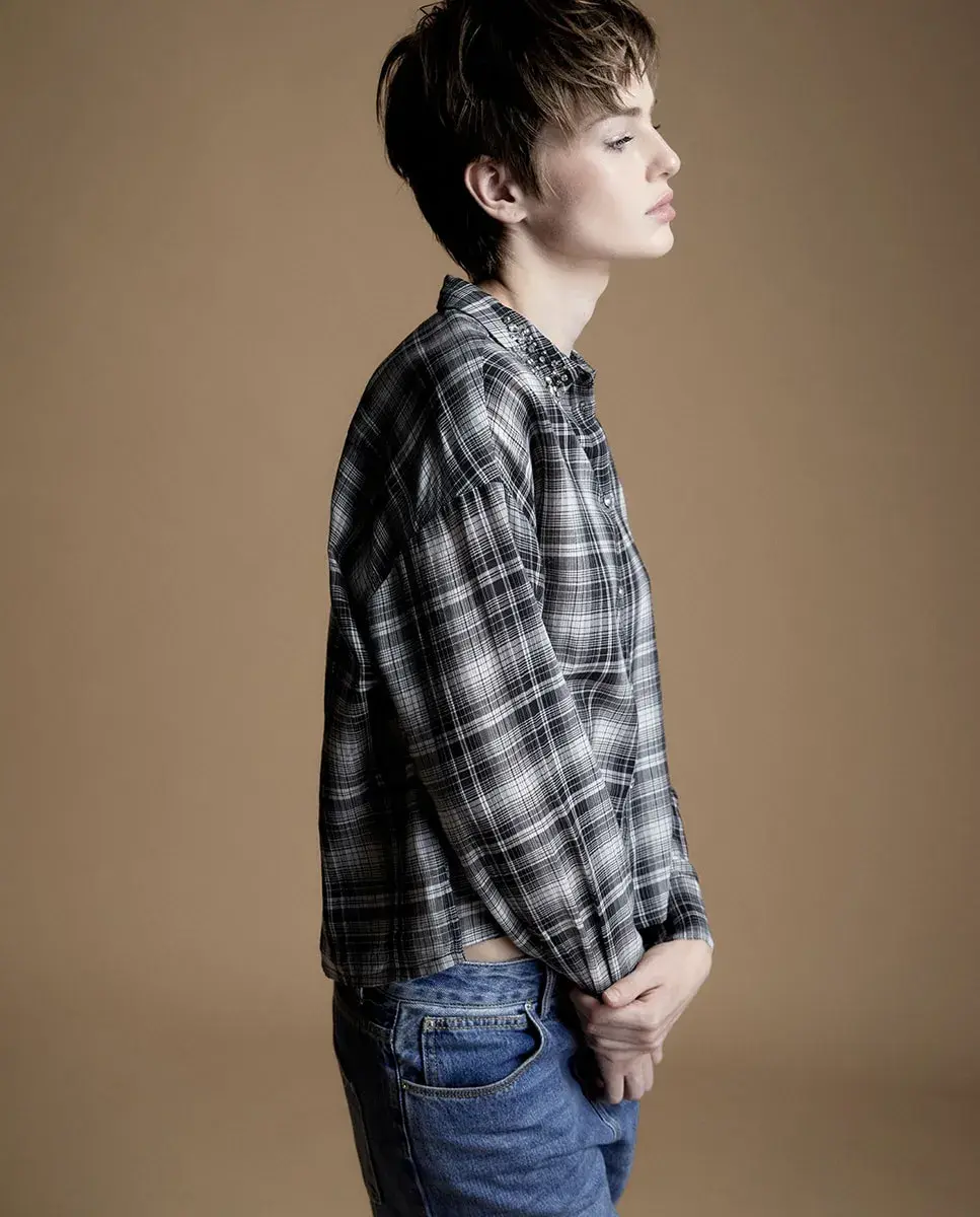 Рубашка в клетку с длинными рукавами и блестящей деталью на воротнике. Застежка на пуговицы. 100% хлопок