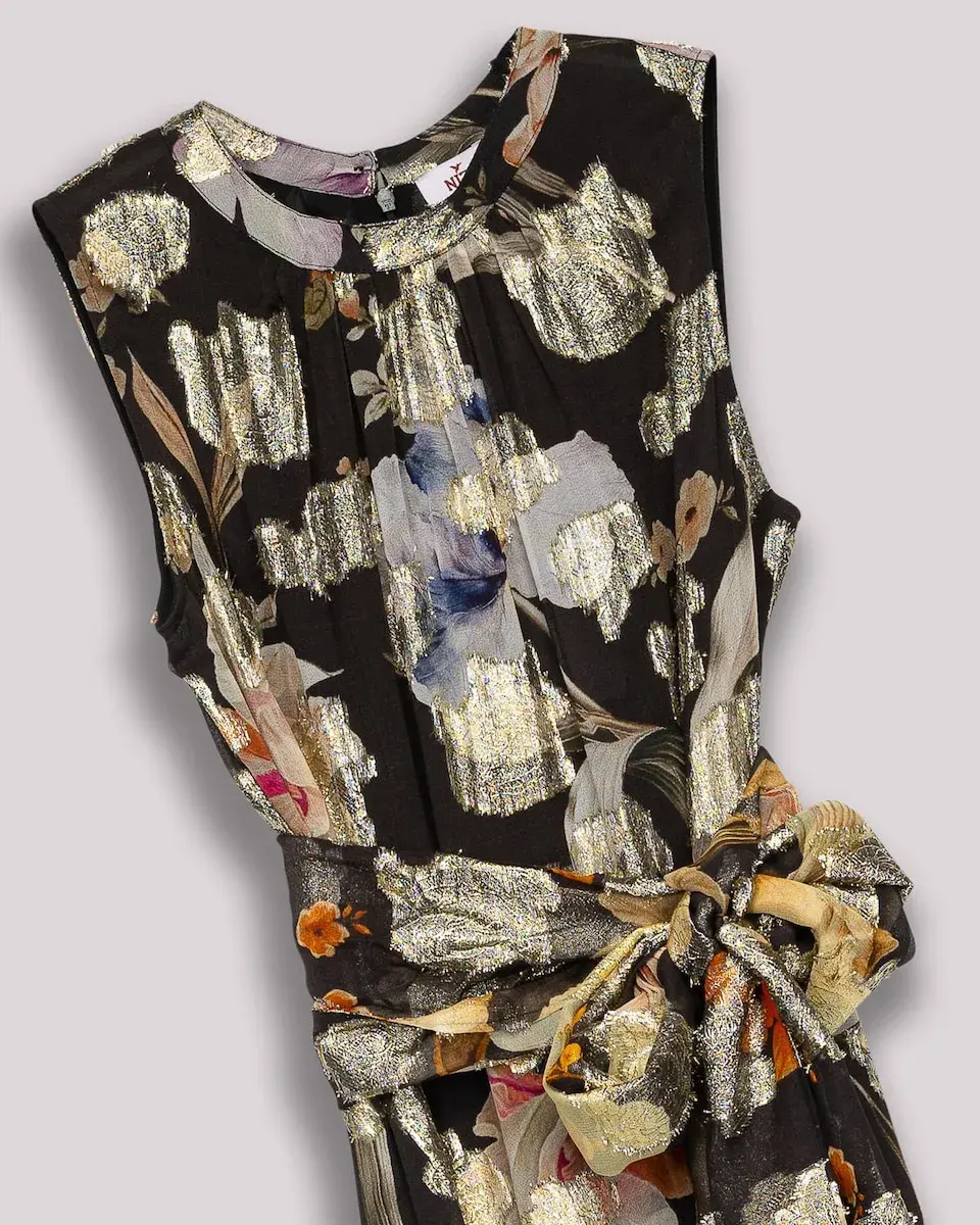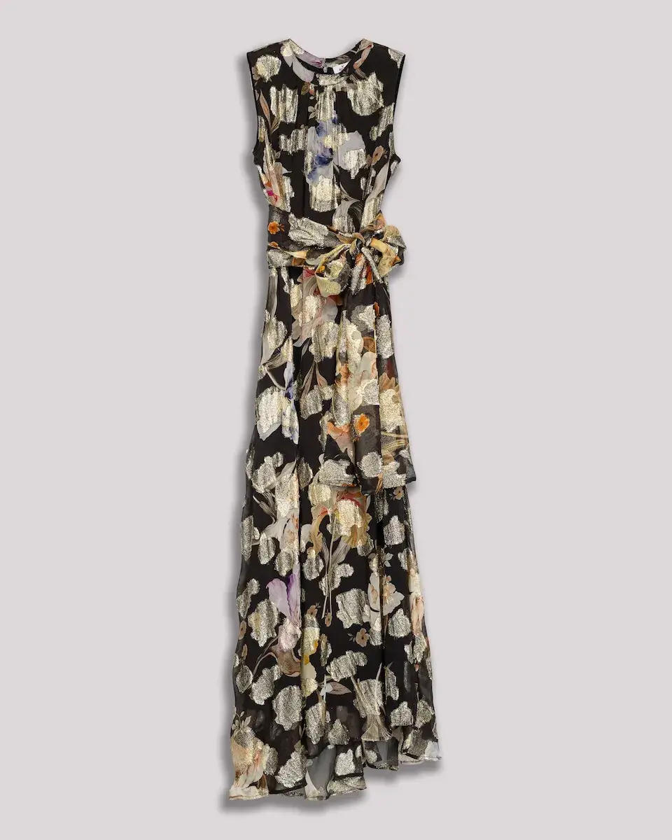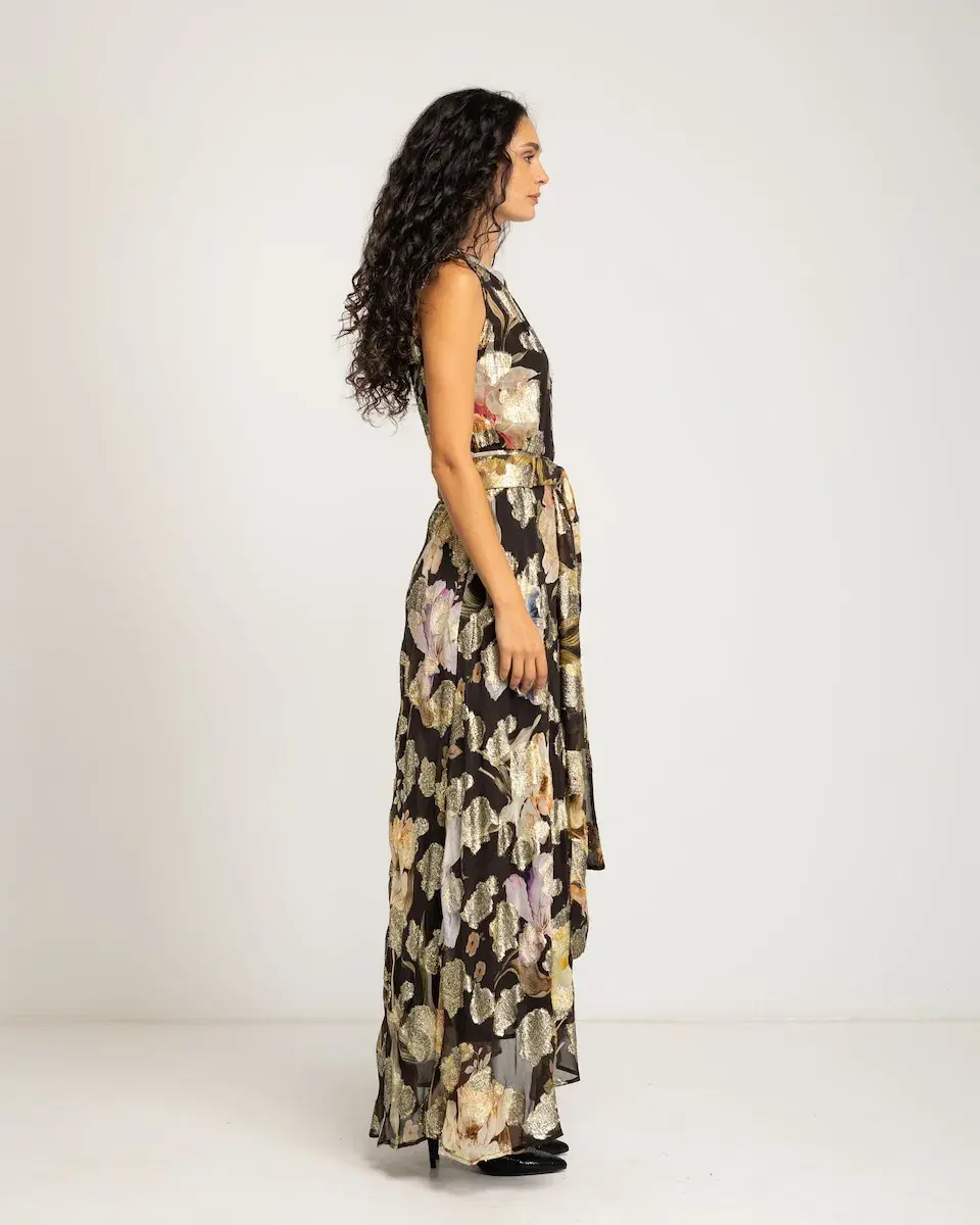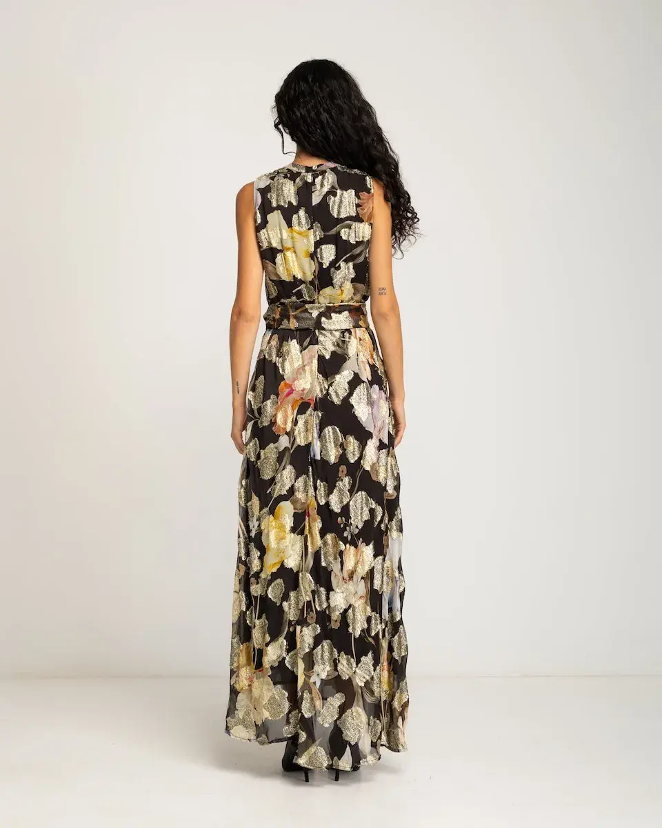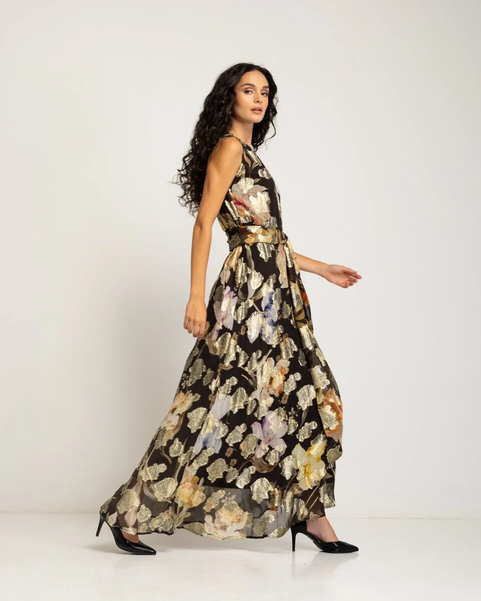 Это длинное платье впечатляет своим металлическим цветочным принтом на темном фоне. Свободного кроя, без рукавов и с поясом в тон, оно является надежным выбором для особых событий, добавляя свет и естественную изысканность.