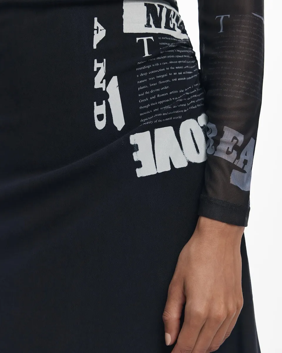 Платье с длинными рукавами, присборенное, с V-образным вырезом и боковыми сборками, однотонное и с газетным принтом. Газетный принт. Крой: облегающий. Рукав: длинный. Длина: миди. Застежка: молния. Вискоза Lenzing EcoVero.