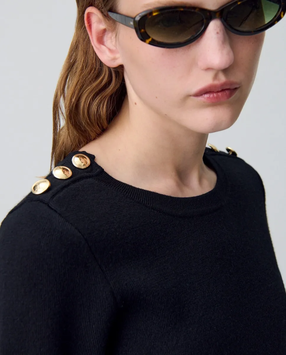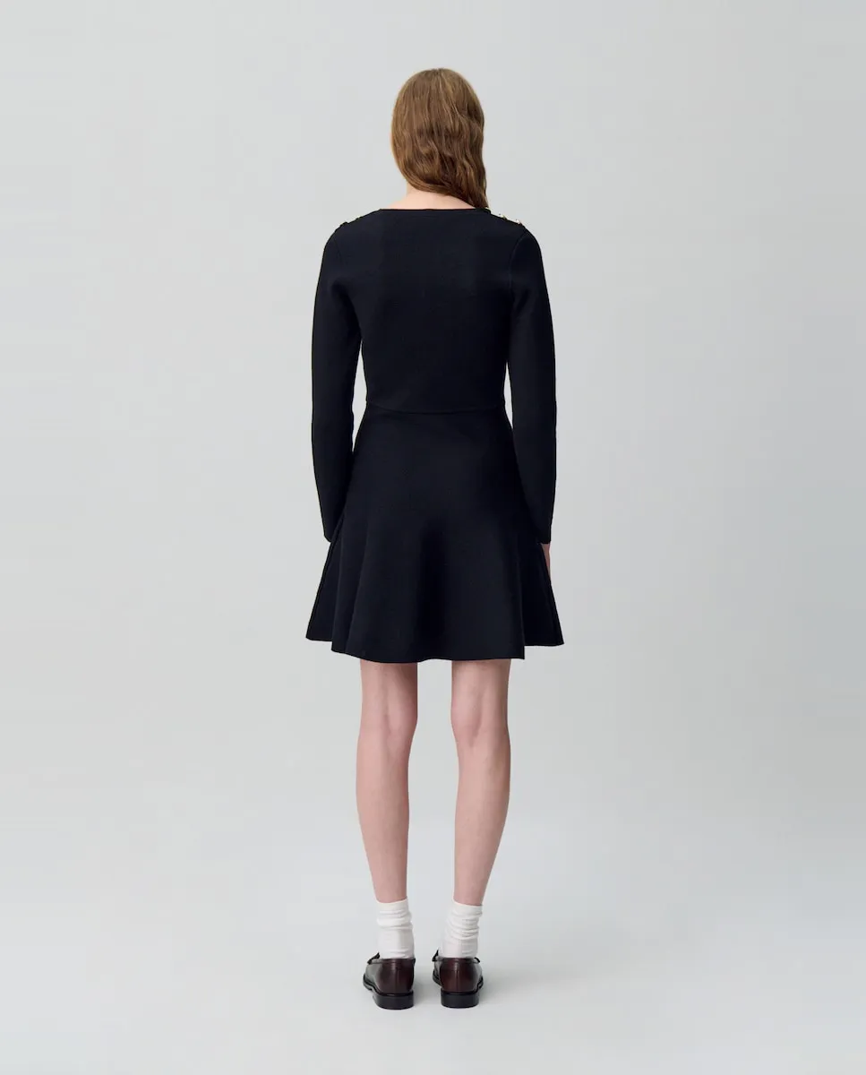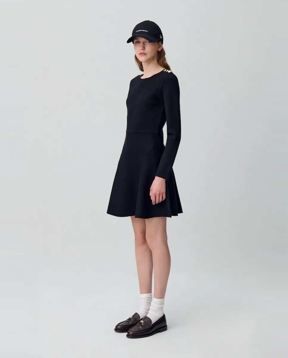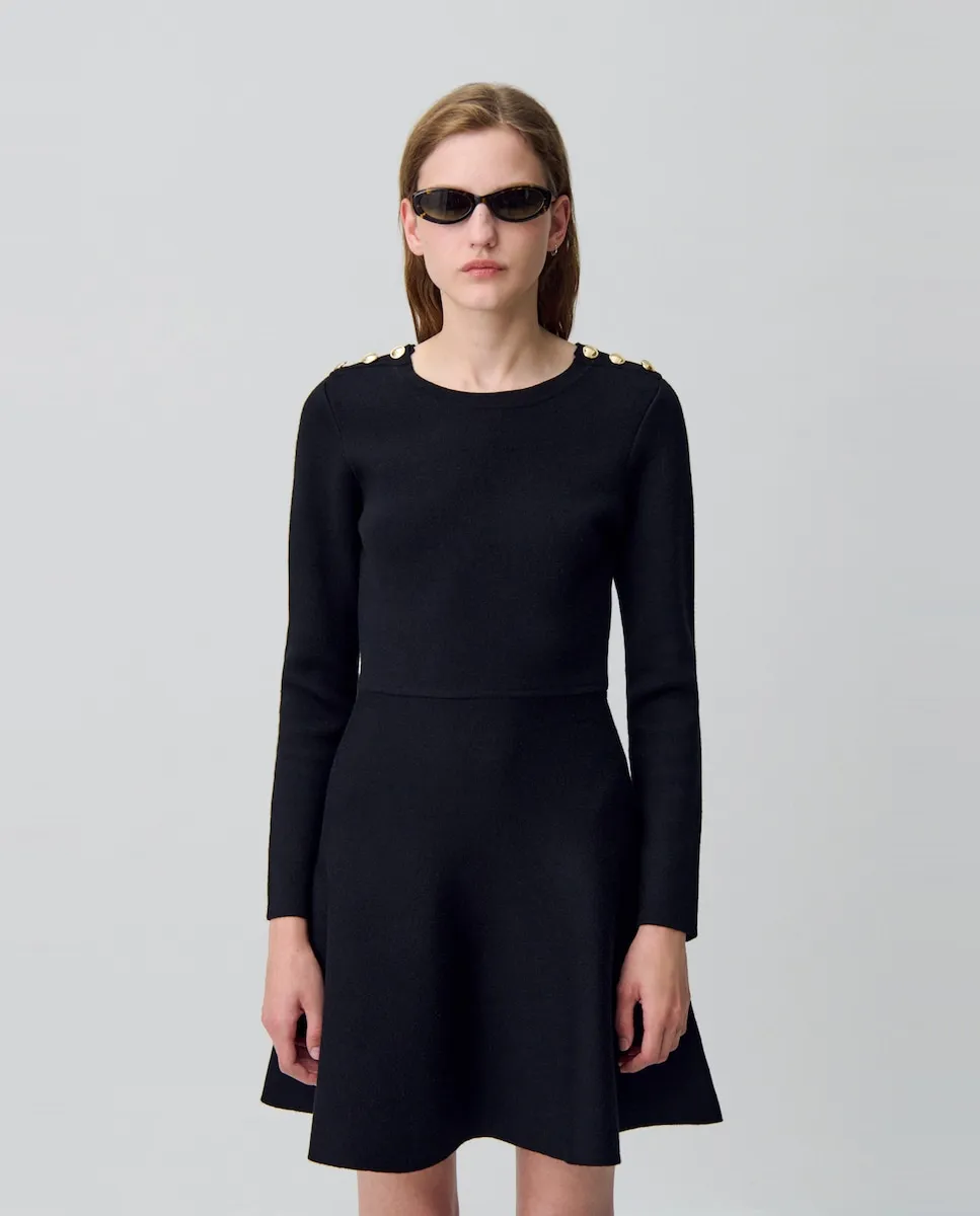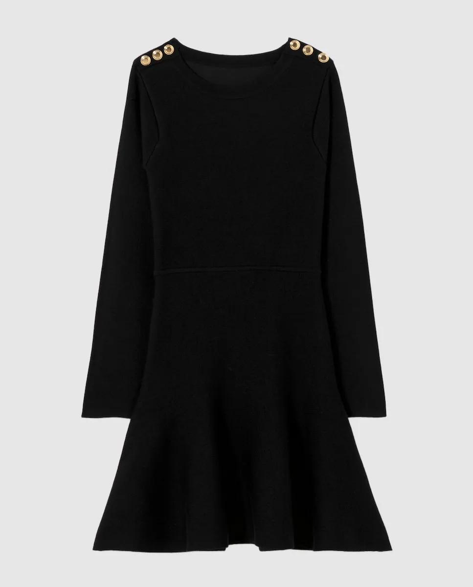 Воплощение английской провинции, наше ателье вновь осмыслило дух коттеджа через современную интерпретацию. Гардероб контрастов, одновременно структурированный и текучий, с кроем иногда oversize, иногда острым, и пальто из меха, шерсти или искусственного меха. Силуэты, сочетающие традиционную элегантность с бескомпромиссной современностью. Платье из тонкого трикотажа с длинными рукавами и золотыми пуговицами на плечах. Платье из тонкого трикотажа с длинными рукавами. Круглый вырез. 3 золотые пуговицы на плечах. Приталенный крой в верхней части тела и на бедрах. Расклешенное внизу. Видимая шовная строчка на талии.