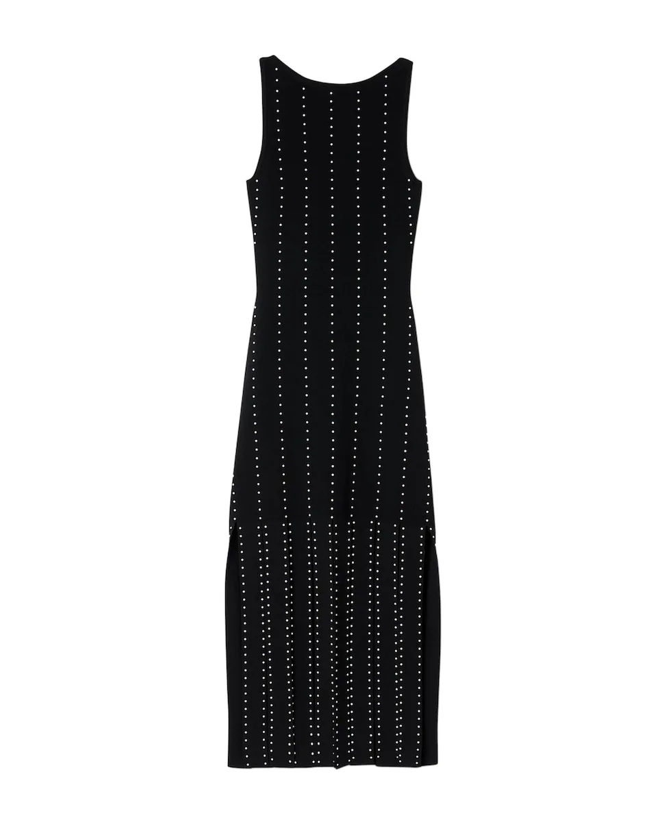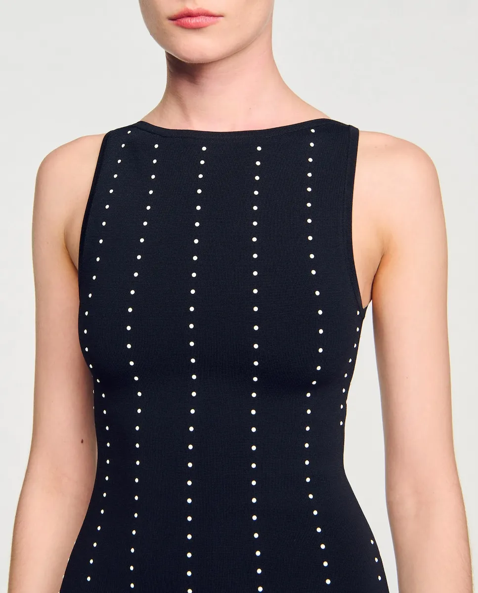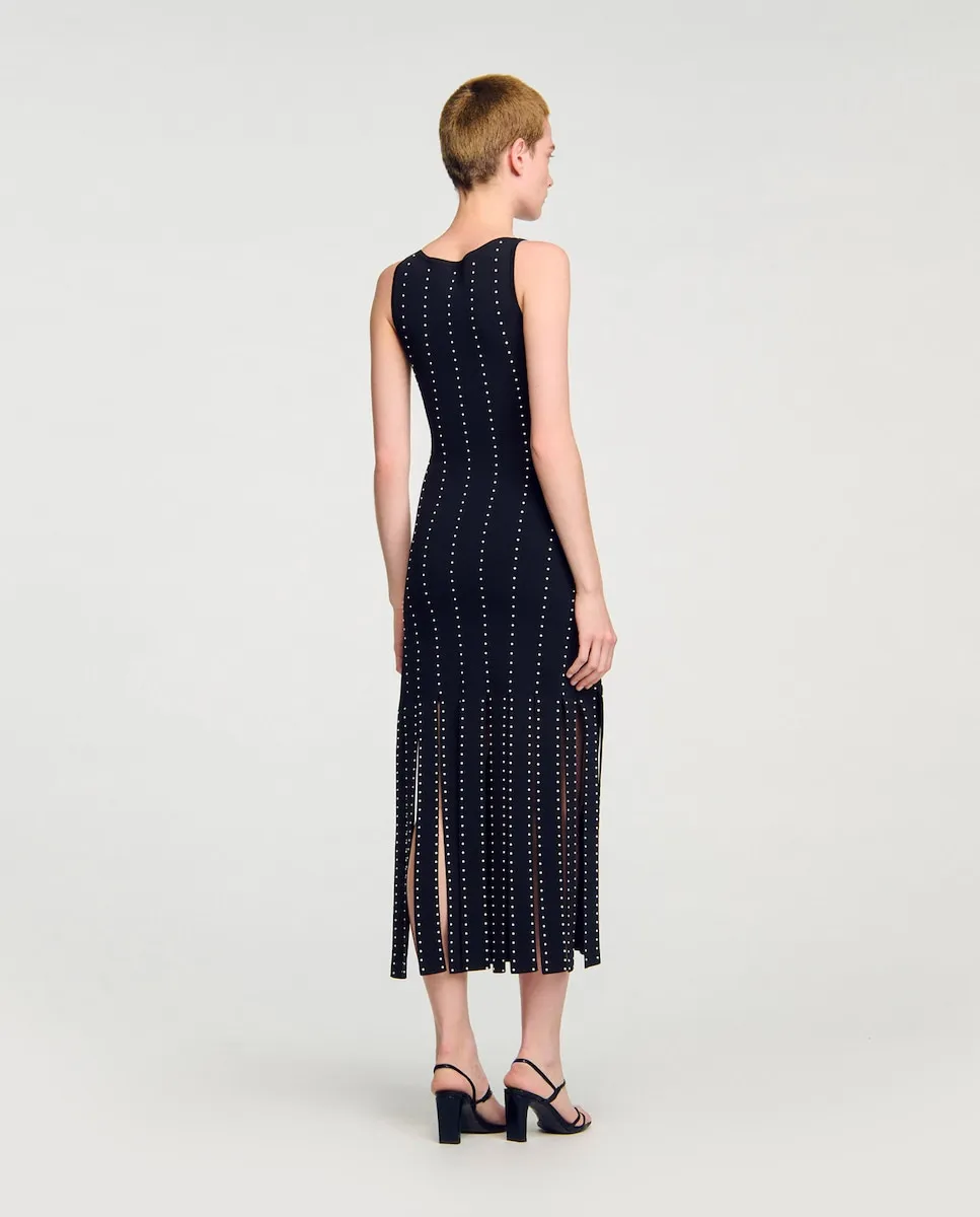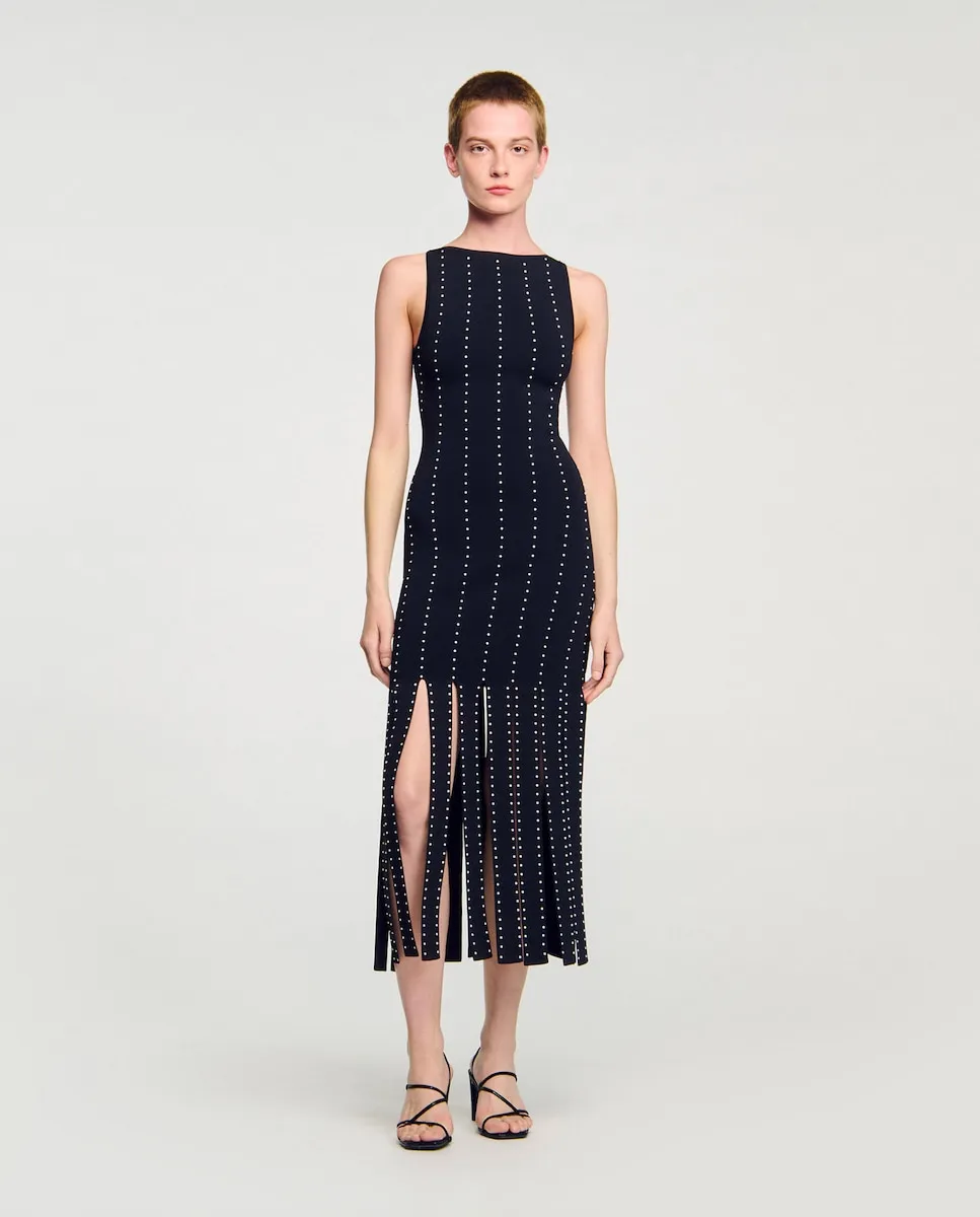 Длинное безрукавное платье из трикотажа с фантазийным краем, украшенное вертикальными линиями заклепок и лодочным вырезом. Длинное трикотажное платье Sandro Mujer. Лодочный вырез. Без рукавов. Вертикальные линии заклепок. Облегающий силуэт.