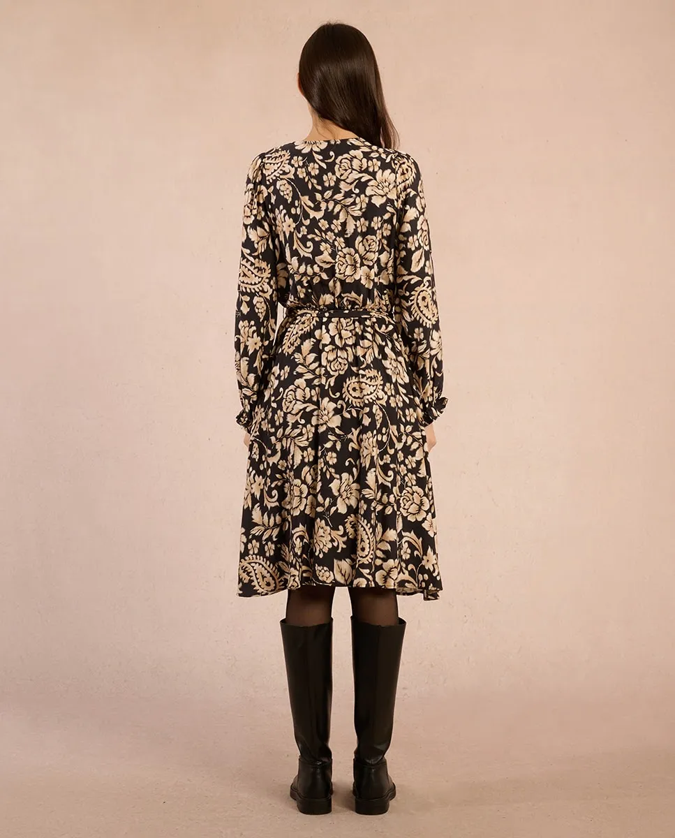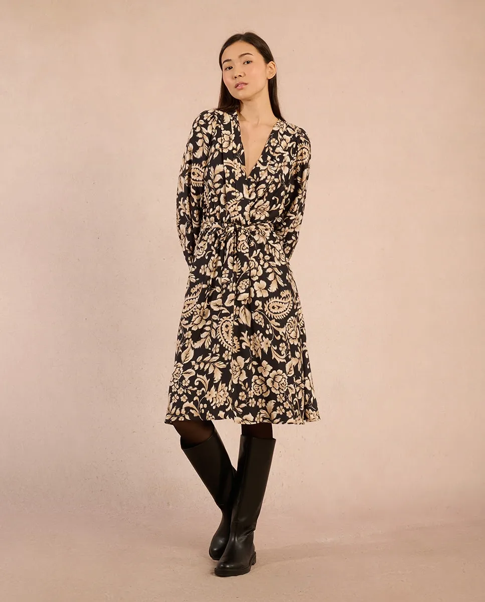 Платье с длинными рукавами, V-образным вырезом и рюшей по низу. Модель с узором в горох и рюшей по низу.