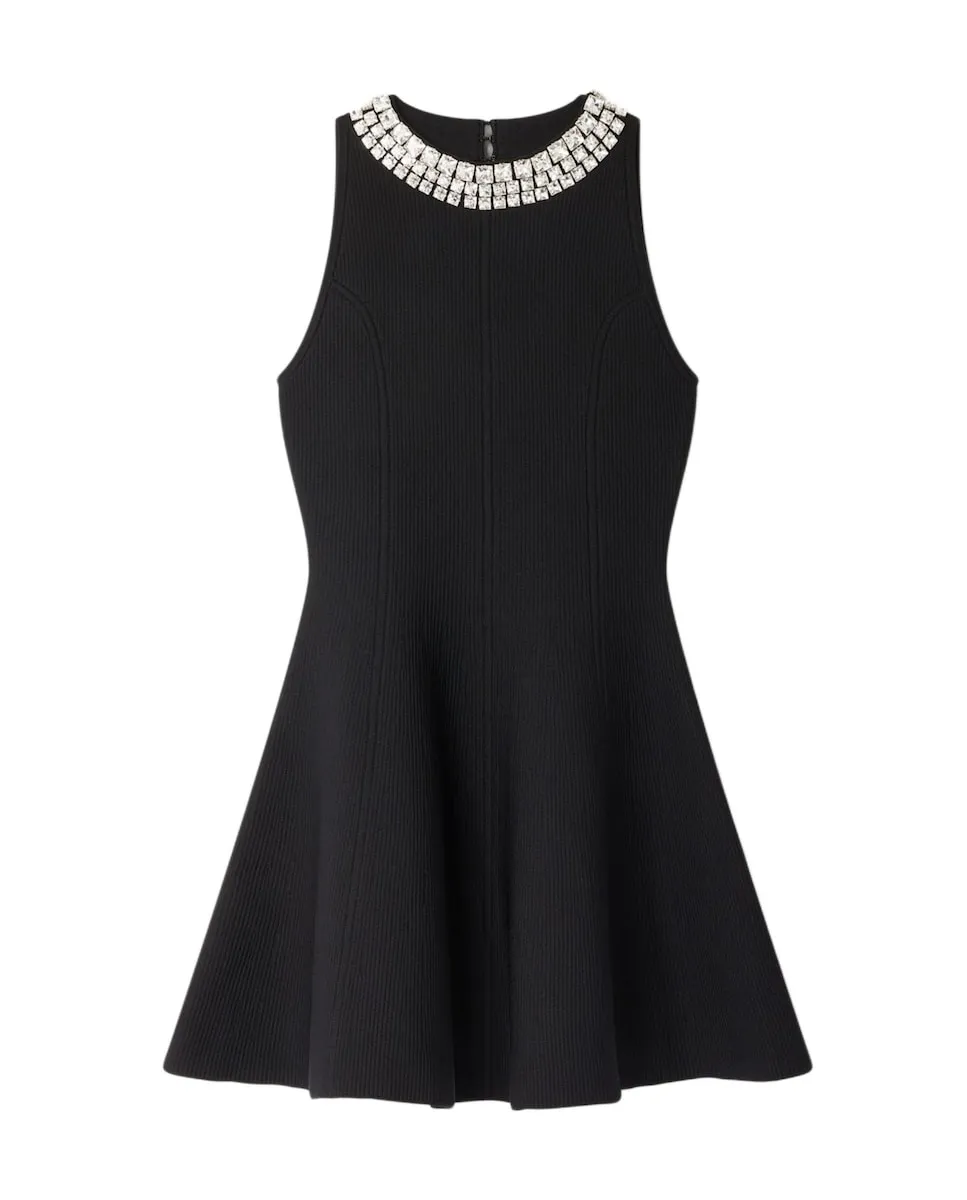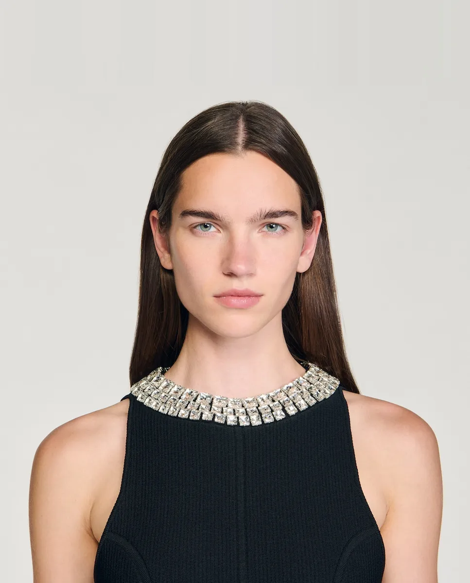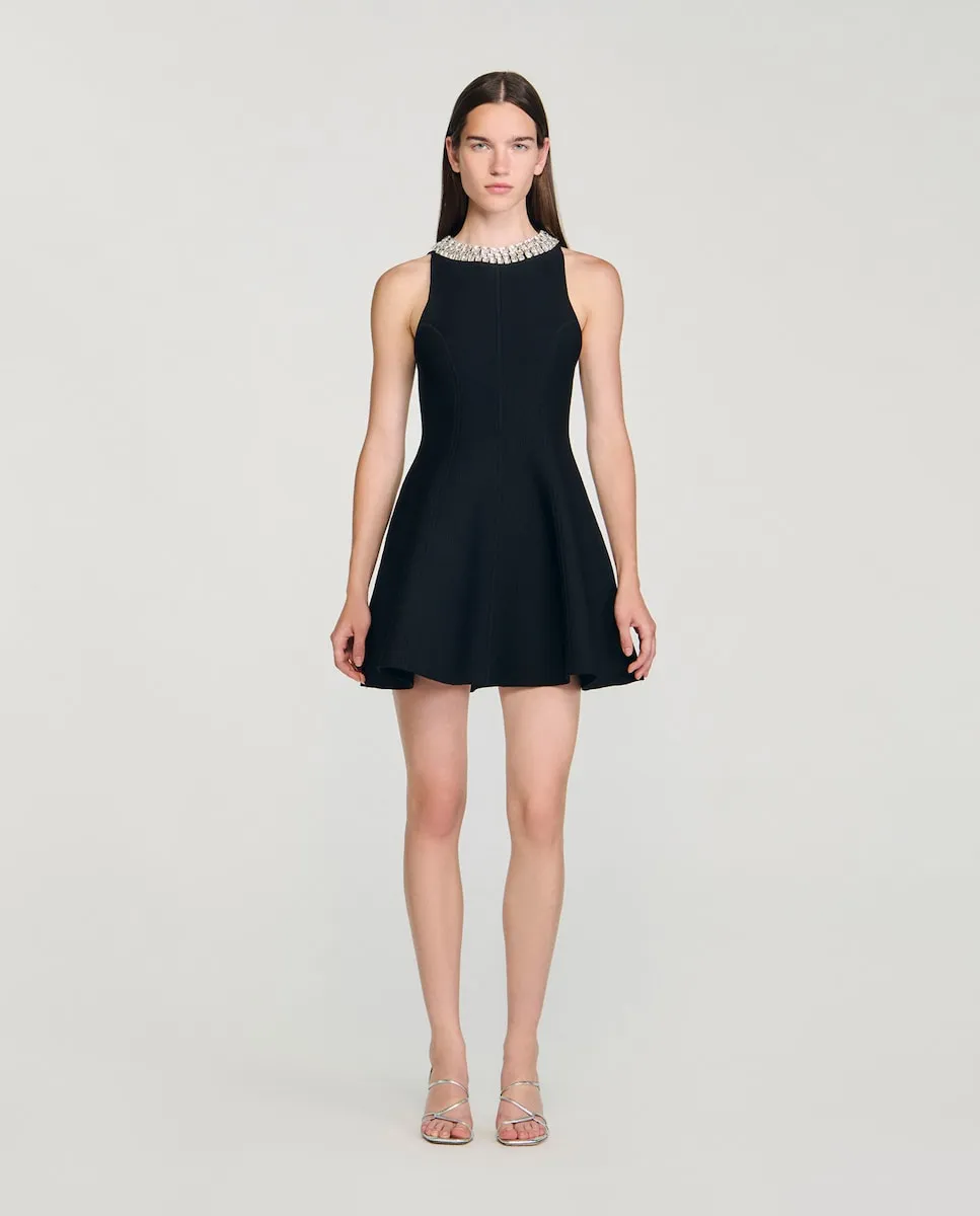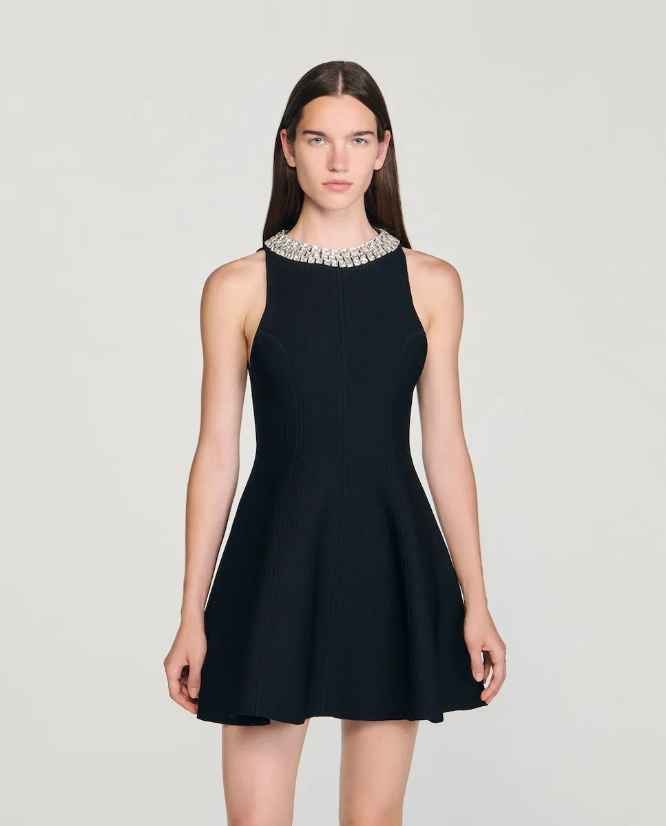 Короткое трикотажное платье без рукавов с высоким воротником, украшенным стразами, и расклешенной юбкой. Трикотажное платье Sandro для женщин. Высокий воротник украшен кабошонами из страз. Без рукавов. Принцессины вытачки. Застежка на крючки сзади. Расклешенный силуэт.