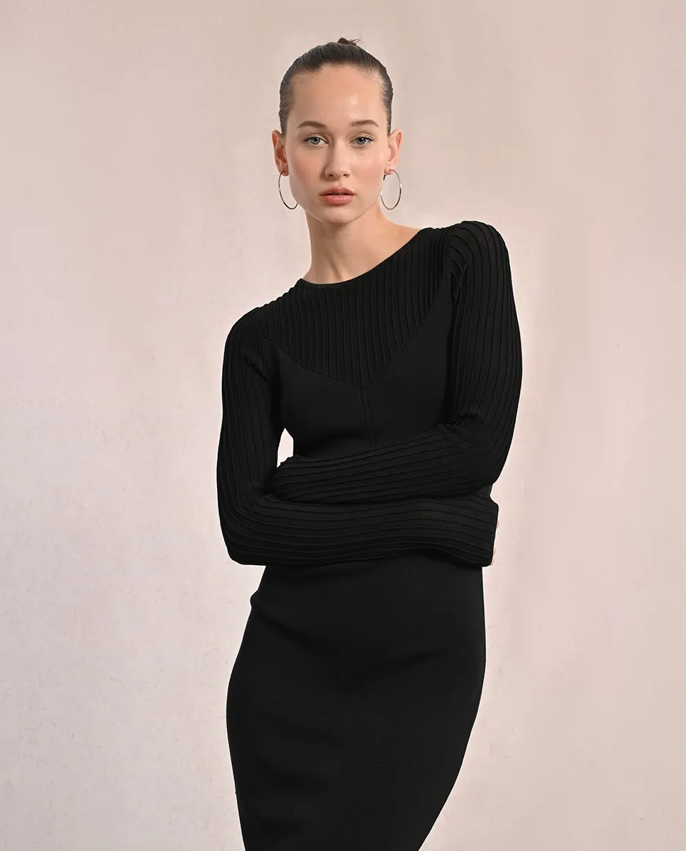 Миди-платье из трикотажа, с длинными рукавами и приталенным кроем. Модель выполнена из полупрозрачной ткани.