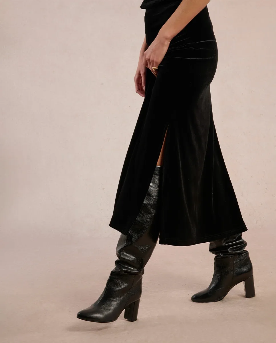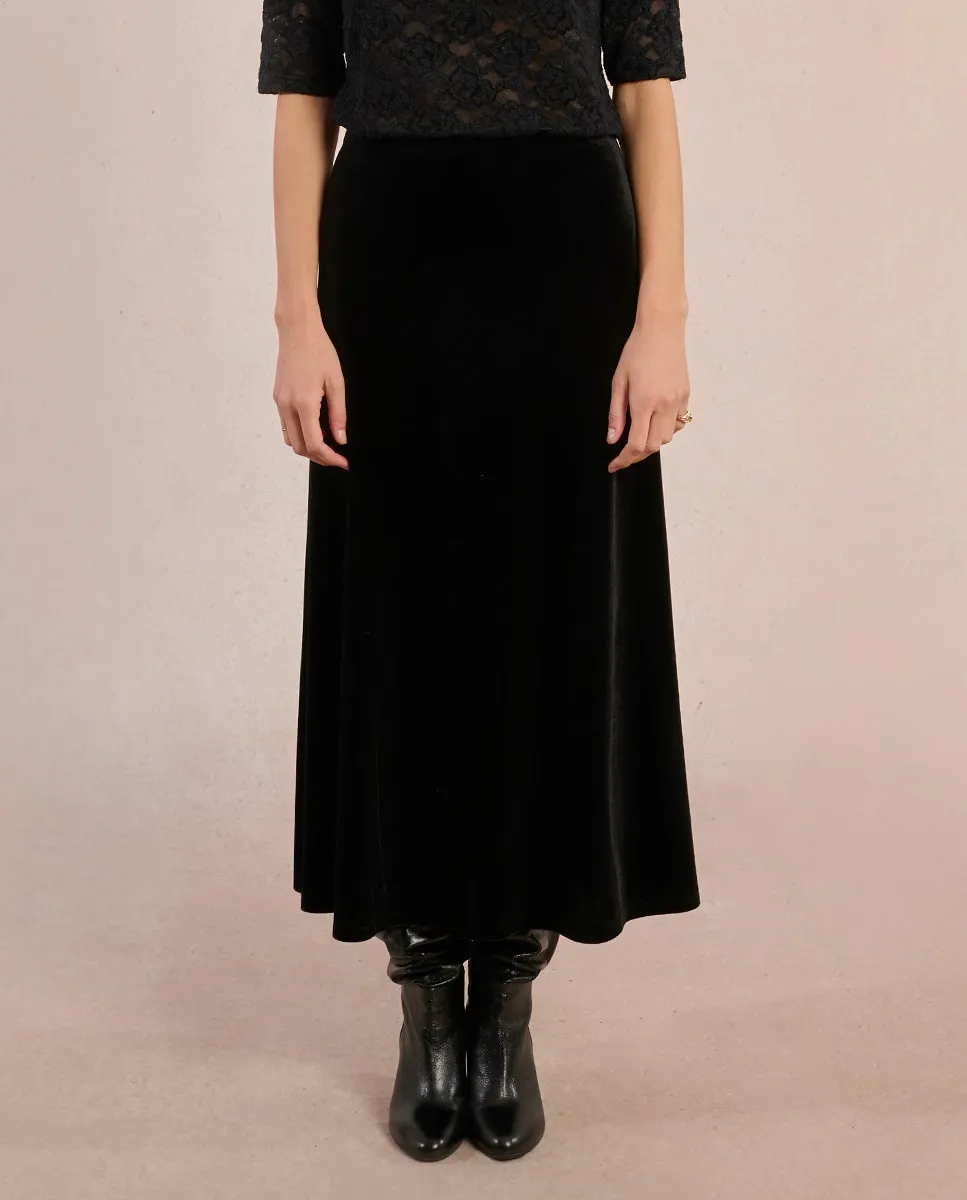 Длинная бархатная юбка с высокой посадкой и эластичной талией. Модель прямого кроя.