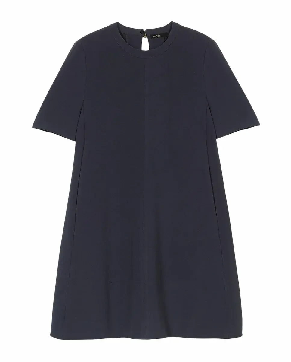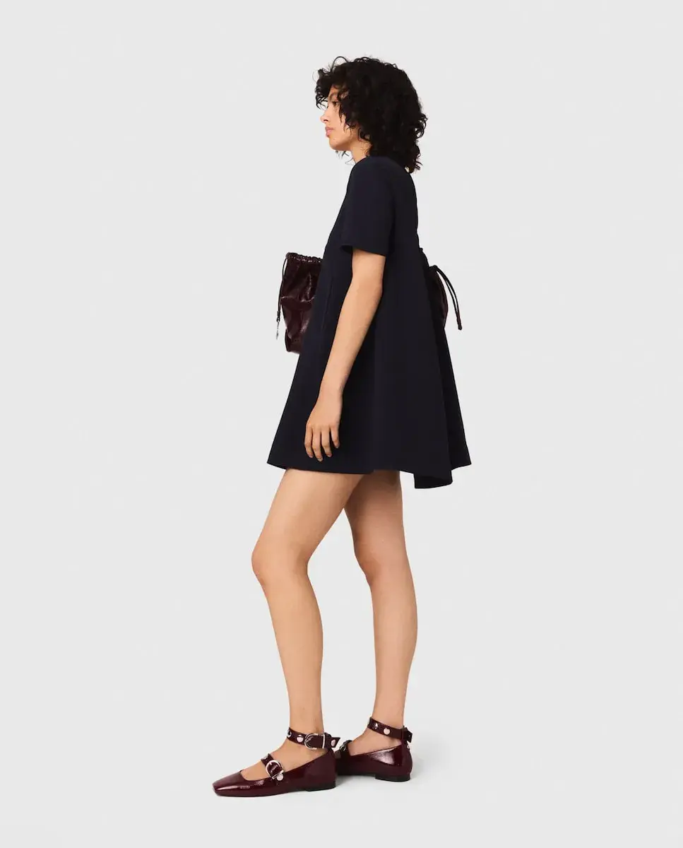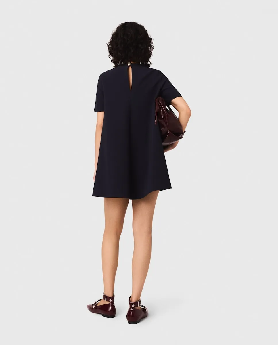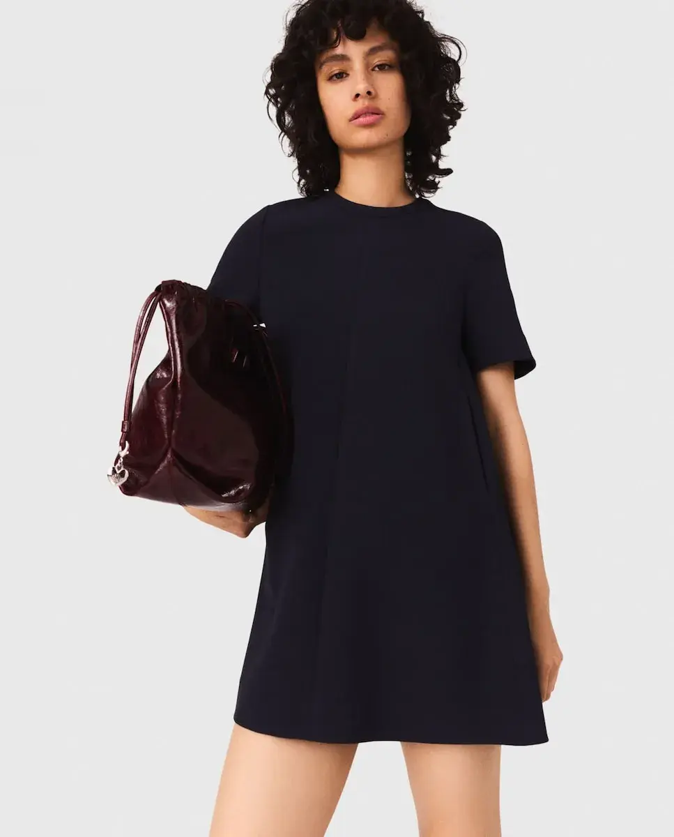 Короткое платье с круглым вырезом и короткими рукавами. Слегка расклешенный покрой. Два кармана по бокам. Коллекция делает ставку на простую элегантность, предлагая удобную одежду с чистыми линиями. Это короткое платье имеет слегка расклешенный покрой, сбалансированный короткими рукавами и структурированным круглым воротником. Для дополнения образа со знаковыми вещами сезона: бордовая сумка и соответствующие балетки.