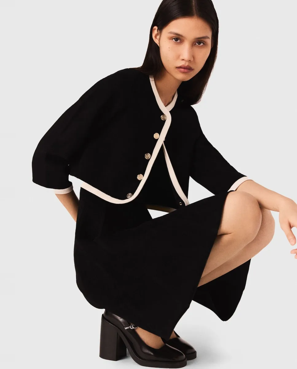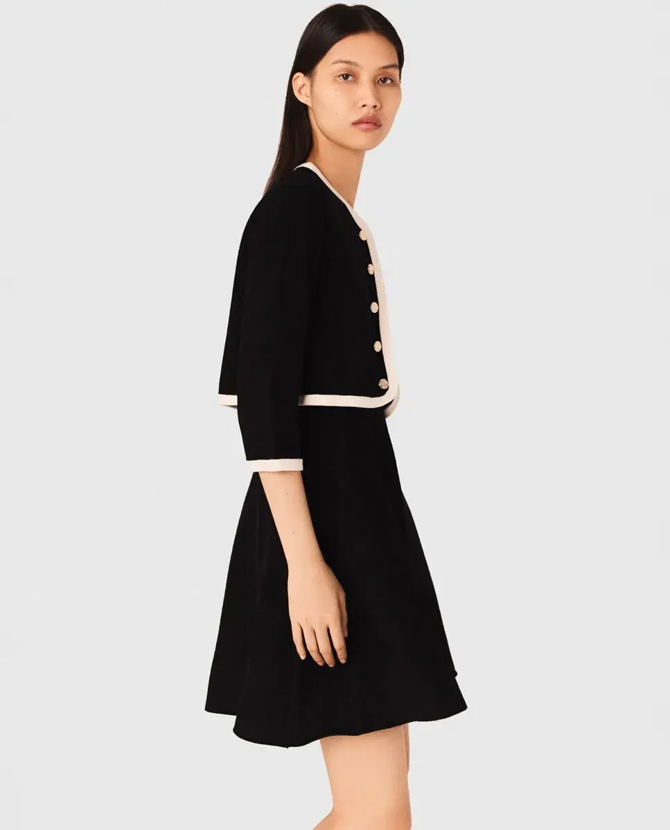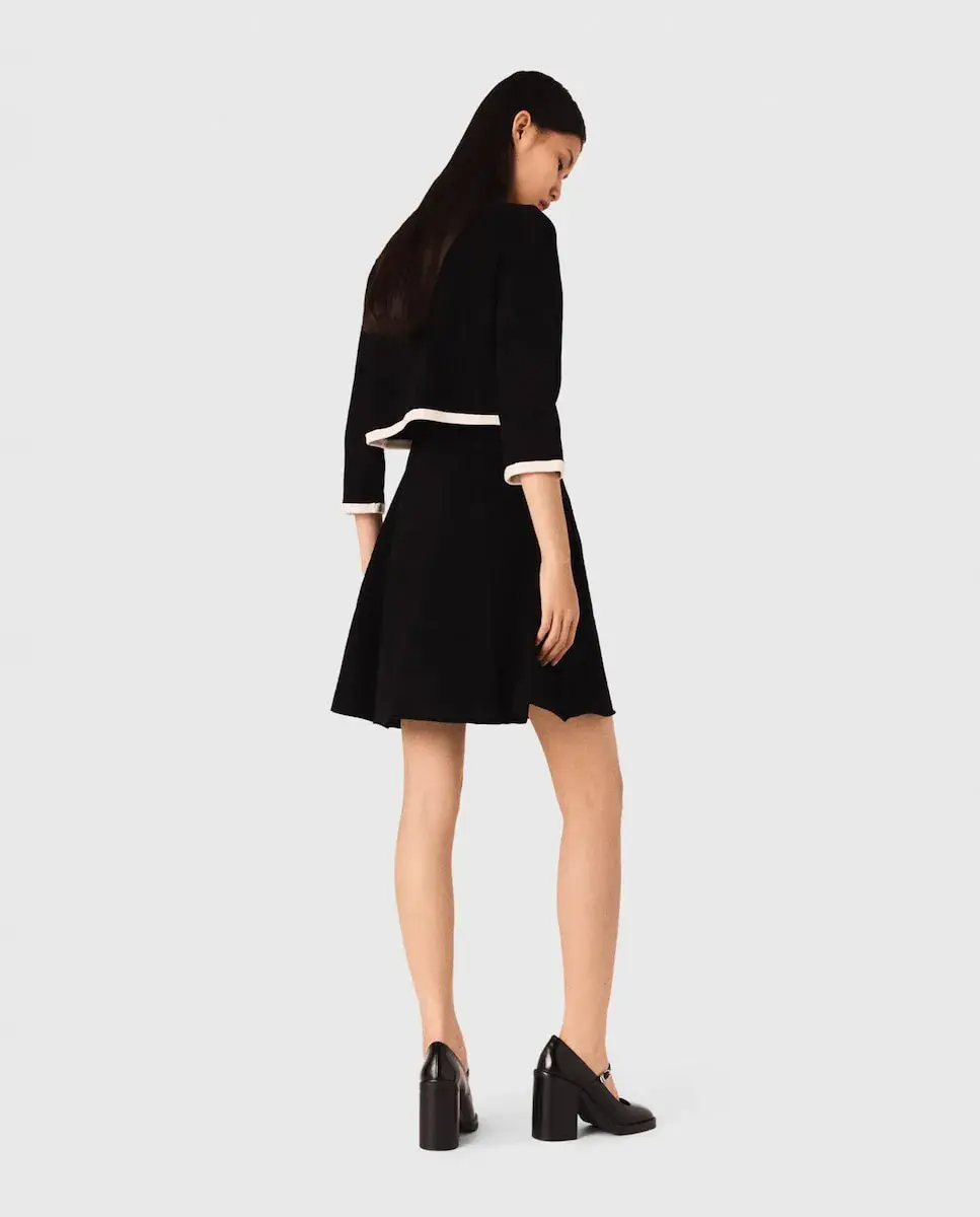 Платье 2 в 1 с интегрированным кардиганом. Эластичный трикотаж с эффектом бархата. Кардиган с круглым вырезом, рукав 3/4 и кнопки Clover. Расклешенная юбка с карманами. Игра текстур и наложений для создания цельного силуэта. Это платье 2 в 1 сочетает кардиган с контрастной отделкой и платье из двух материалов, объединяя эластичный трикотаж и бархатную юбку. Обновленный ретро-образ, готовый переосмыслить повседневный стиль.