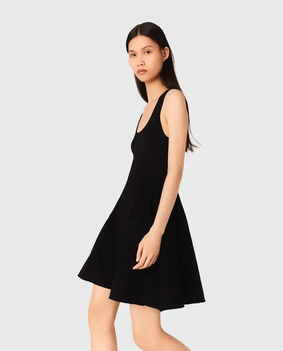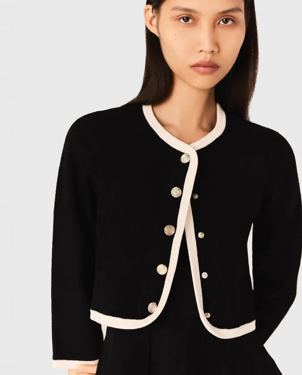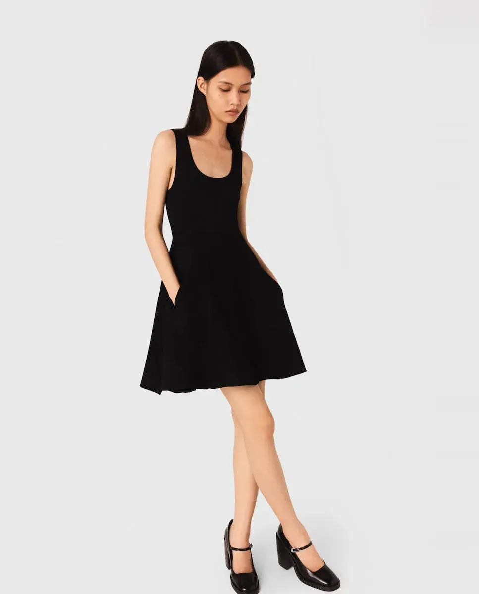 Платье 2 в 1 с интегрированным кардиганом. Эластичный трикотаж с эффектом бархата. Кардиган с круглым вырезом, рукав 3/4 и кнопки Clover. Расклешенная юбка с карманами. Игра текстур и наложений для создания цельного силуэта. Это платье 2 в 1 сочетает кардиган с контрастной отделкой и платье из двух материалов, объединяя эластичный трикотаж и бархатную юбку. Обновленный ретро-образ, готовый переосмыслить повседневный стиль.