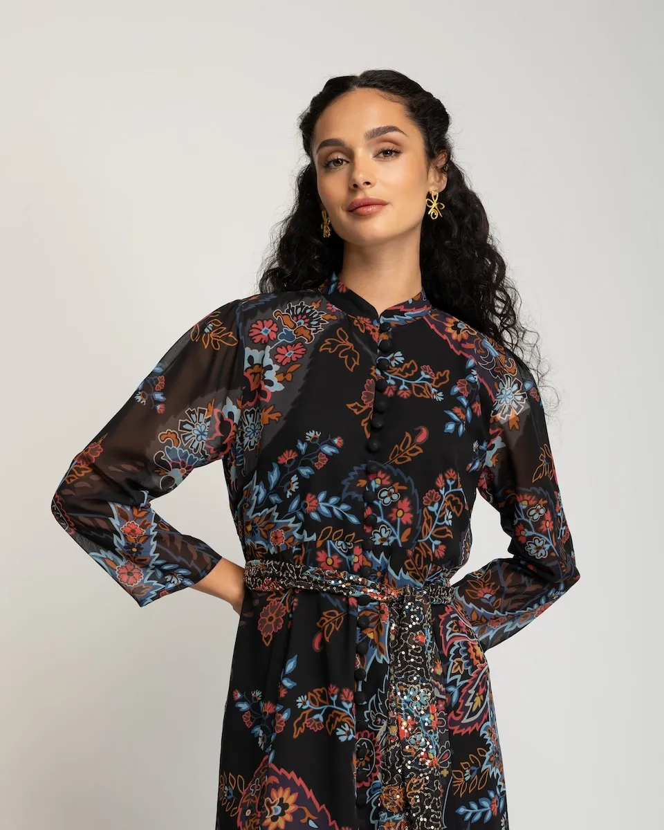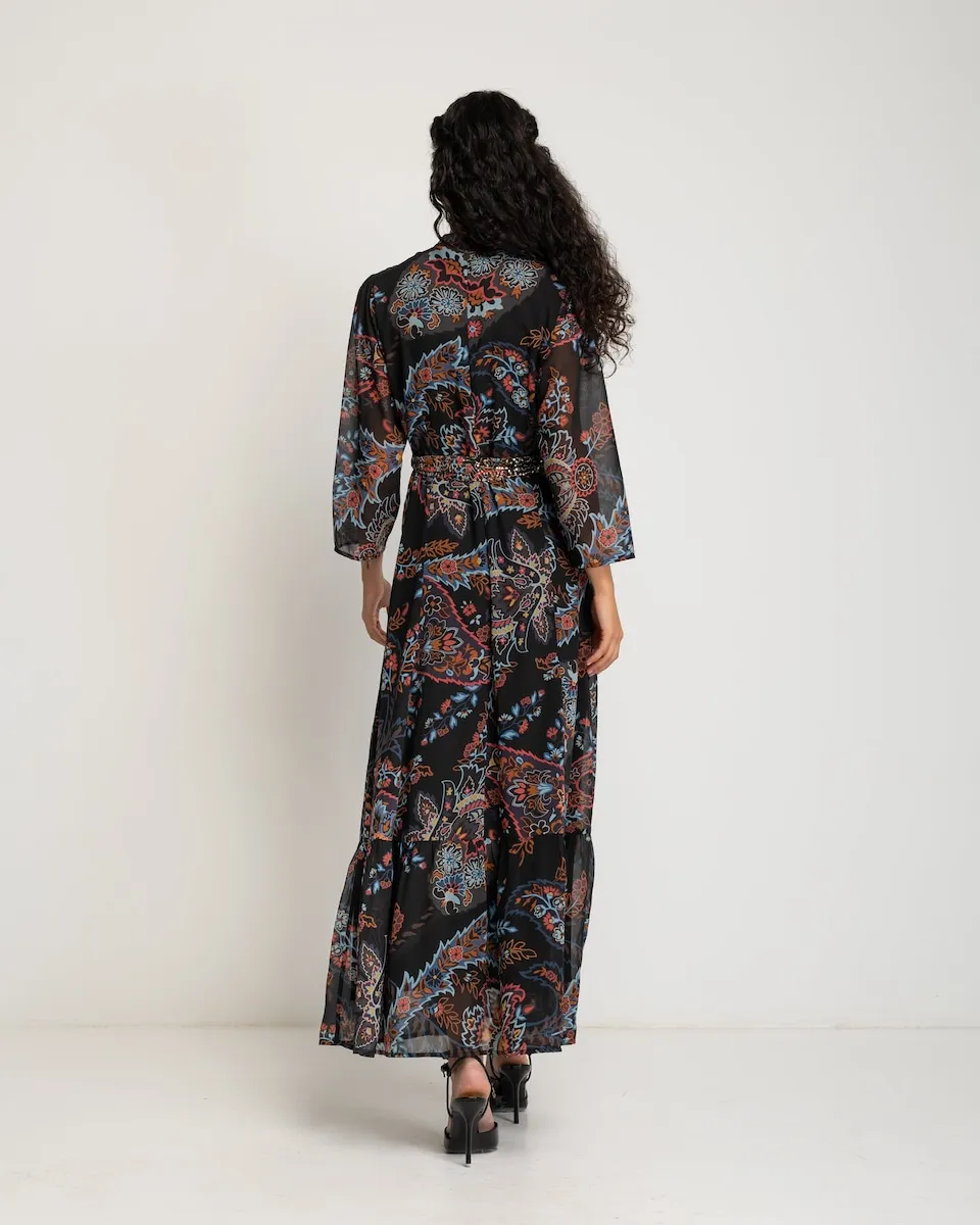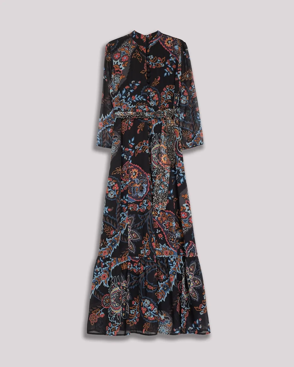 Это длинное платье покоряет своим цветочным принтом в насыщенных тонах на черном фоне, который придает глубину и характер. С прозрачными рукавами и оборкой внизу, оно идеально подходит для особых мероприятий или для того, чтобы добавить изысканности и оригинальности повседневным образам.