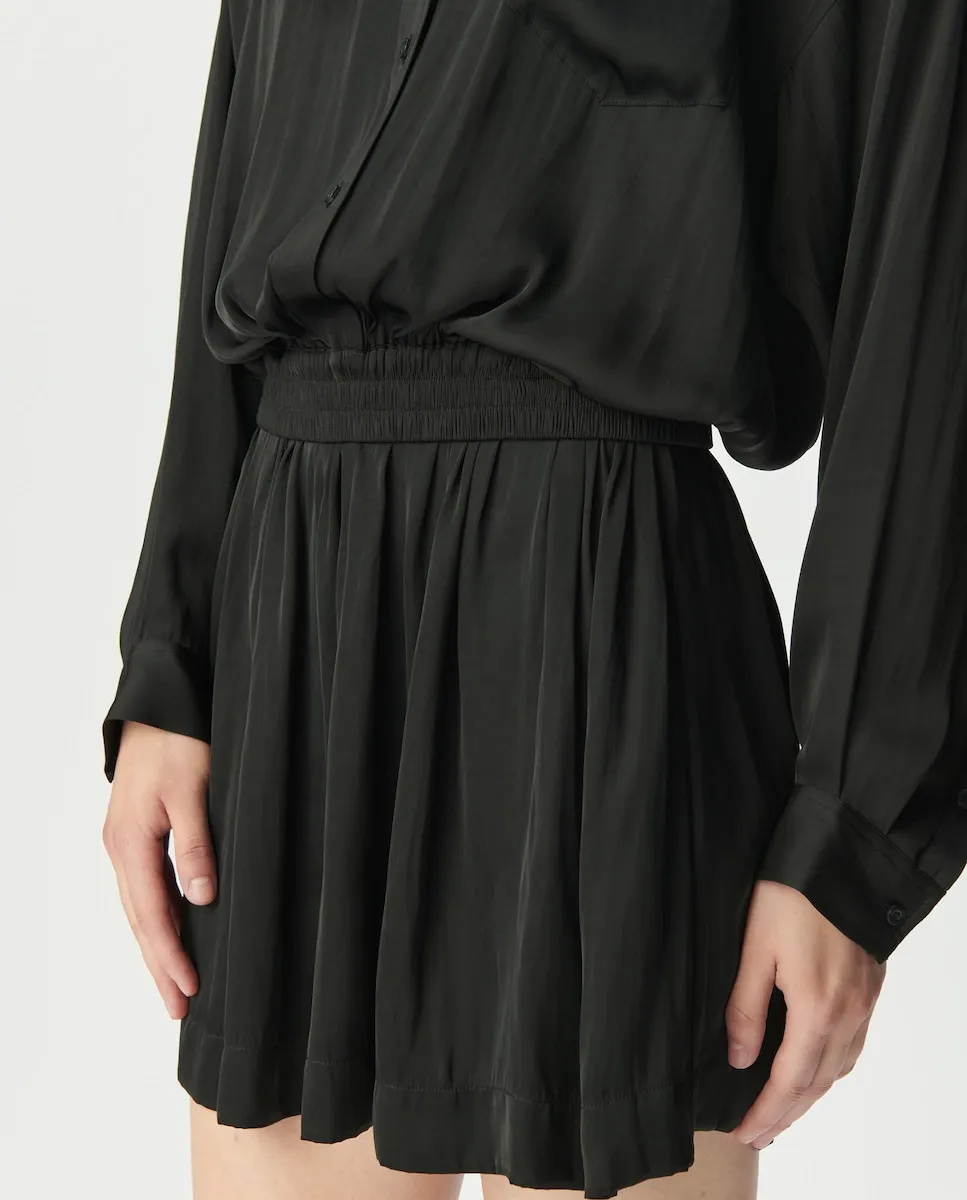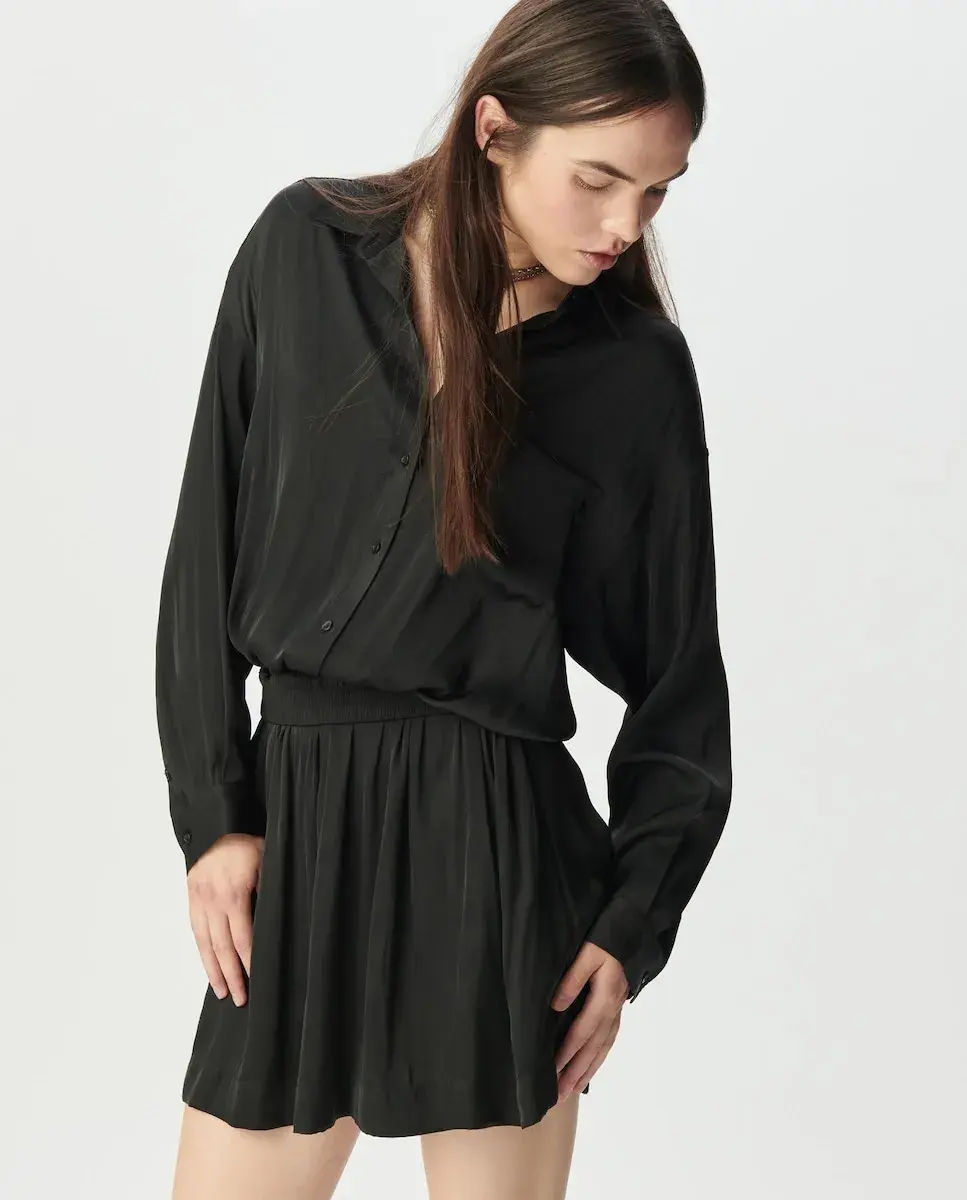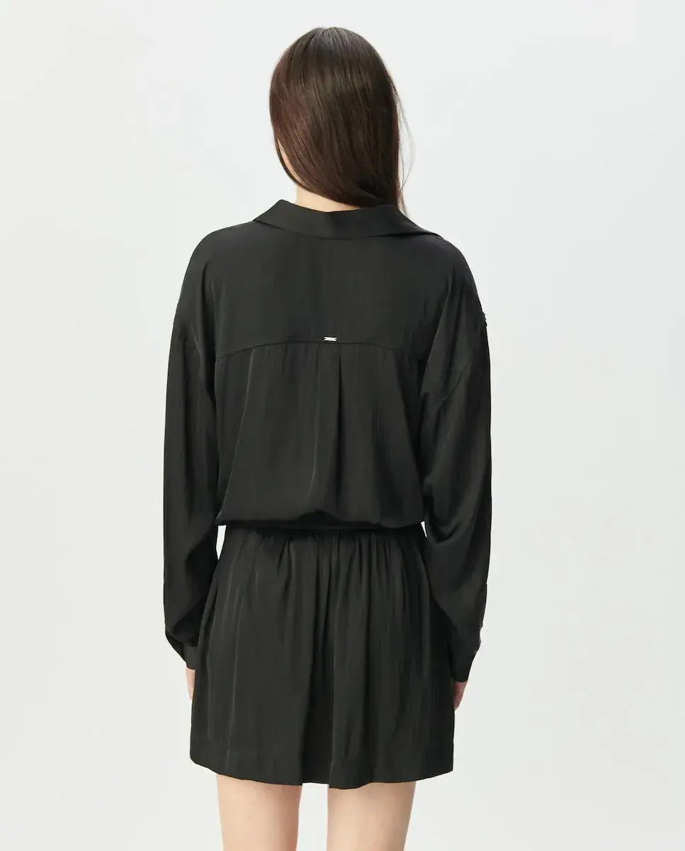 Платье-рубашка из полиэстерового сатина. Воротник-рубашка, длинные рукава с пуговицами, низ рукава спущен. Один накладной карман на груди. Эластичная талия, задний разрез с обманным эффектом. Боковые разрезы, застежка спереди на пуговицах. Расклешенный и свободный крой, короткое и асимметричное.
