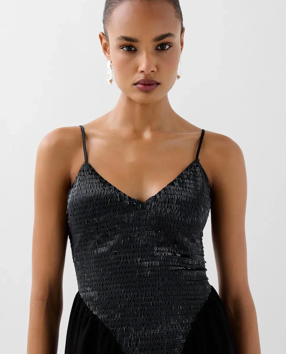 Платье выполнено из мягкой ткани с пайетками. Корсет с пайетками, V-образный вырез и тонкие регулируемые бретели. Юбка с легким колышением.