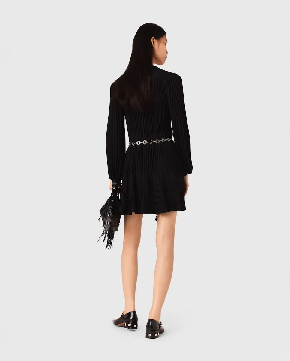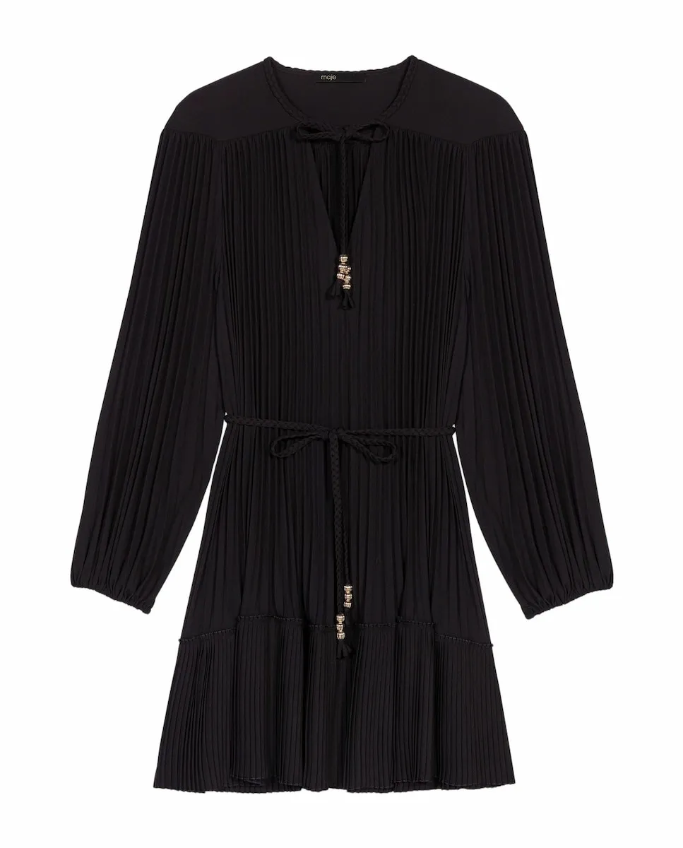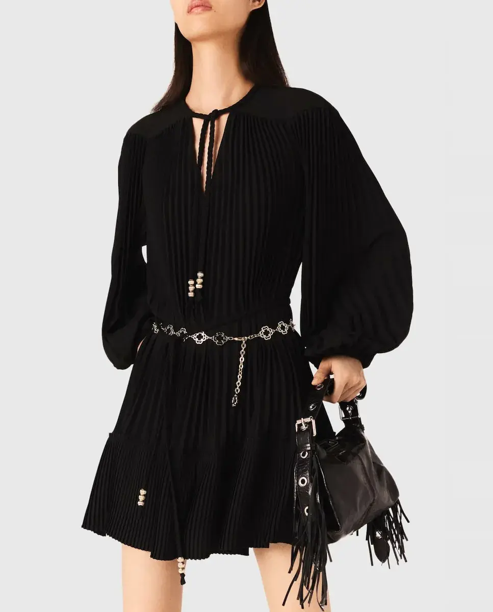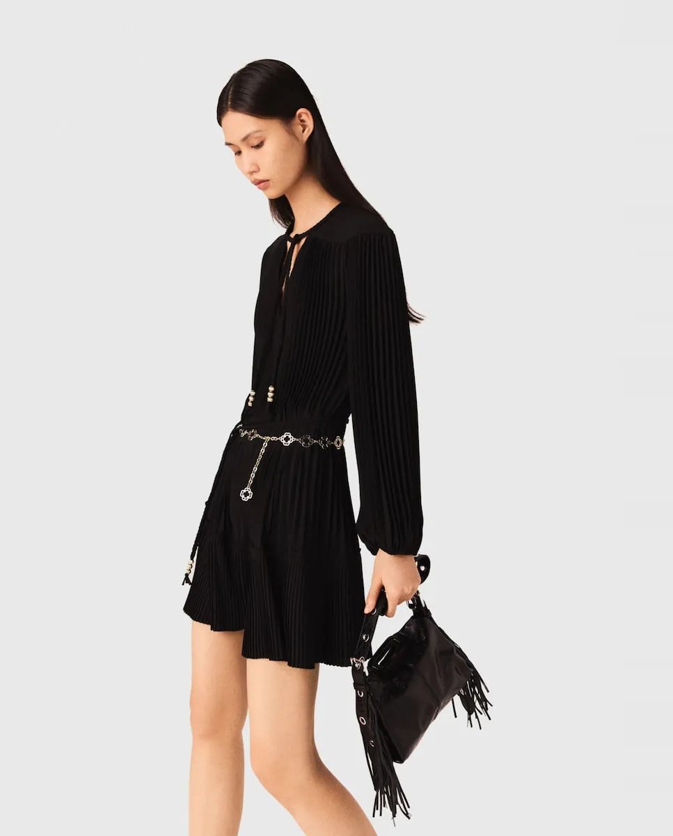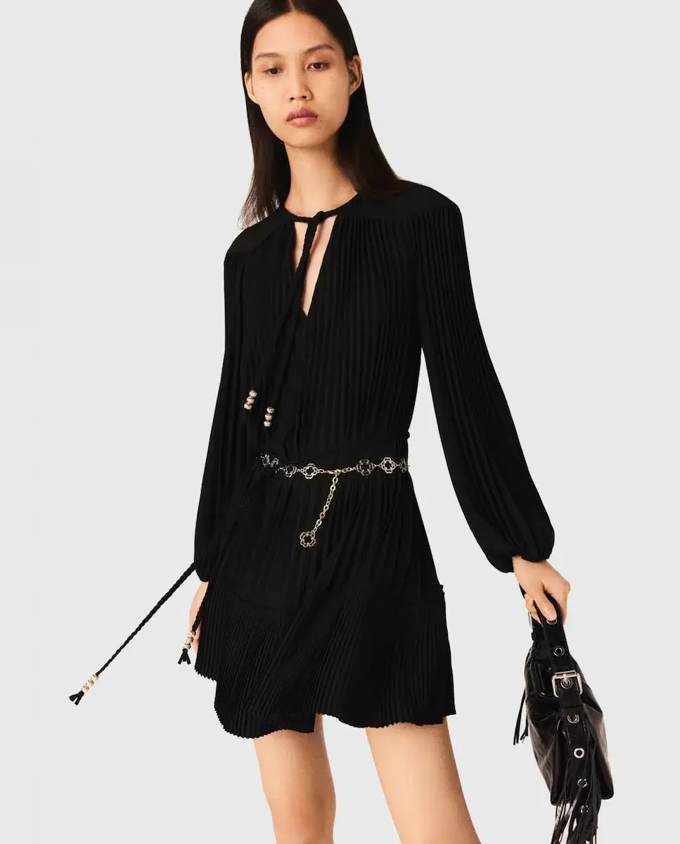 Короткое плавное плиссированное платье. V-образный вырез с переплетенными шнурками и золотыми жемчужинами. Съемный плетеный пояс с жемчугом. Новая коллекция Maje вдохновлена преппи-стилем, смело переосмысливая его коды. Легкое и деликатно текстурированное, это длинное платье с длинными рукавами и эластичными манжетами отвечает всем вашим желаниям. С его изысканными деталями - золотыми жемчужинами, переплетенными шнурками, съемным подходящим поясом и игрой складок в движении - оно легко сочетается с любым стилем. Можно носить как облегающее, так и свободно, в зависимости от настроения, дополняя яркими аксессуарами, такими как сумка с бахромой и туфли с жемчугом.