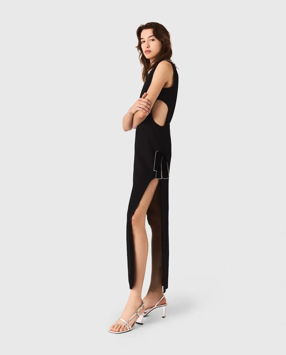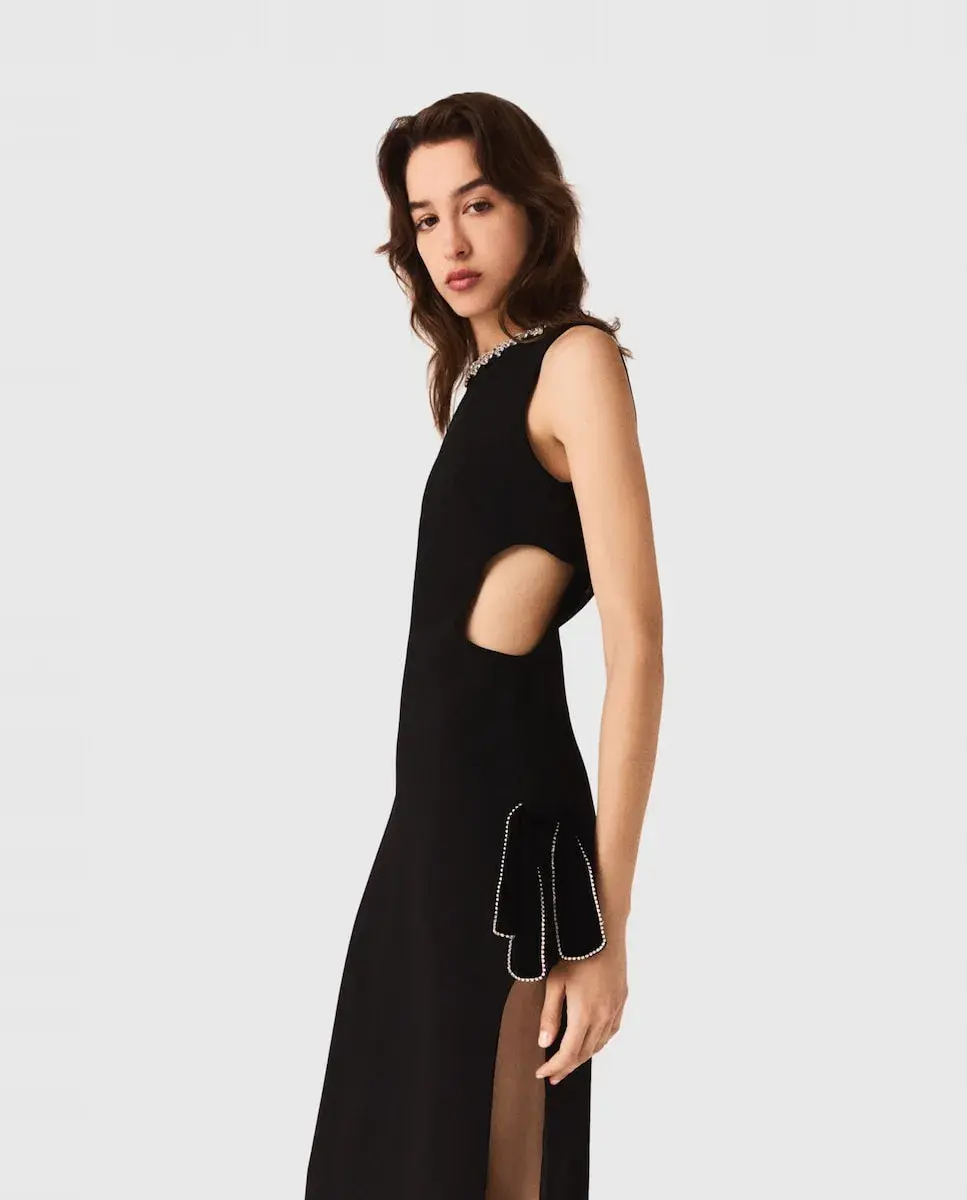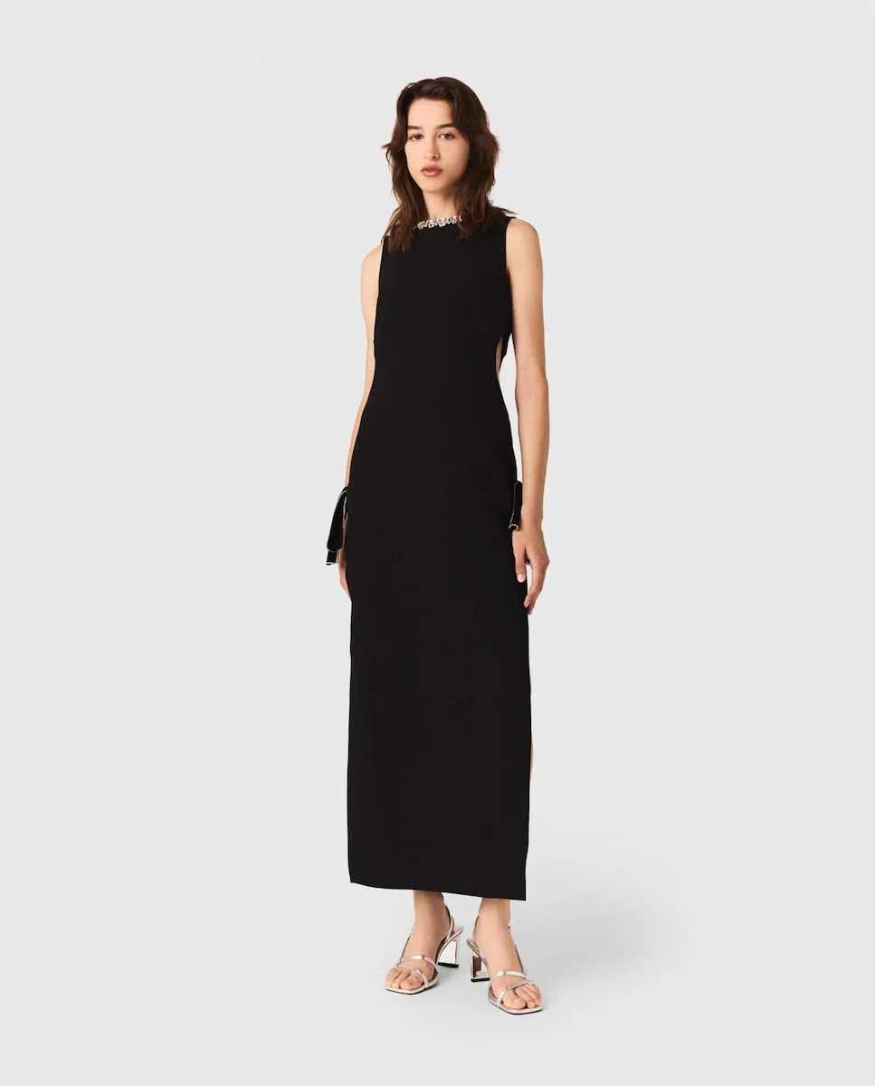 Длинное безрукавное платье с вырезами. Круглый вырез-«жемчужина». Структурированный бант с деталями из страз. Застежка-молния на спине. Maje исследует смелую женственность через скульптурные изделия, где детали-«драгоценности» подчеркивают силуэт. Стиль высокой моды и графичный силуэт для этого длинного безрукавного платья. Вырезы по бокам подчеркивают талию, тогда как два высоких разреза удлиняют движение ног. Два структурированных банта, украшенные стразами, подчеркивают талию, а «жемчужный» вырез придает изысканный штрих. Застежка-молния на спине обеспечивает безупречный силуэт и идеальную посадку. Сочетайте с каблуками для элегантного и современного вечернего образа.