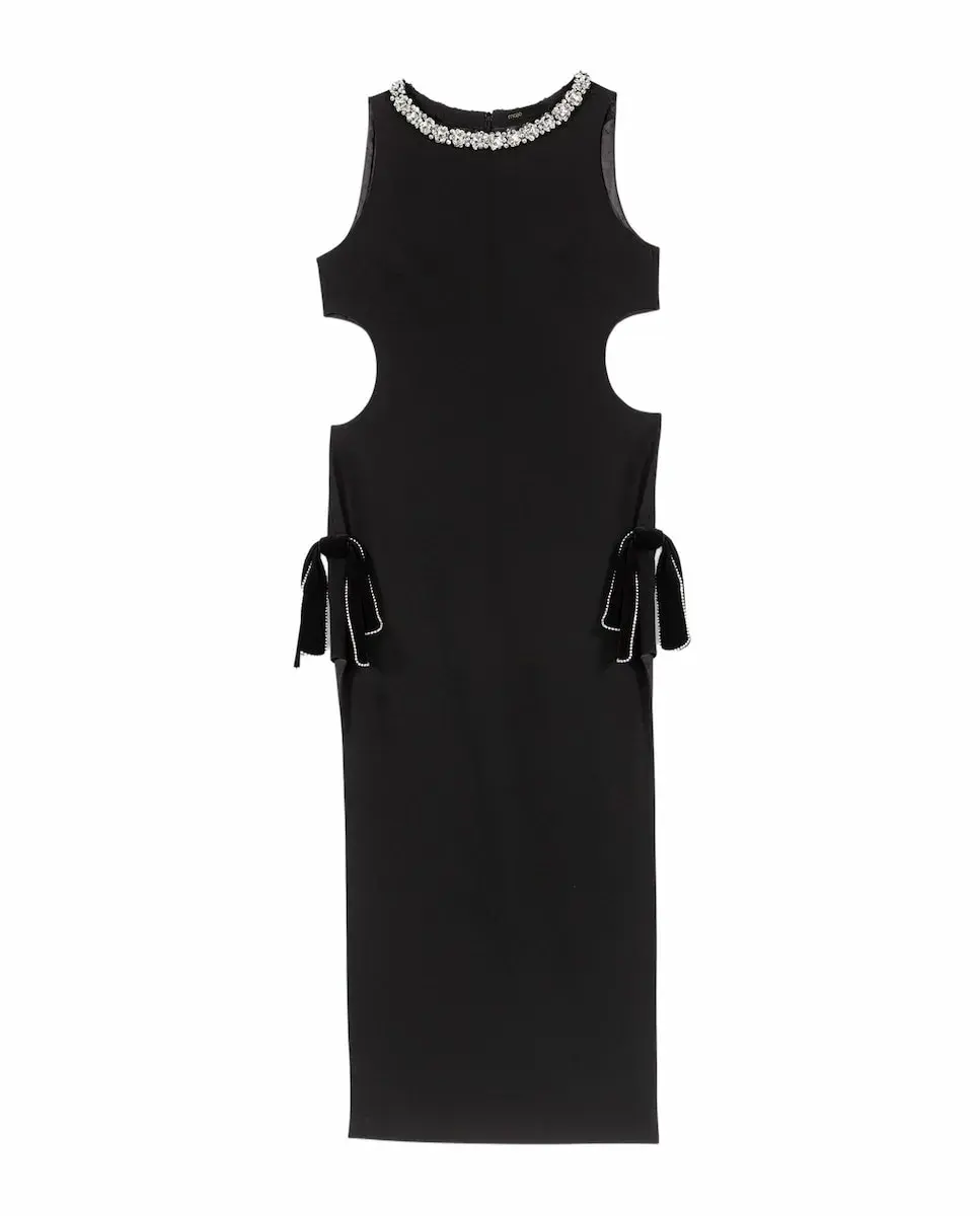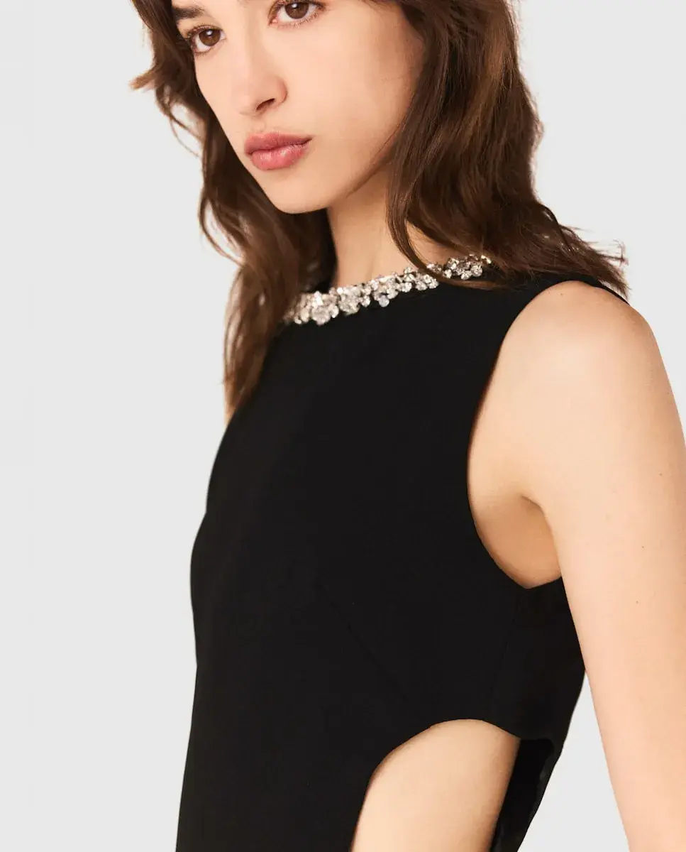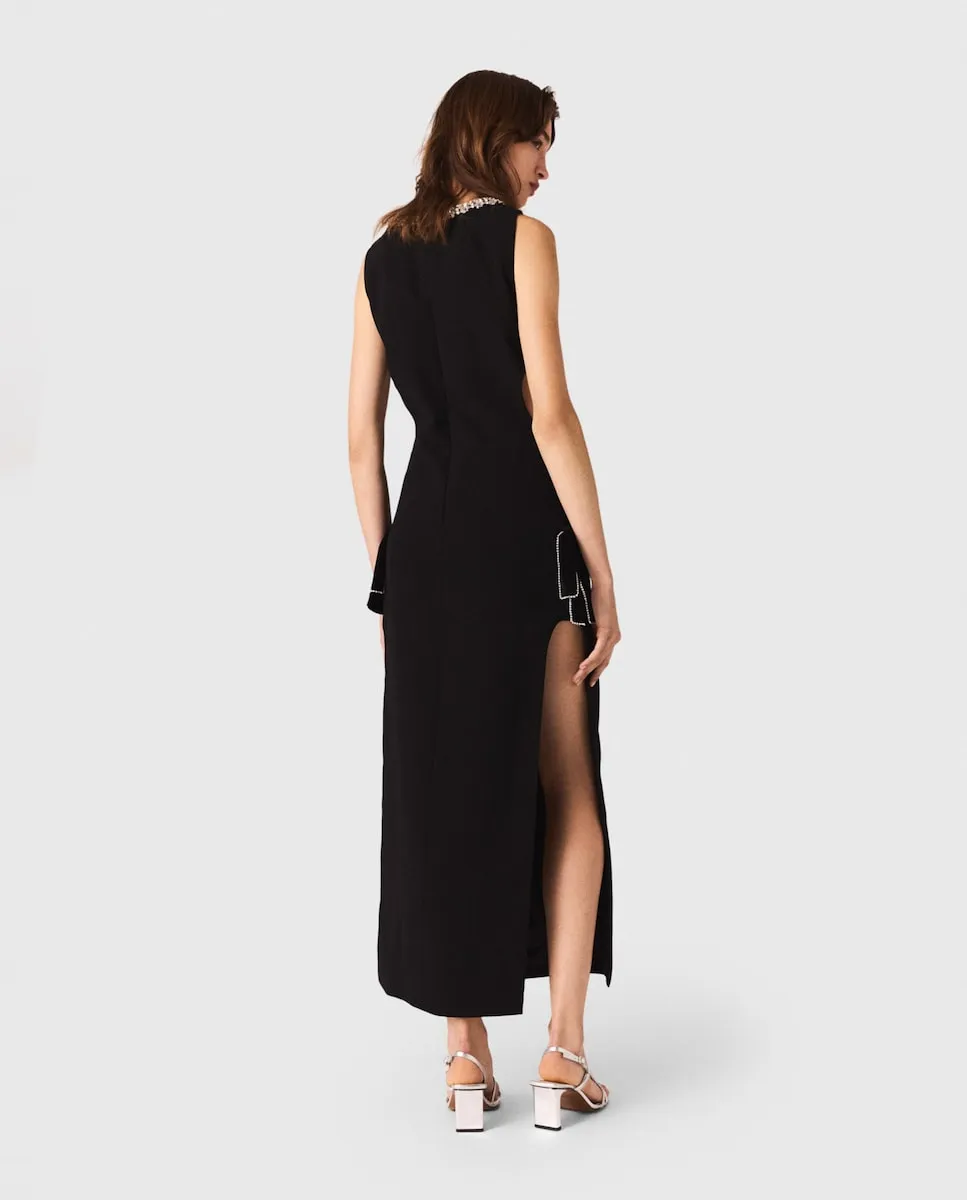 Длинное безрукавное платье с вырезами. Круглый вырез-«жемчужина». Структурированный бант с деталями из страз. Застежка-молния на спине. Maje исследует смелую женственность через скульптурные изделия, где детали-«драгоценности» подчеркивают силуэт. Стиль высокой моды и графичный силуэт для этого длинного безрукавного платья. Вырезы по бокам подчеркивают талию, тогда как два высоких разреза удлиняют движение ног. Два структурированных банта, украшенные стразами, подчеркивают талию, а «жемчужный» вырез придает изысканный штрих. Застежка-молния на спине обеспечивает безупречный силуэт и идеальную посадку. Сочетайте с каблуками для элегантного и современного вечернего образа.