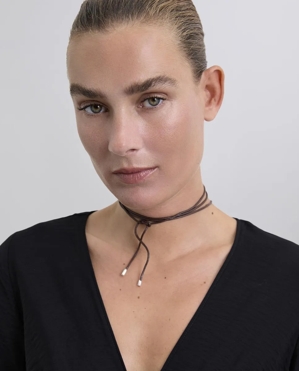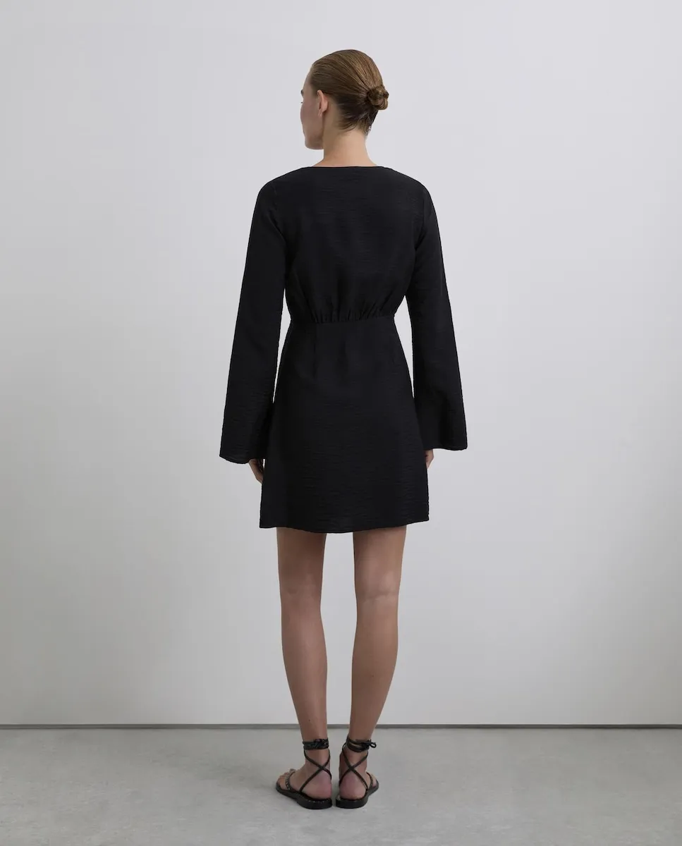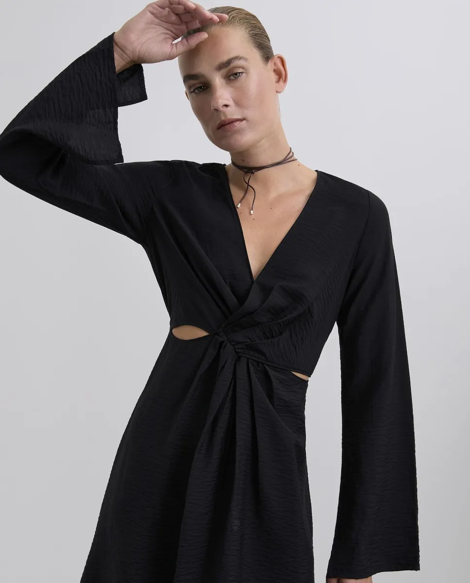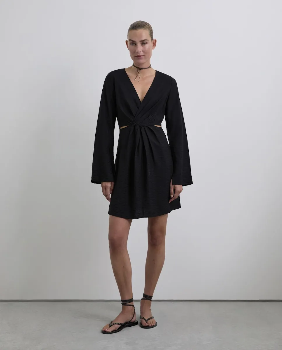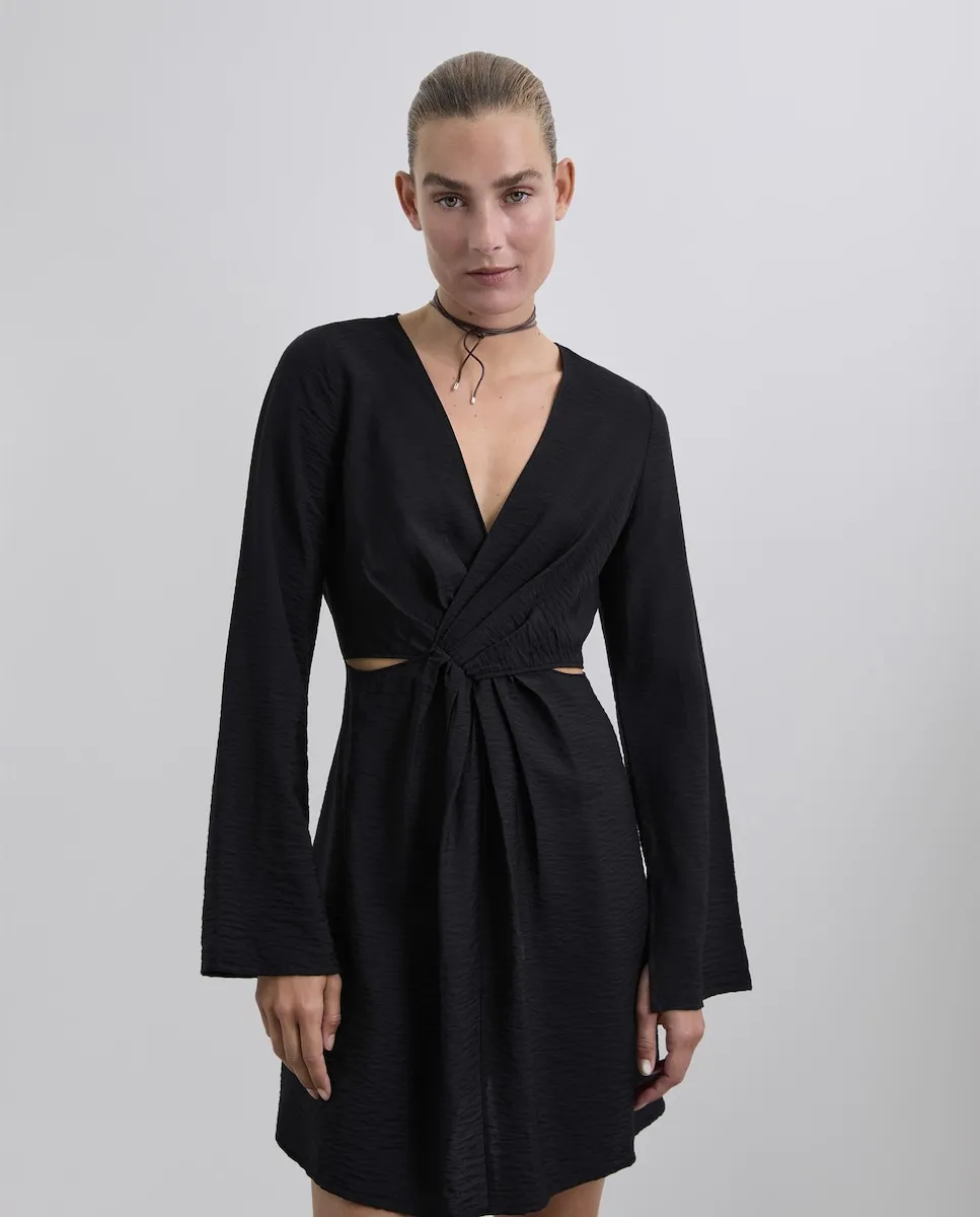 Мини-платье из легкой слегка эластичной ткани. Свободный крой, V-образный перекрещенный вырез и длинные рукава с узлом на талии.
